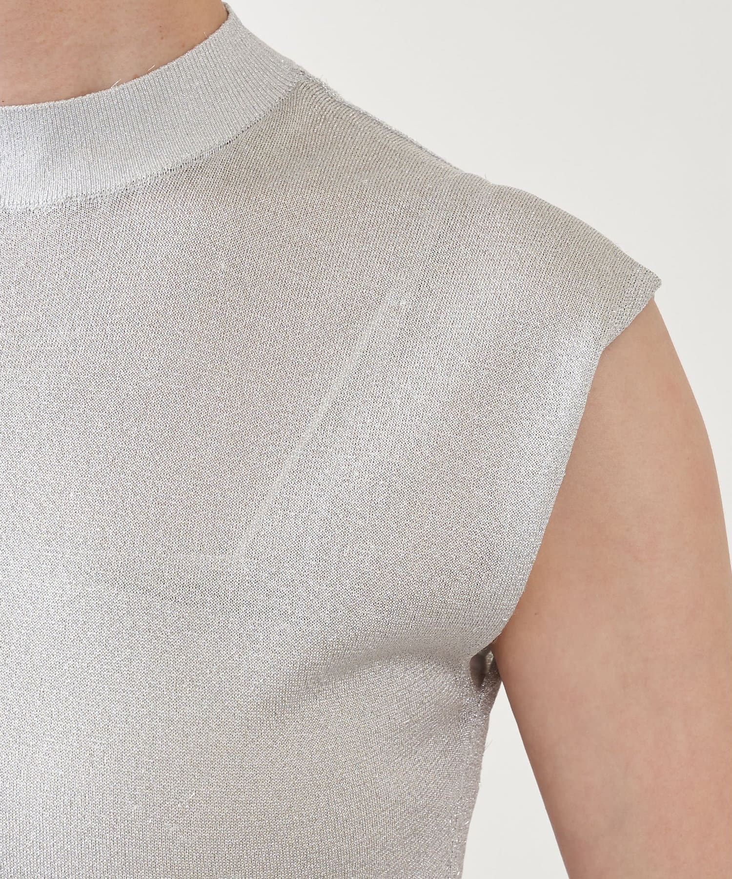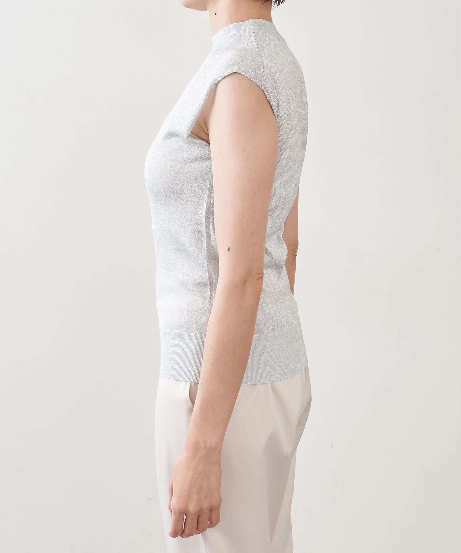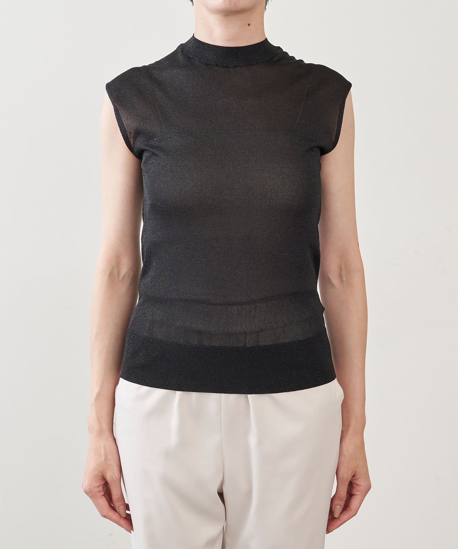 ■繊細なラメ糸で仕立てた薄手のニットノースリーブトップス。