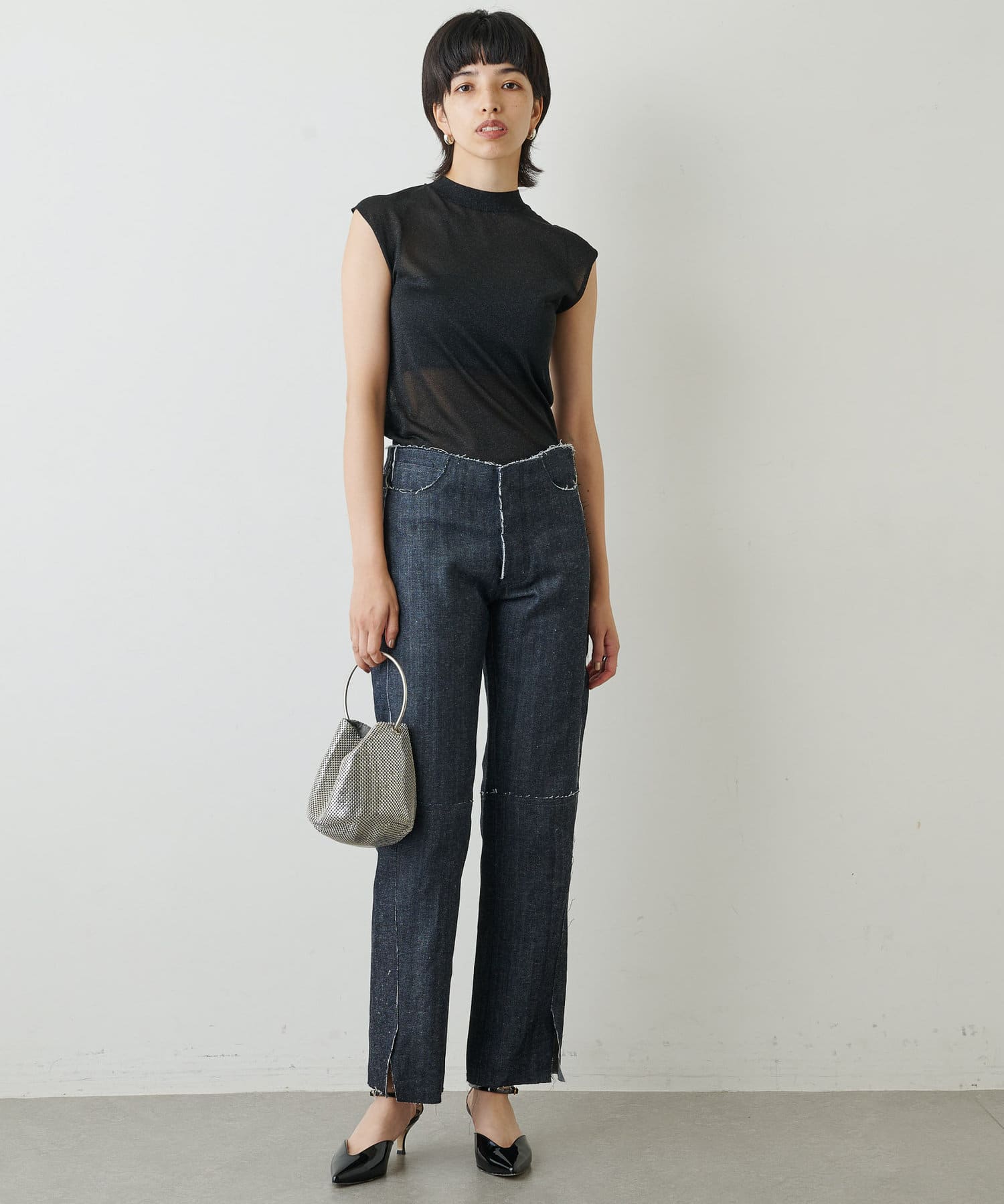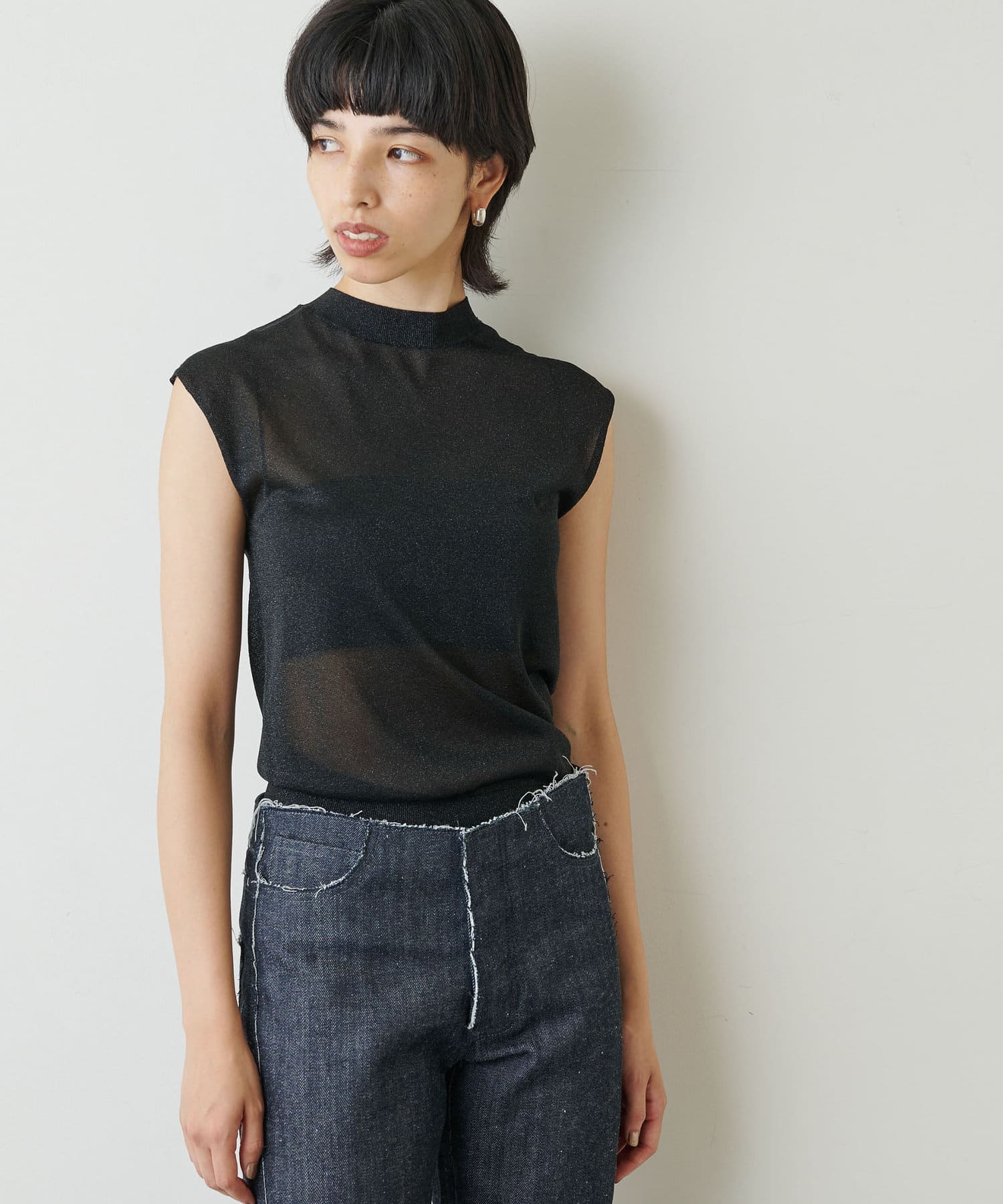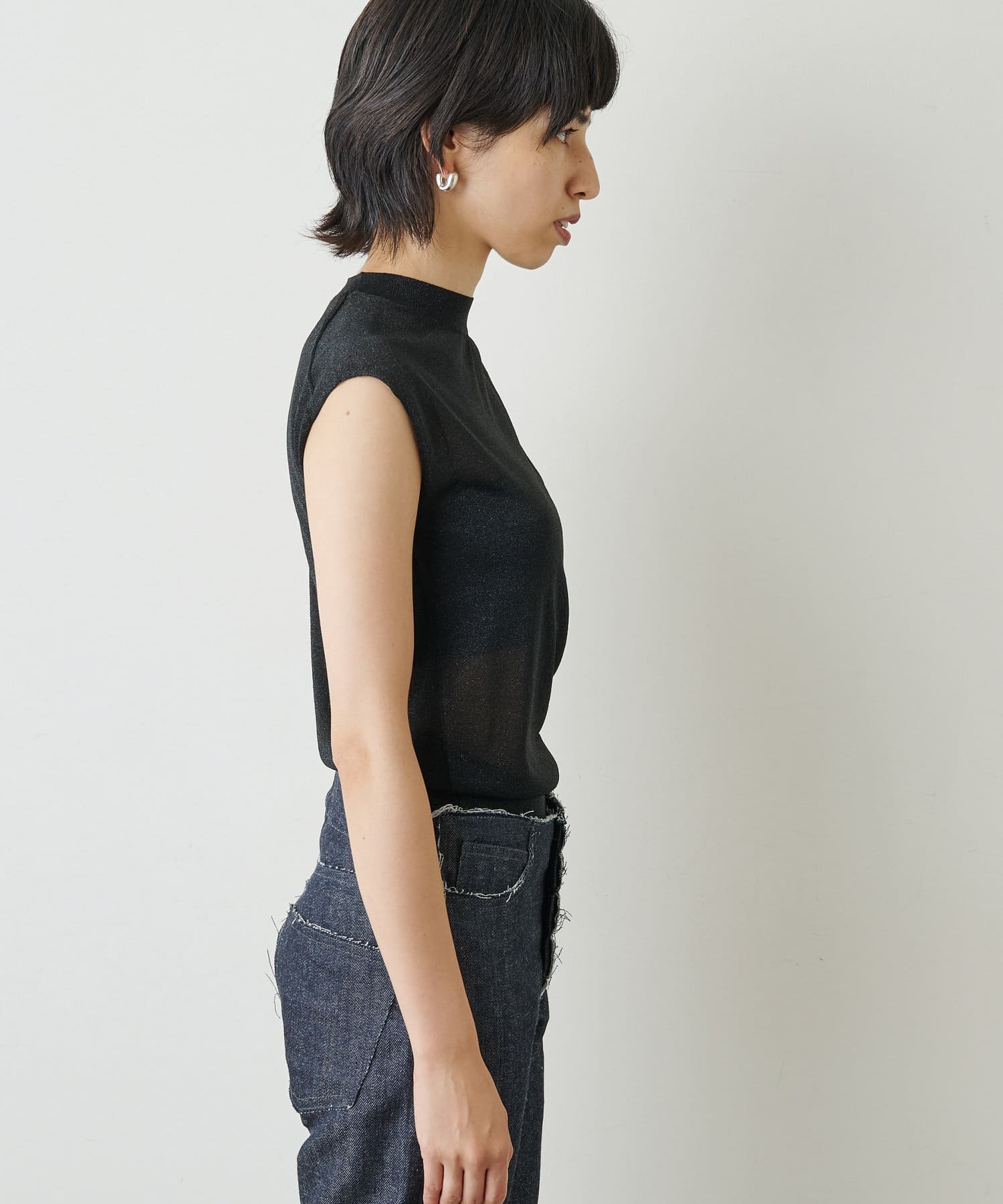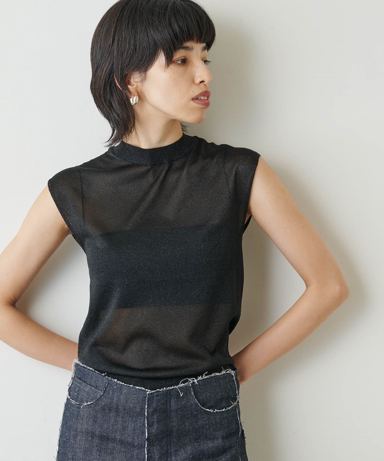 ■繊細なラメ糸で仕立てた薄手のニットノースリーブトップス。