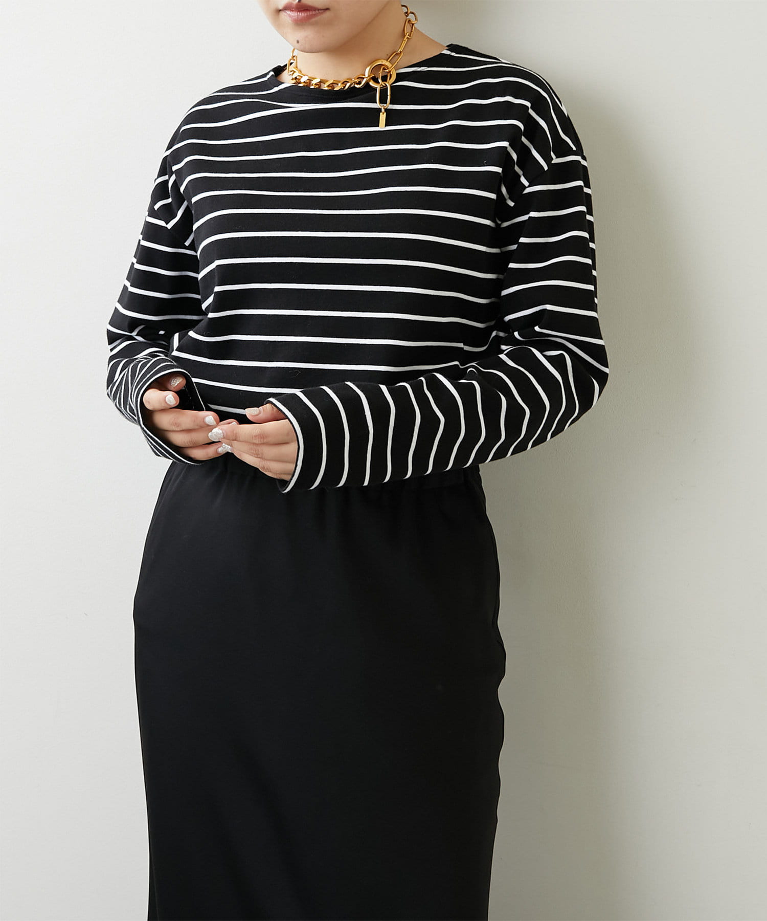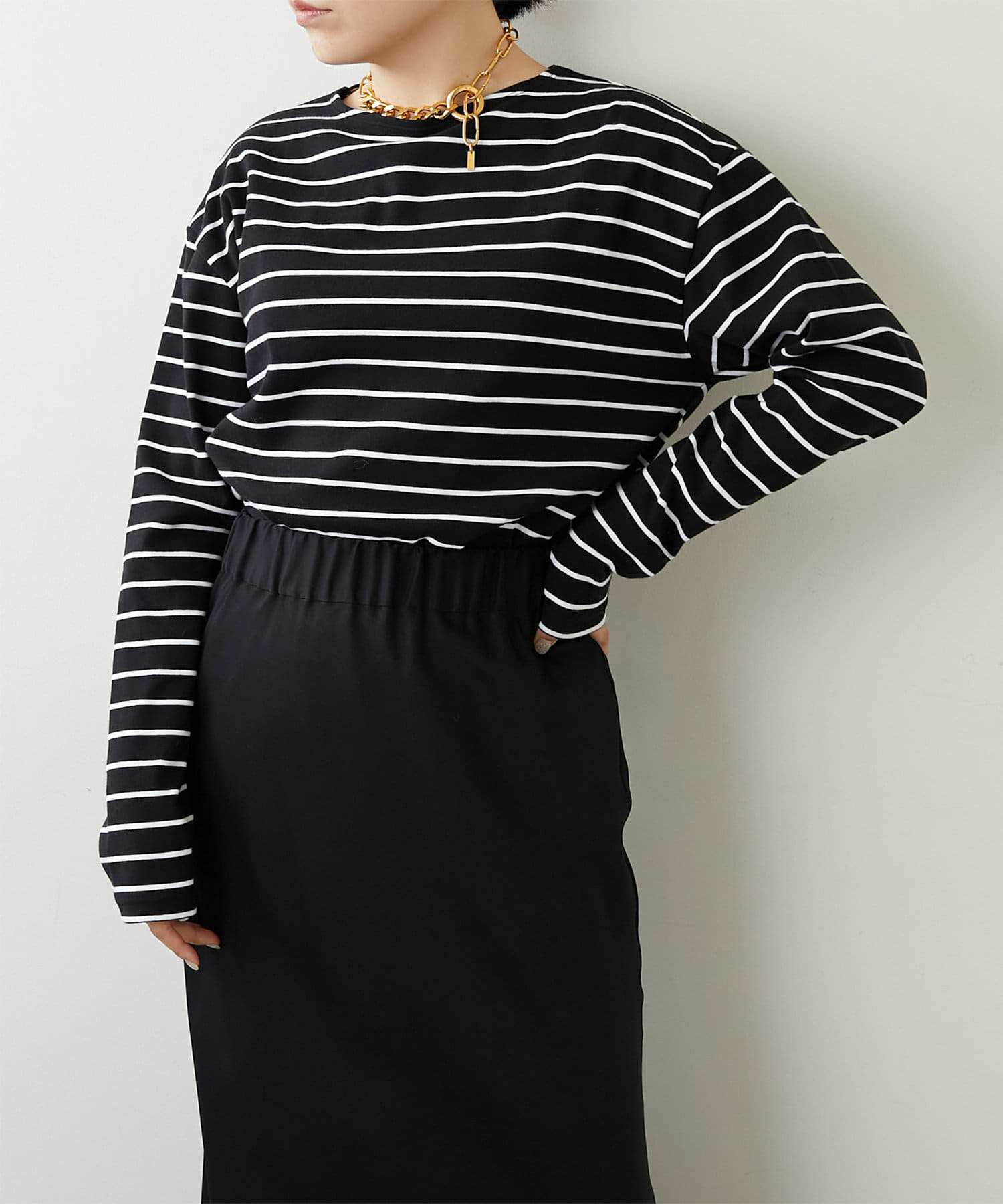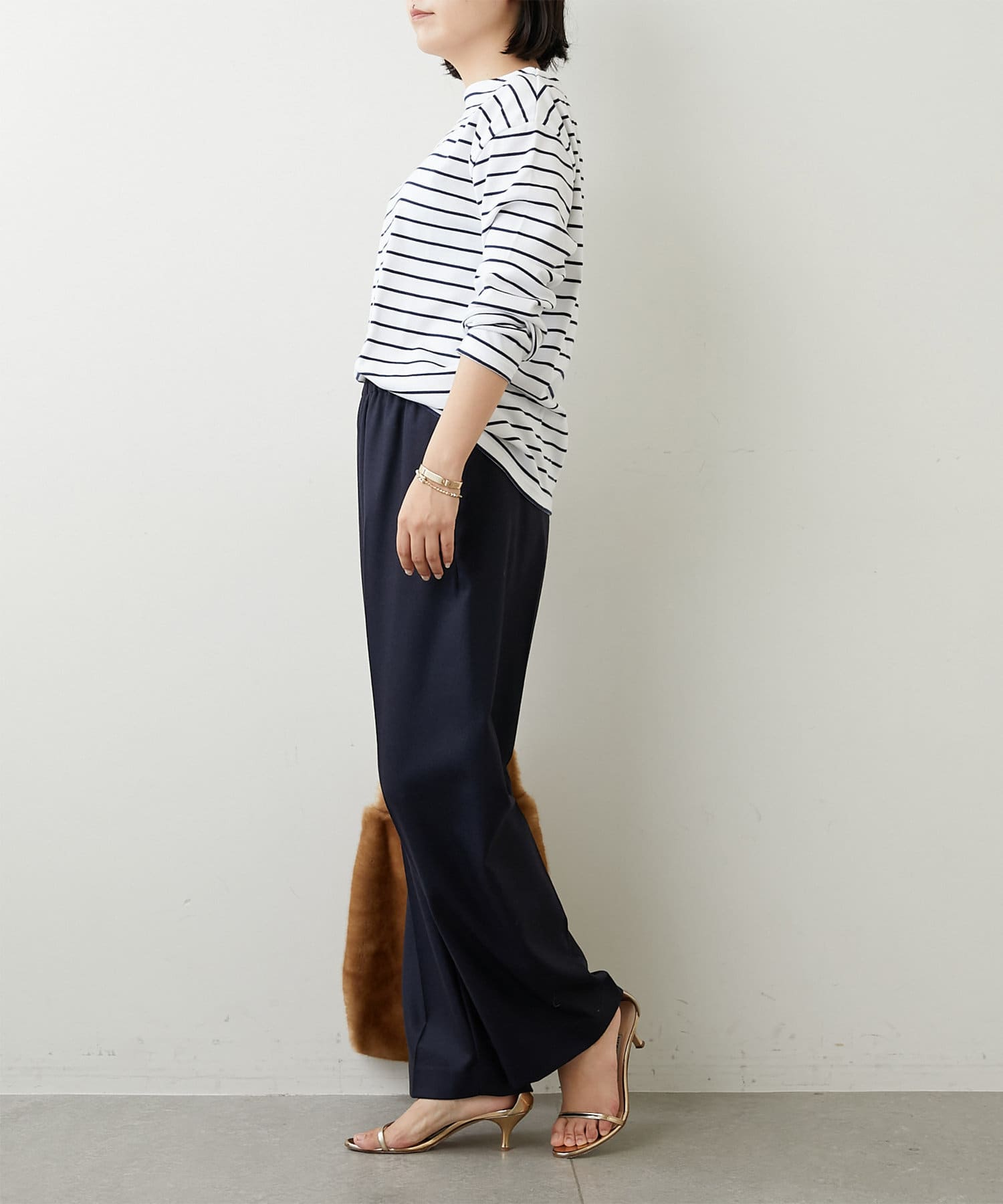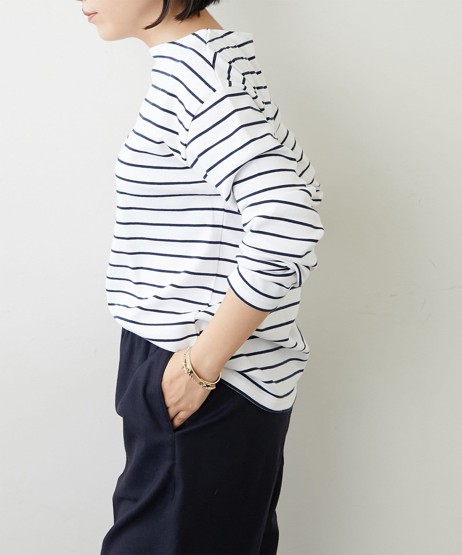 ■首元の広がりを抑えつつ、やや横に開いた控えめなボートネックが上品な印象。