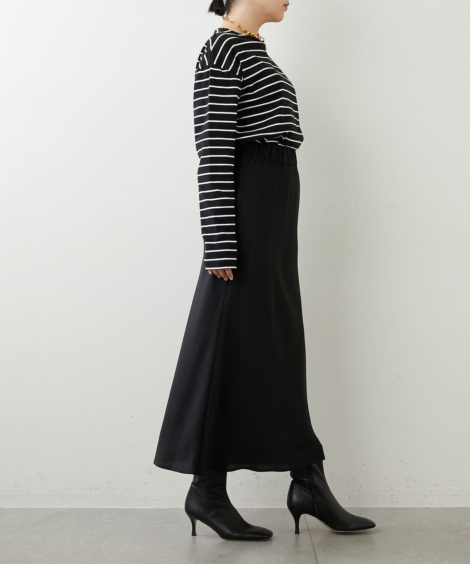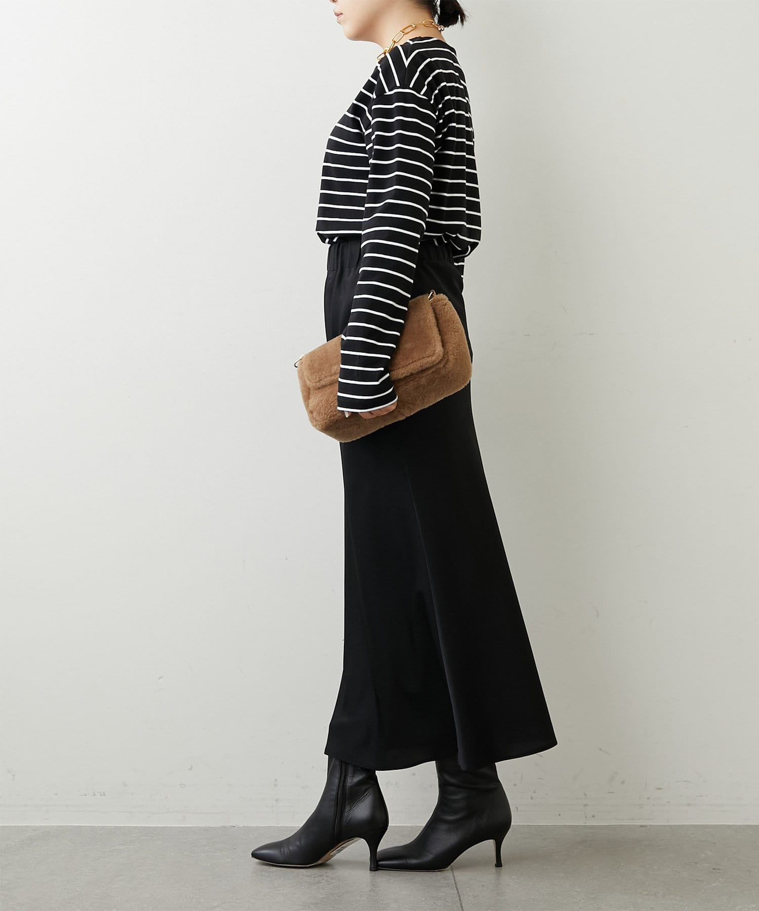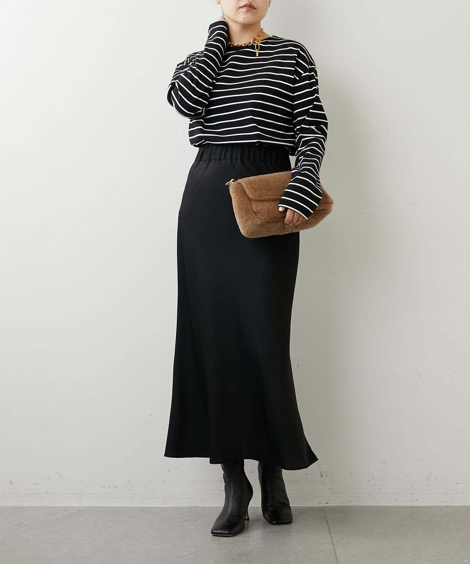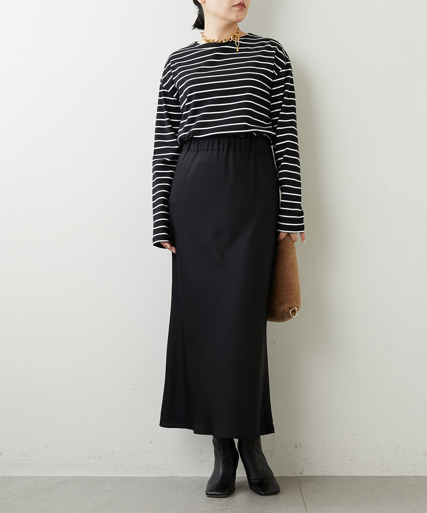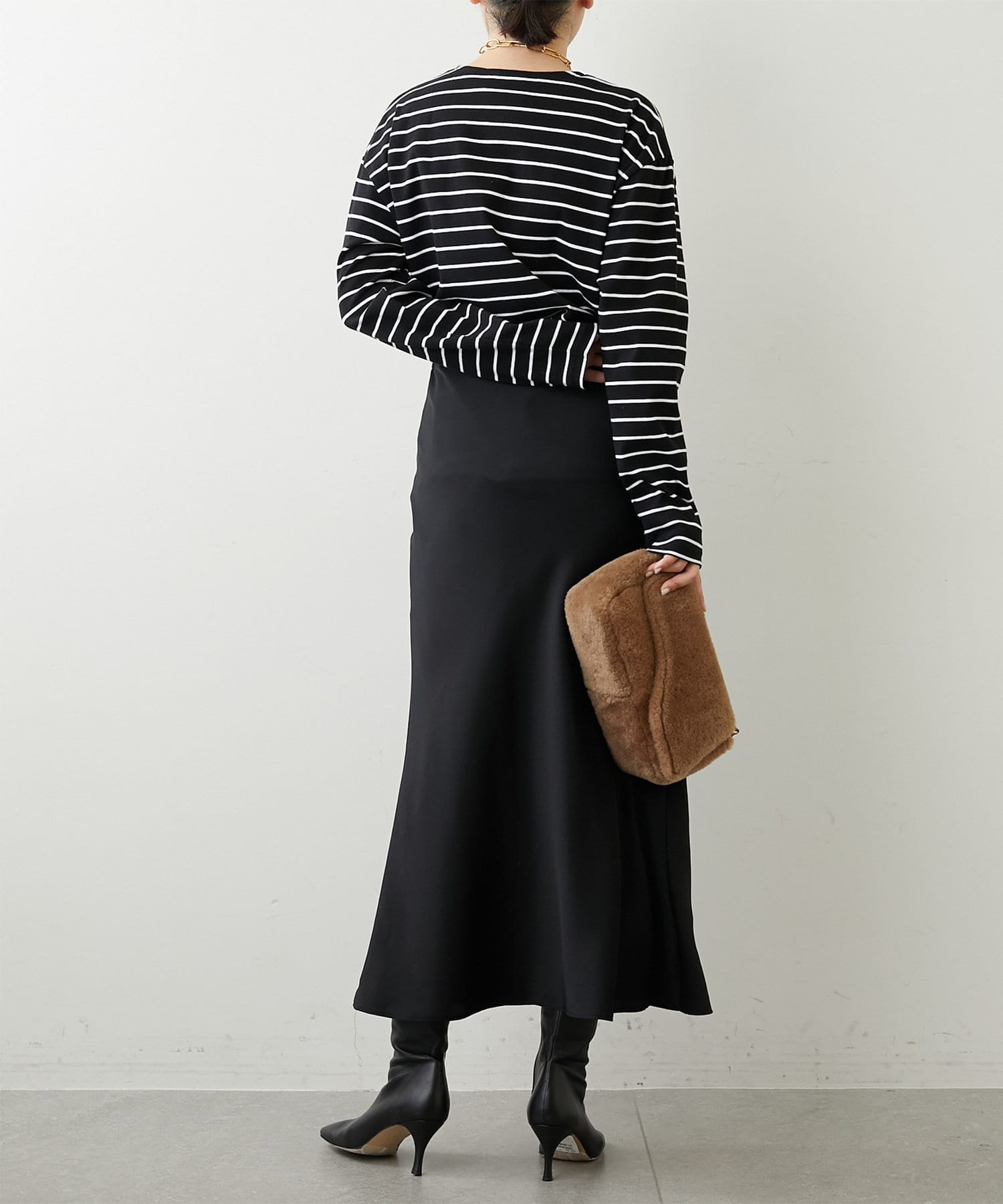 ■首元の広がりを抑えつつ、やや横に開いた控えめなボートネックが上品な印象。