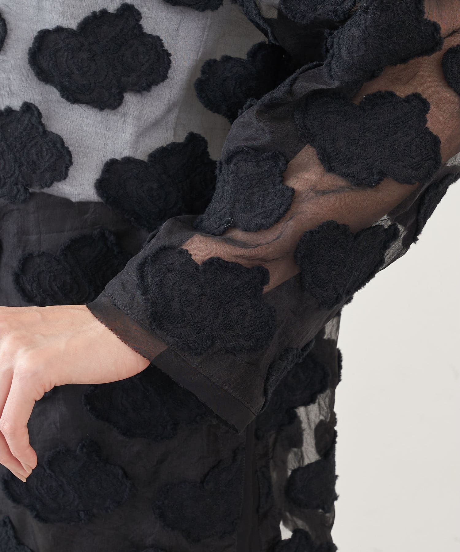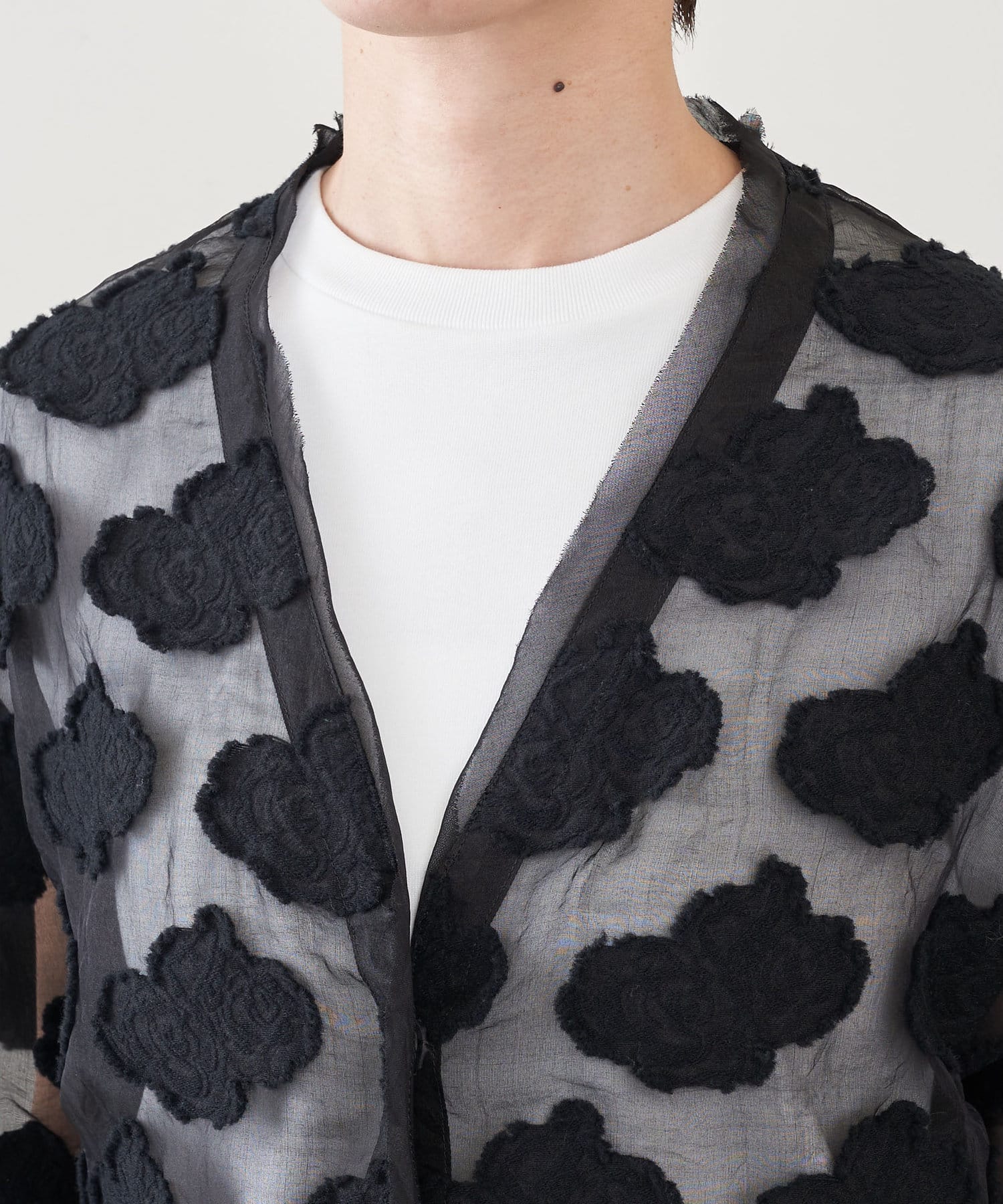 オーガンジーシルクの繊細な糸をベースに、ウール糸の太番で花のカットジャガードをした素材。