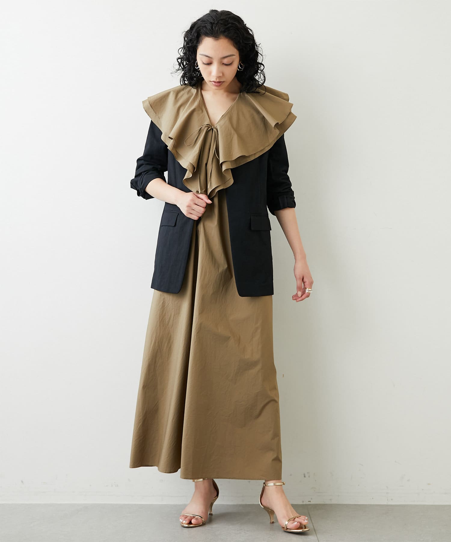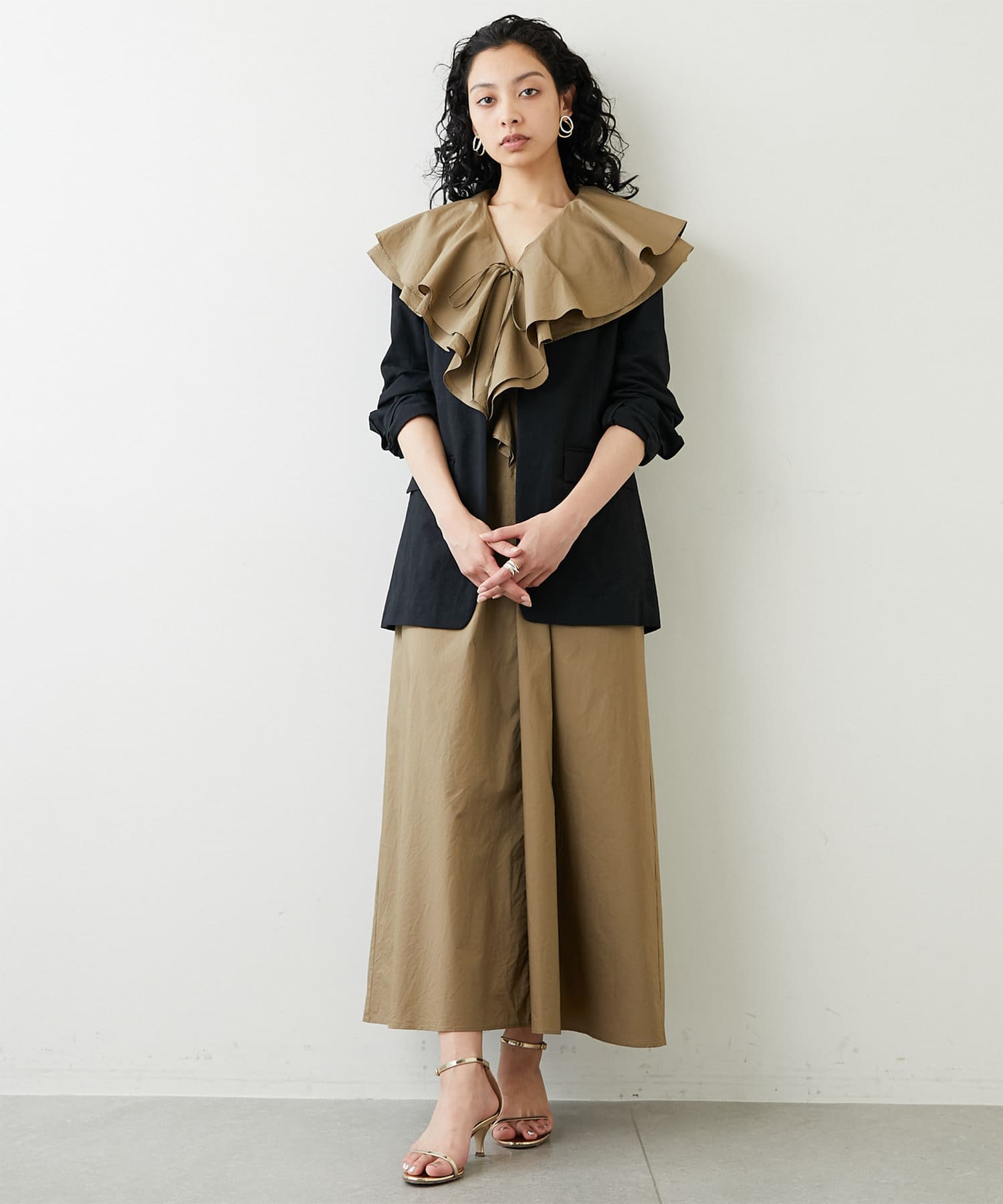 ■首元をきれいに見せるやや立ち襟のデザインに、程よくシェイプさせたウエストが女性らしく美しいシルエットを演出。