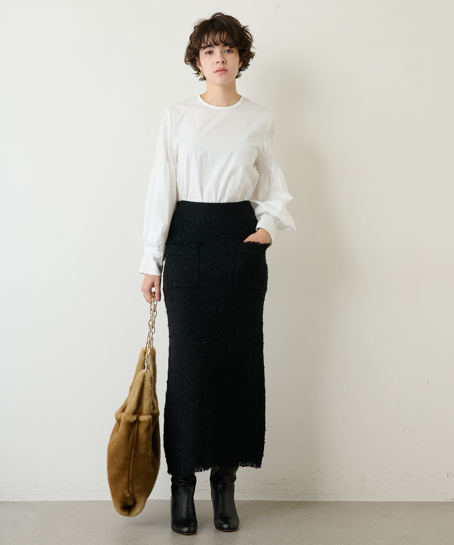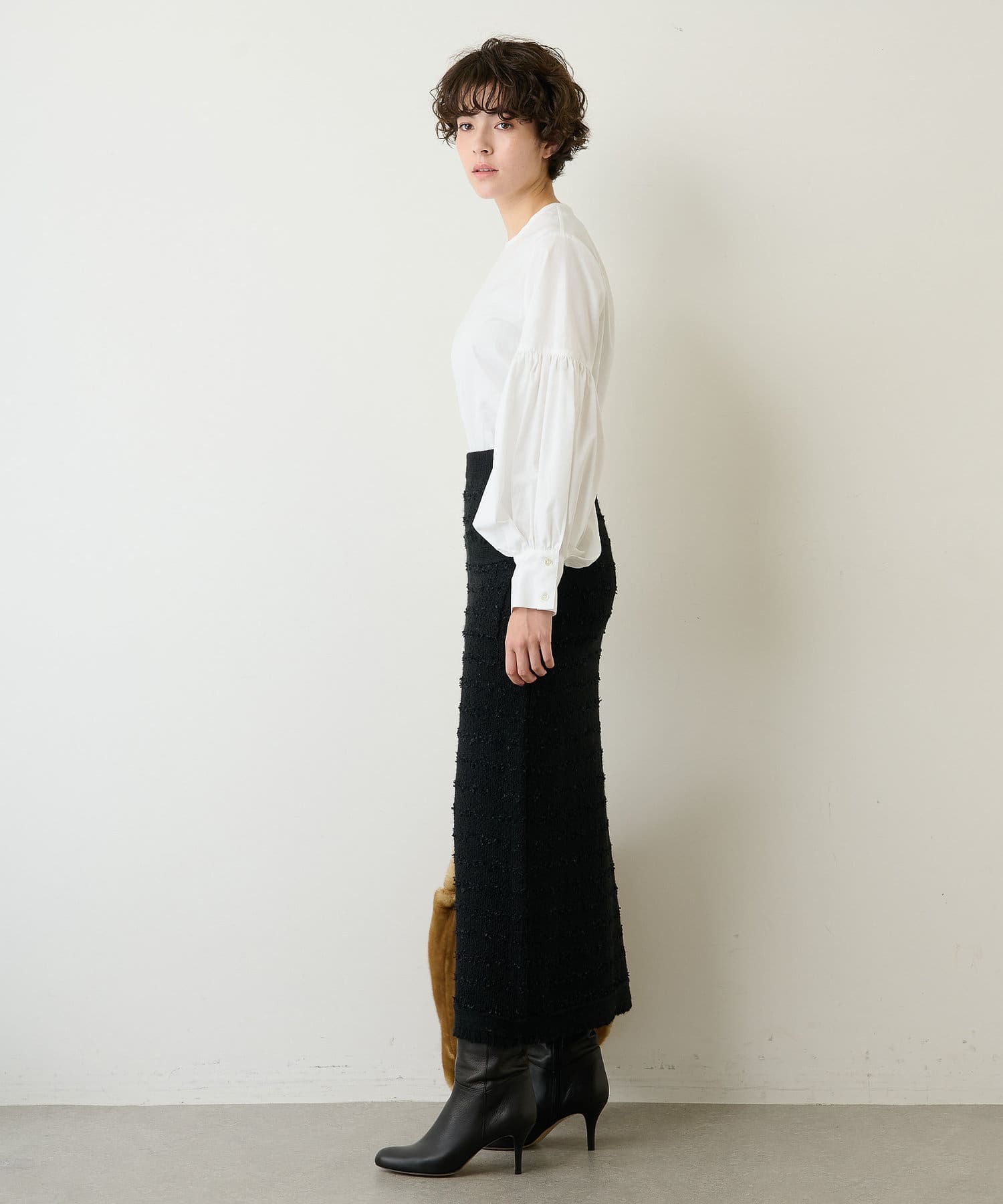 ■袖のデザインが際立つシンプルな身頃デザインはボトムを選びにくく、様々なスタイリングを楽しめる一着。