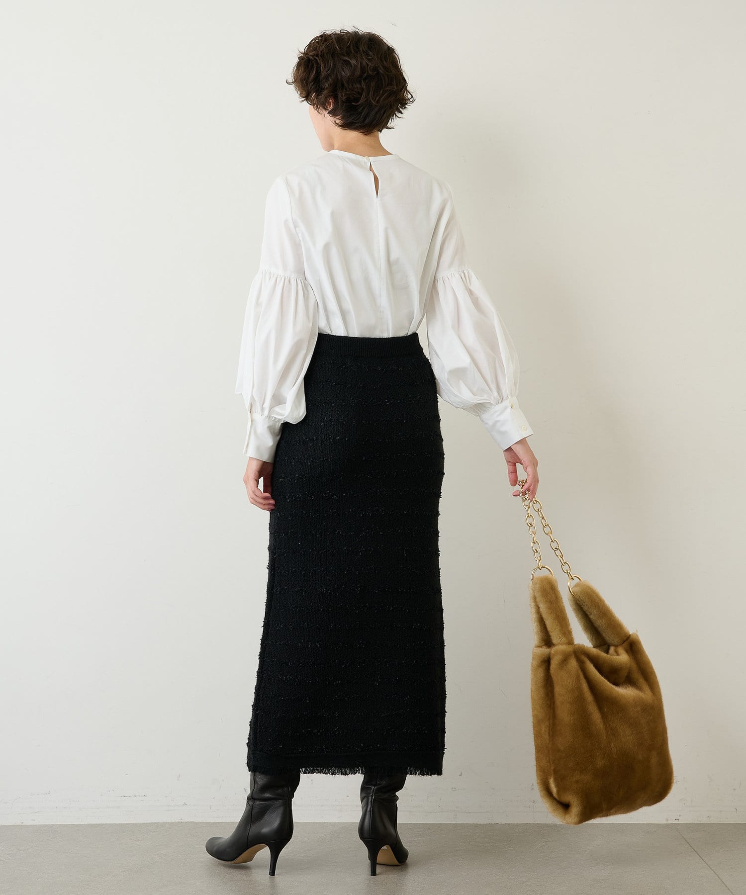■絶妙な袖の切り替え位置が甘くなりすぎるのを抑え、肩回りを華奢に演出。
