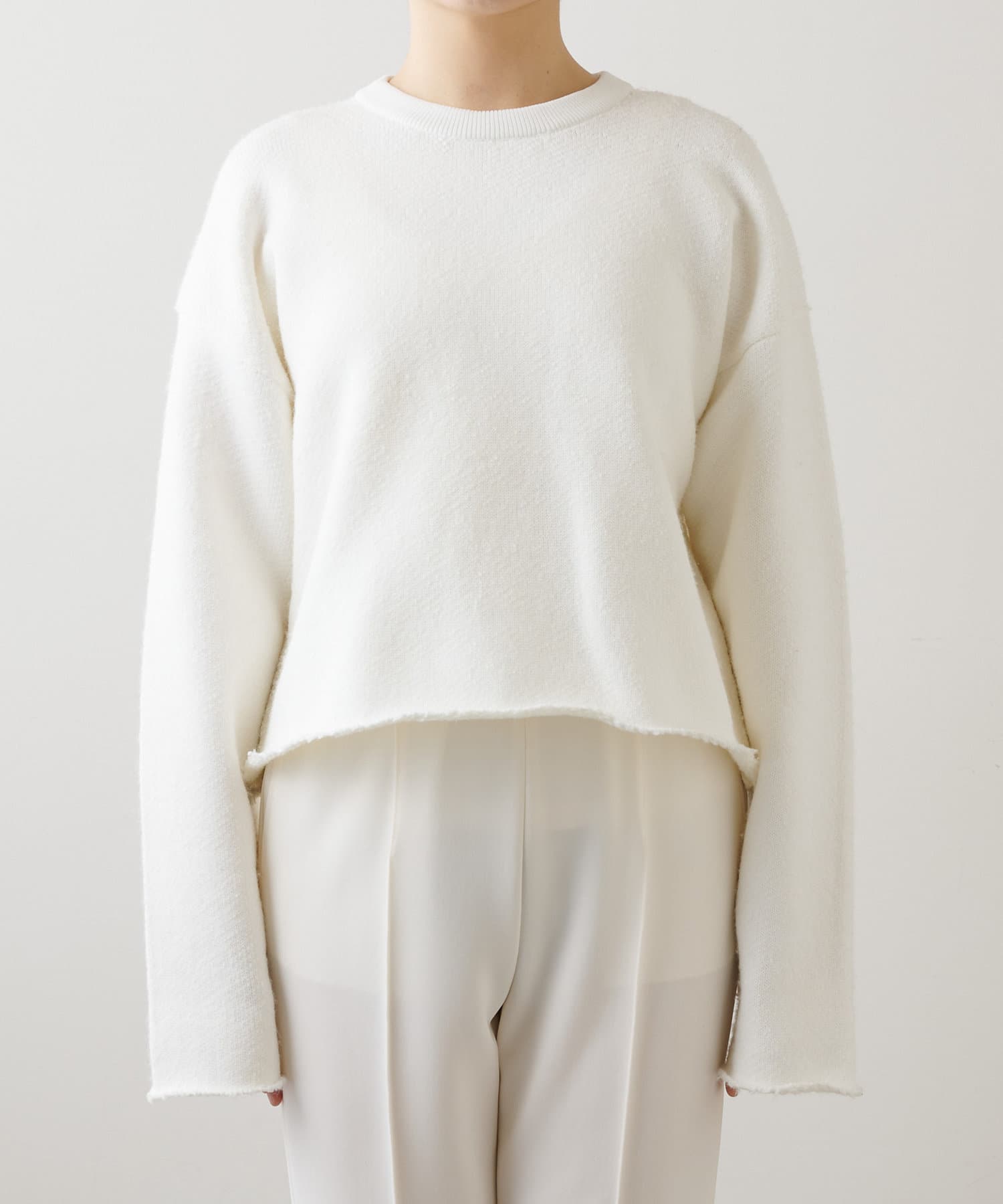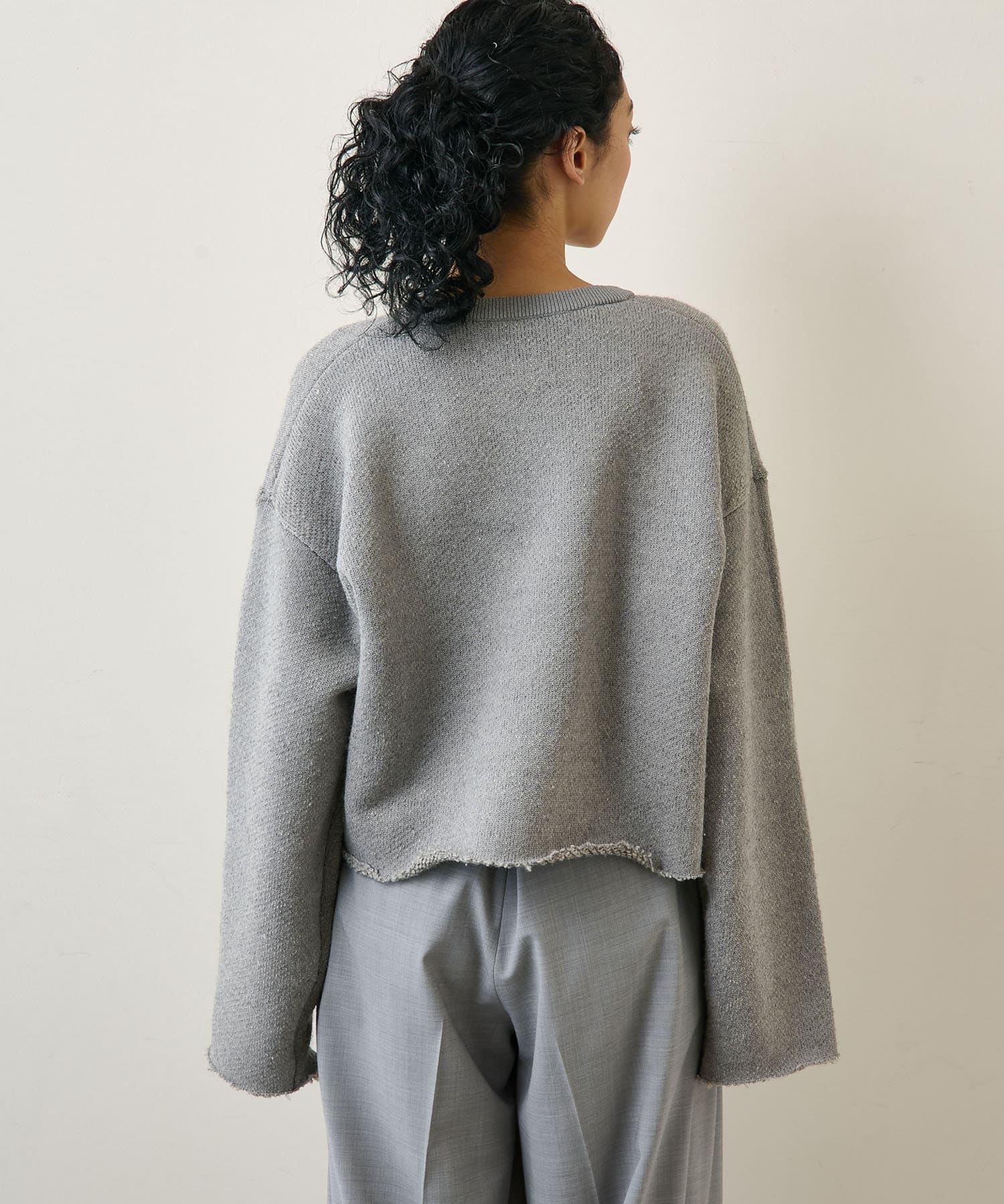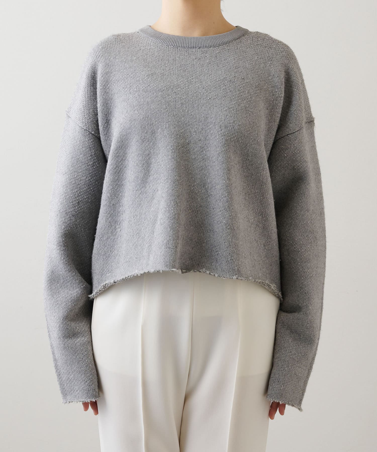 ■裁ち切りのヘムが一枚でも様になり、シャツなどをレイヤードしても楽しめるニットアイテム。