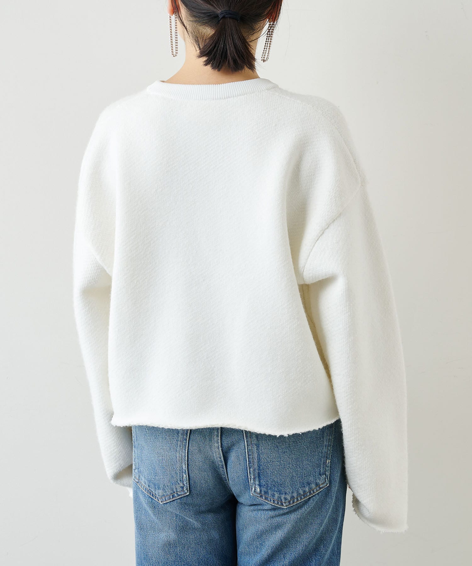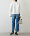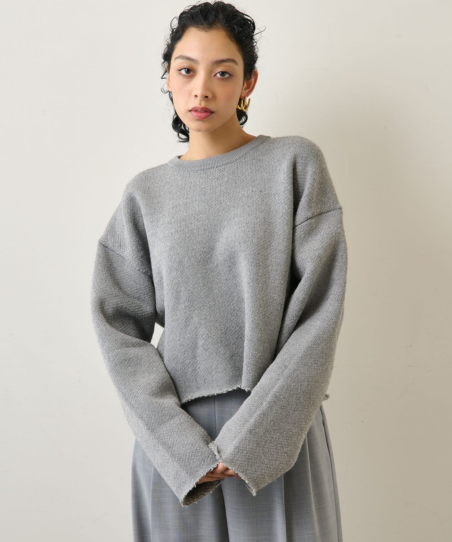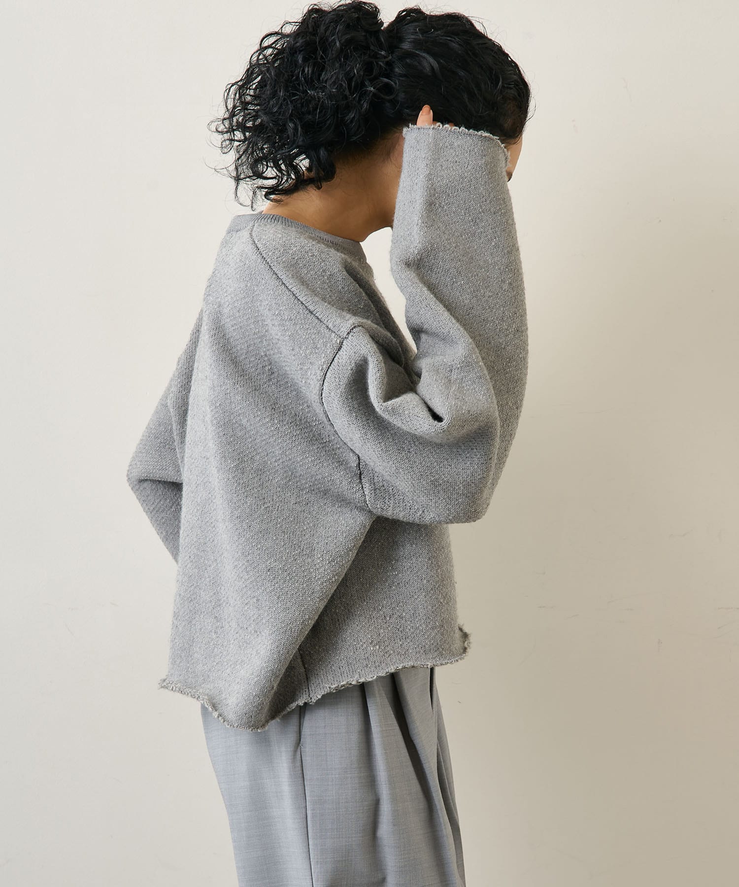 ■裁ち切りのヘムが一枚でも様になり、シャツなどをレイヤードしても楽しめるニットアイテム。