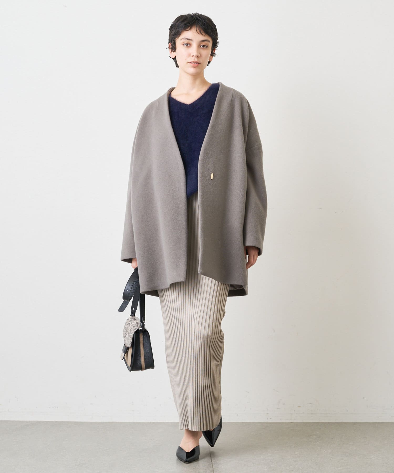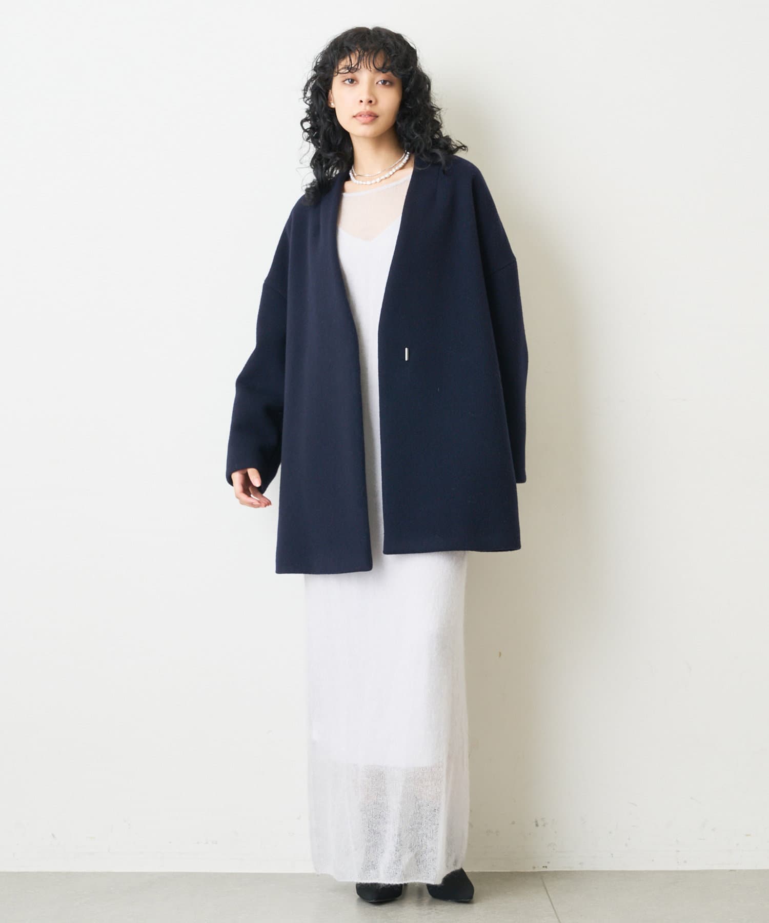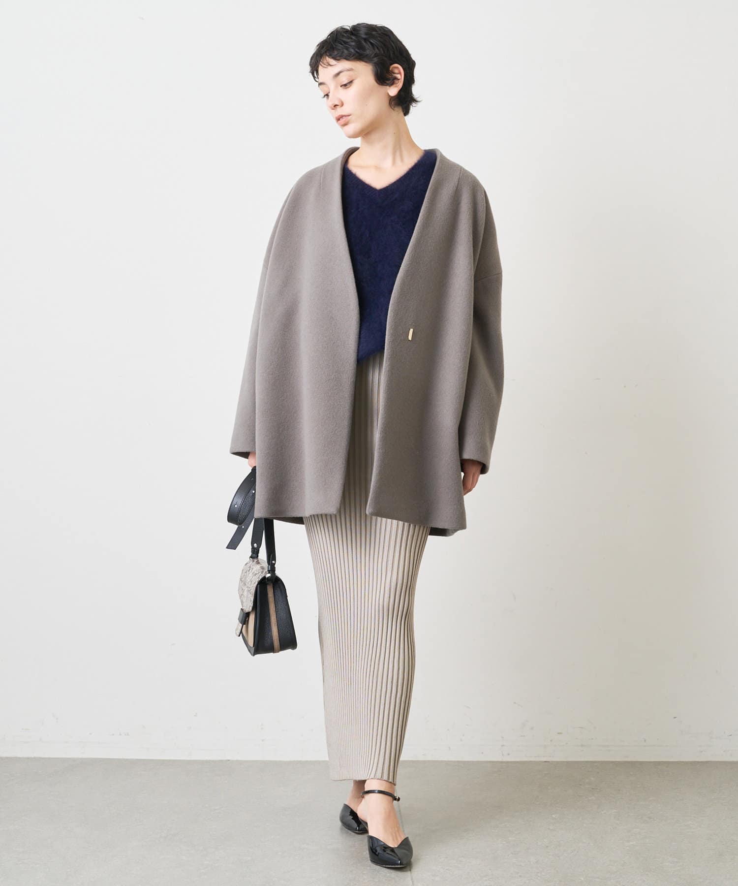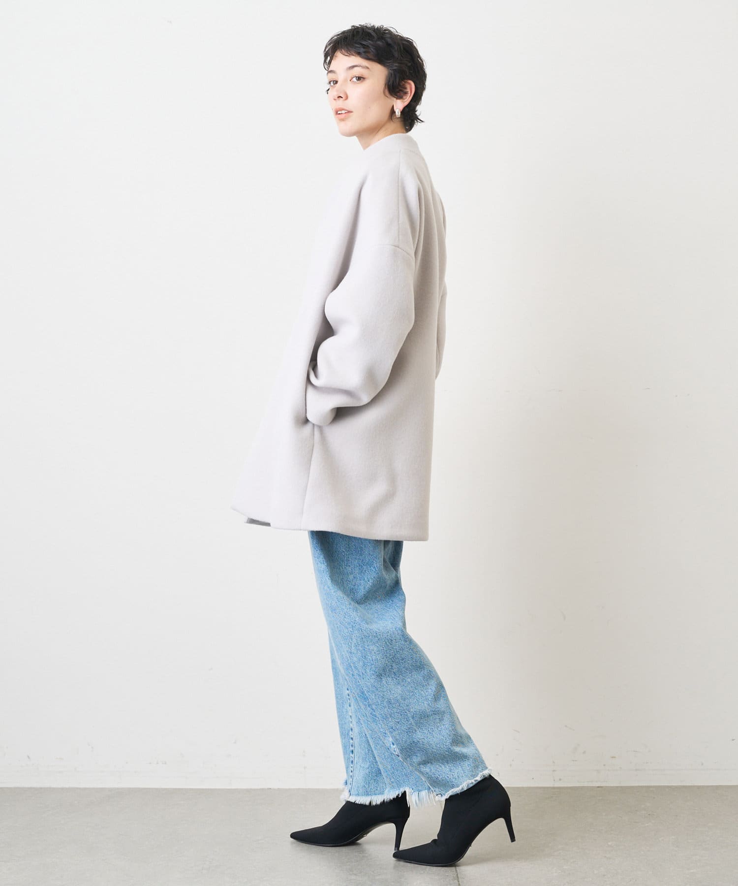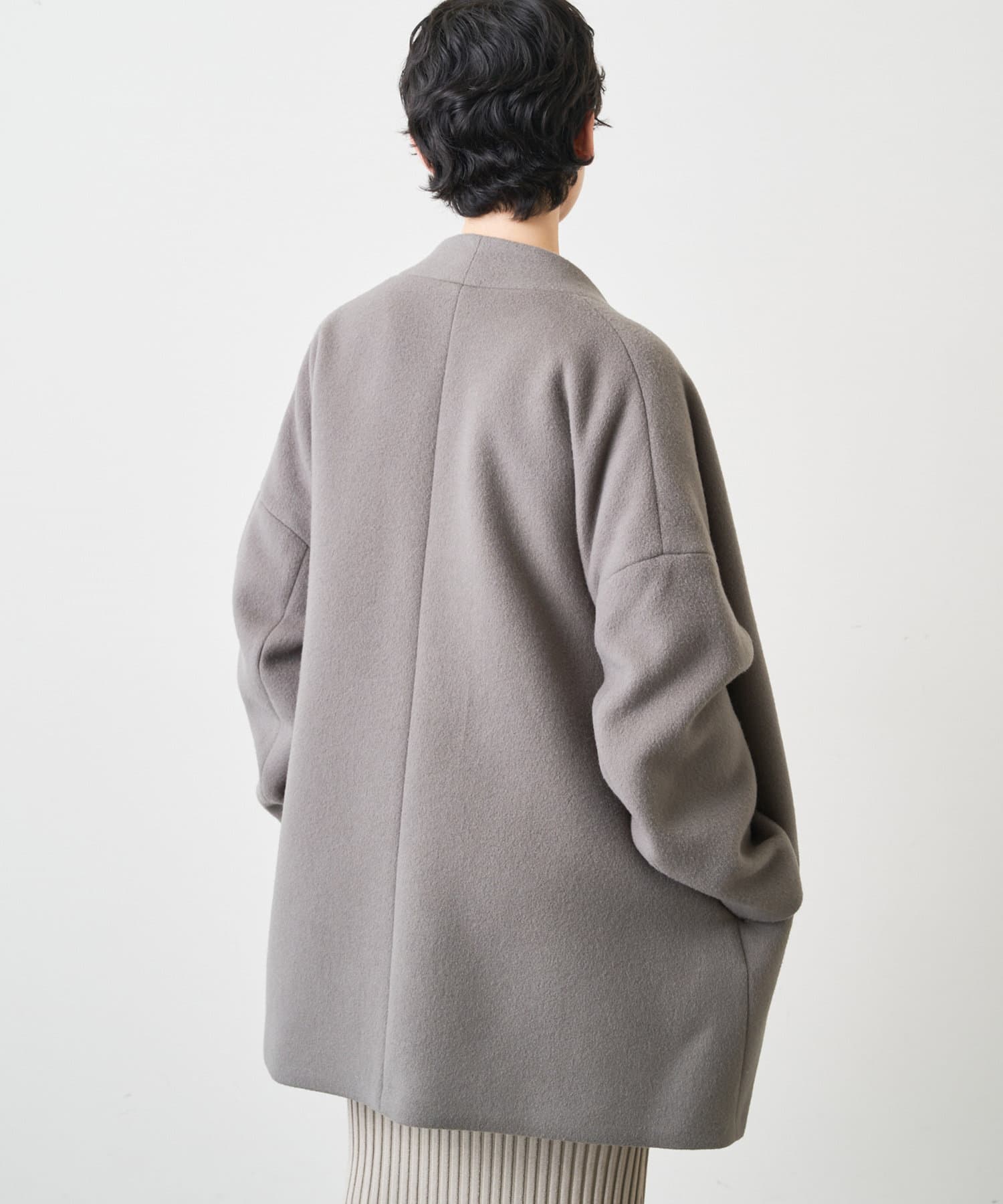 とても軽くサクッと羽織れるミドル丈コート。すっきり見えるVネックのノーカラーです。後ろの襟はしっかり高さがあるので冬も風が通りにくいです。ヒップラインにまるっとかかる着丈で、パンツでもスカートでもバランスも取りやすいですよ。