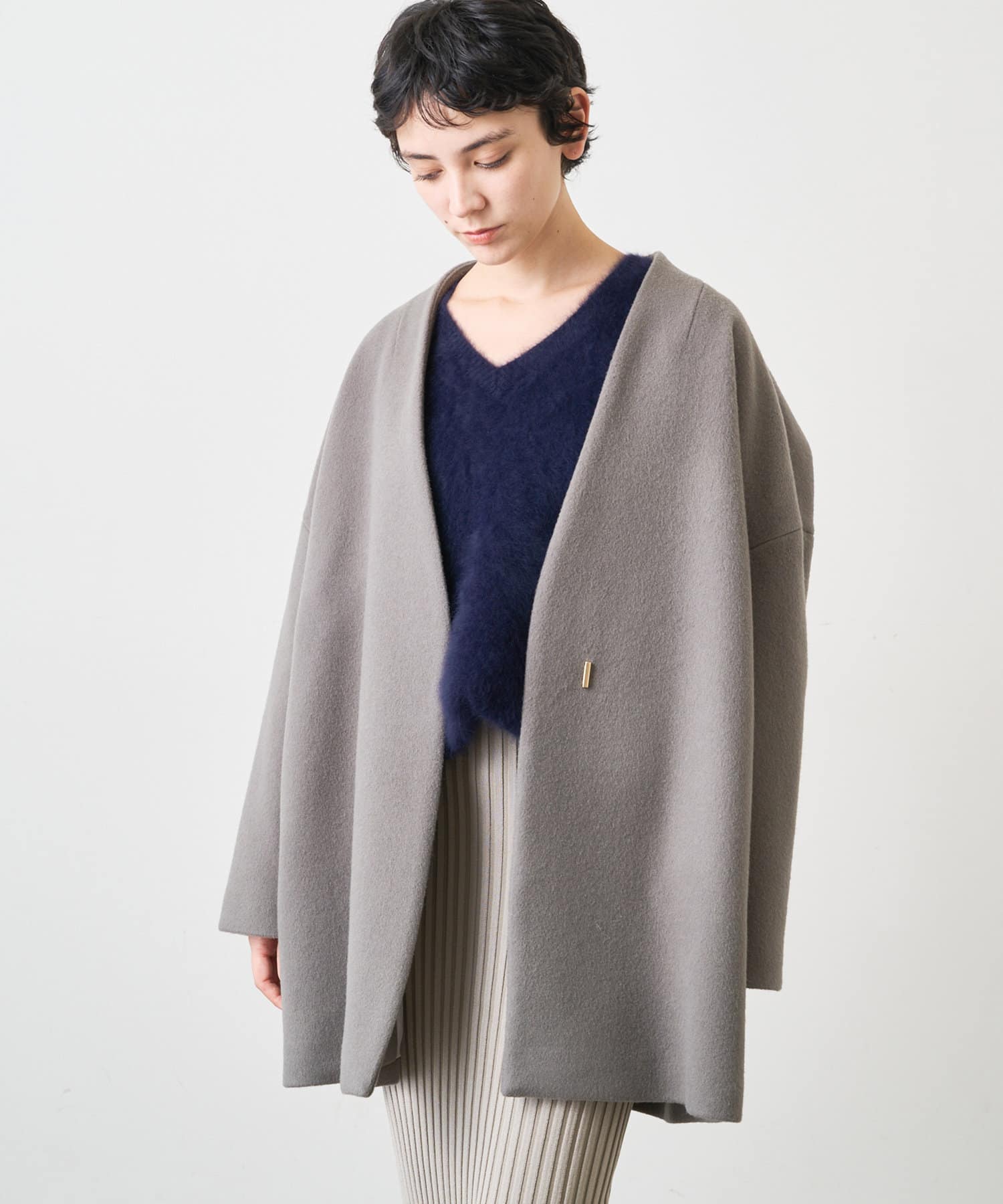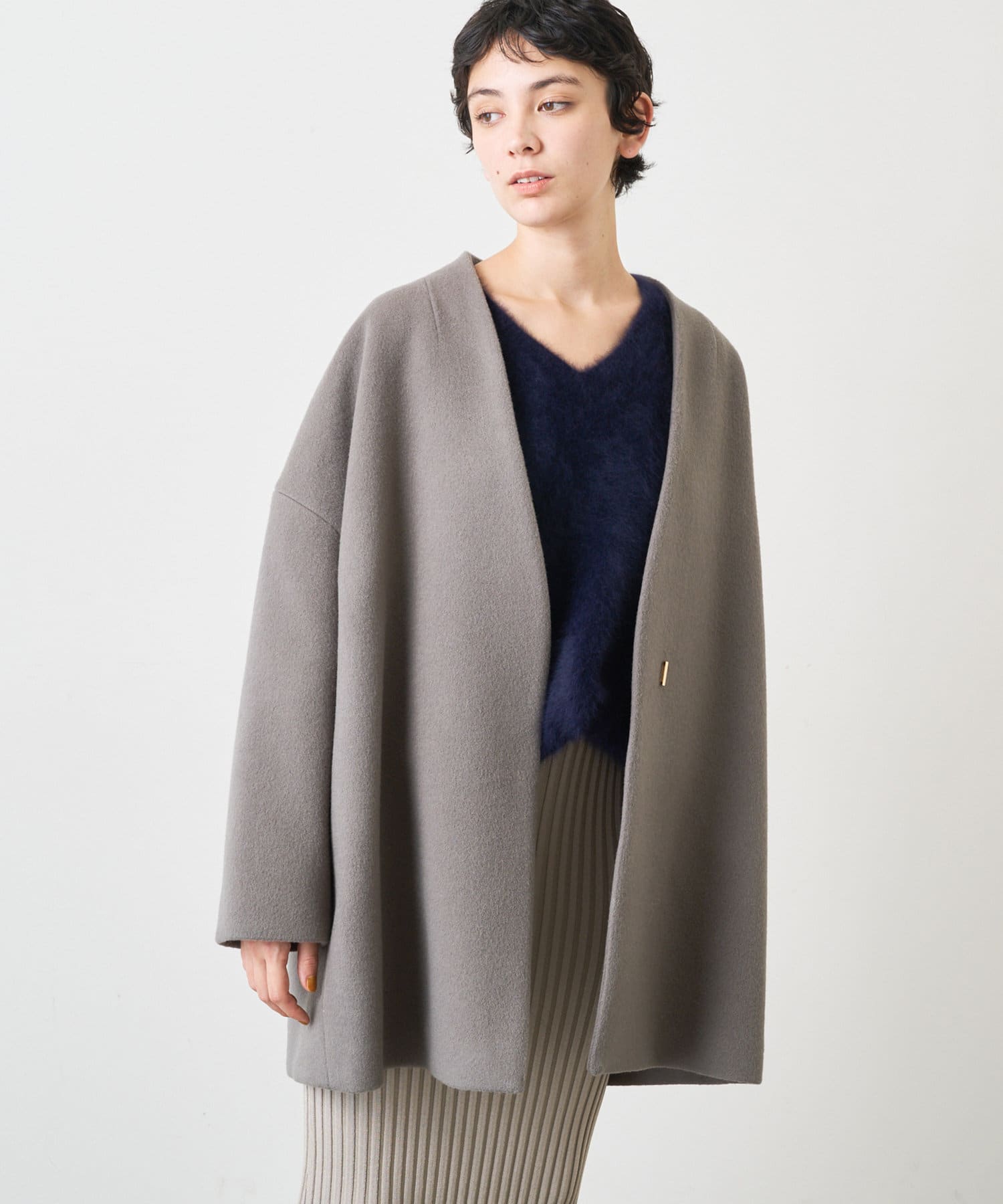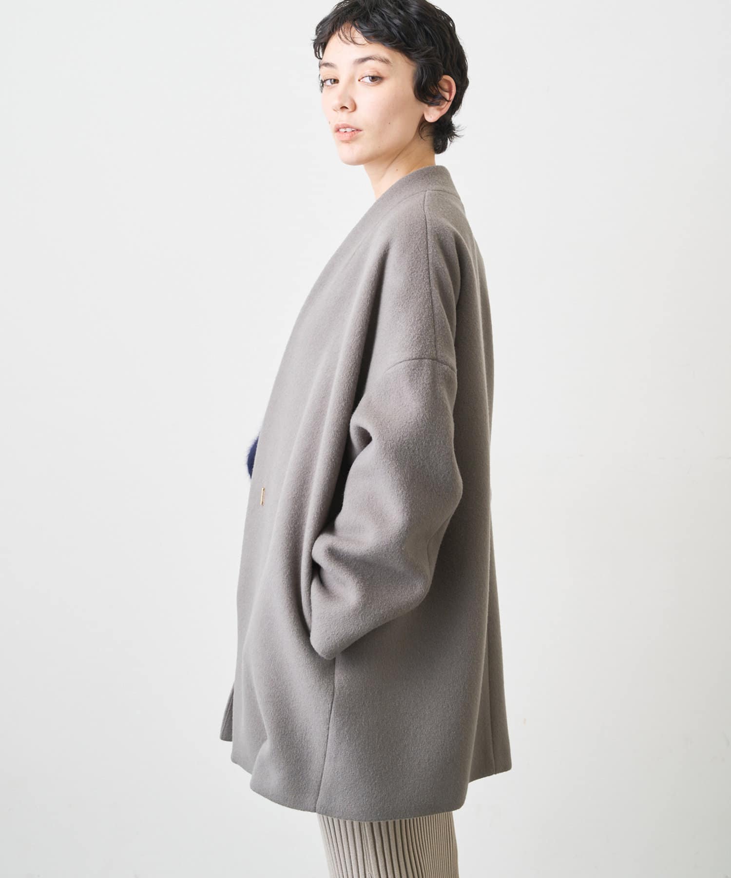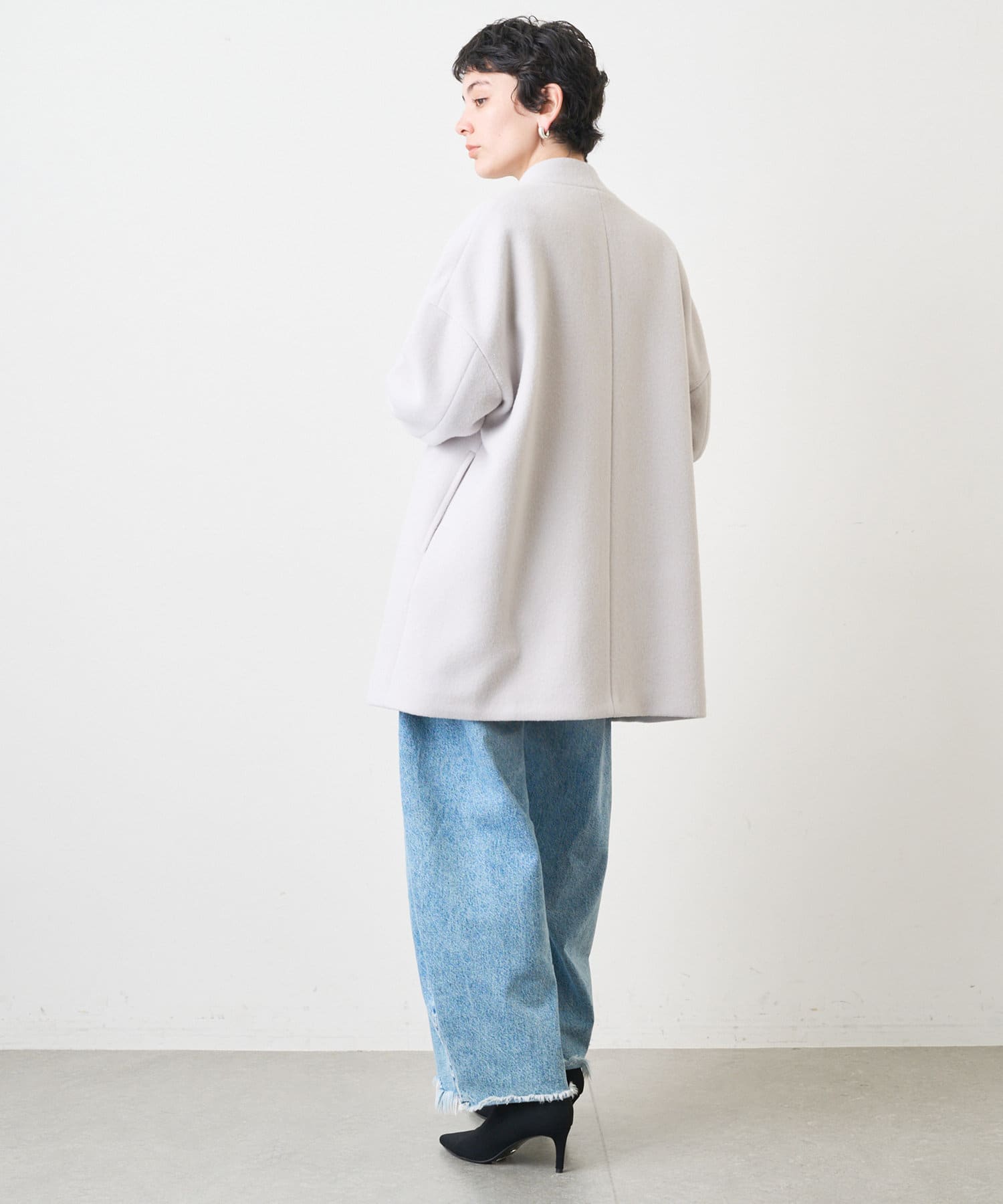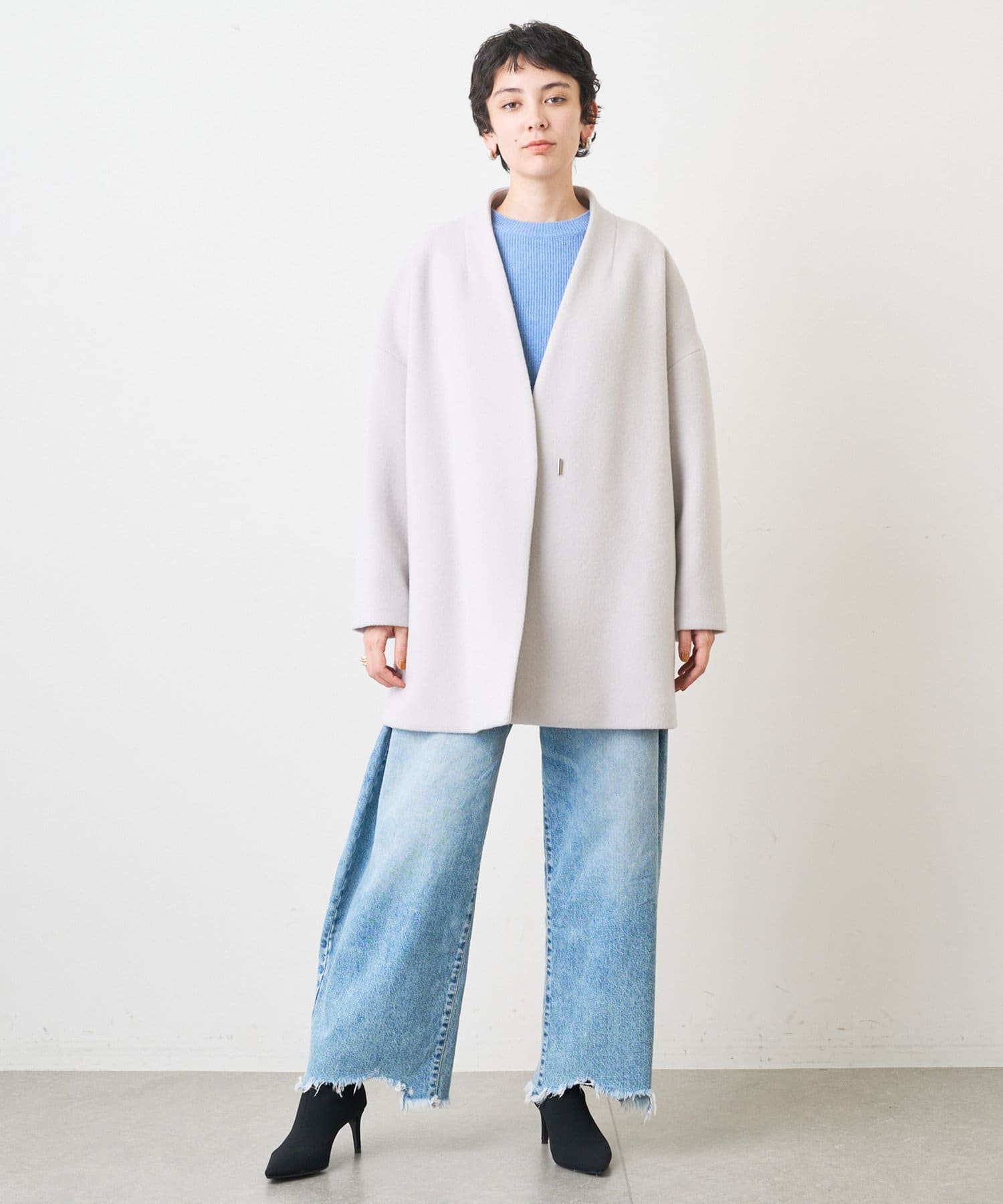 とても軽くサクッと羽織れるミドル丈コート。すっきり見えるVネックのノーカラーです。後ろの襟はしっかり高さがあるので冬も風が通りにくいです。ヒップラインにまるっとかかる着丈で、パンツでもスカートでもバランスも取りやすいですよ。