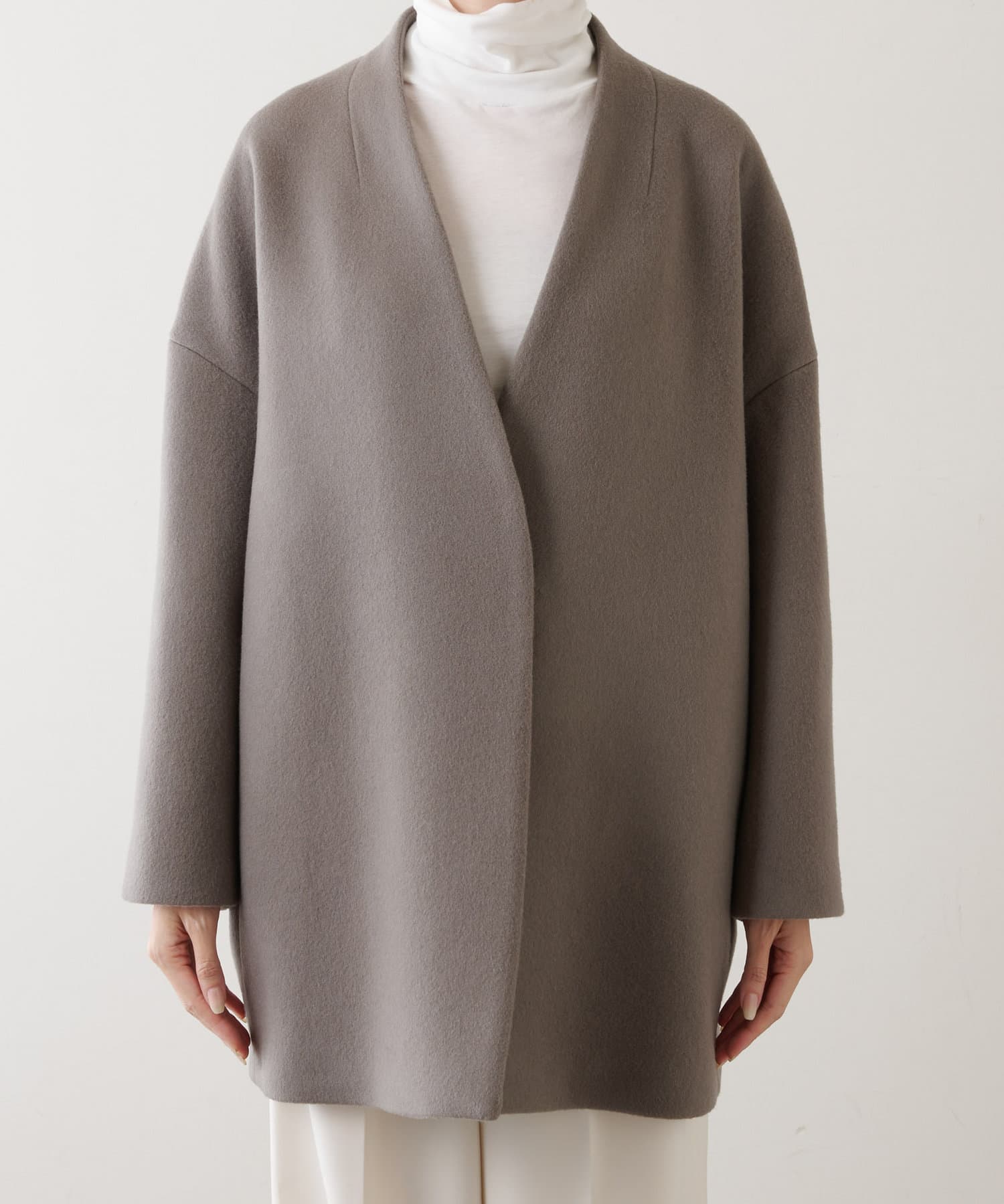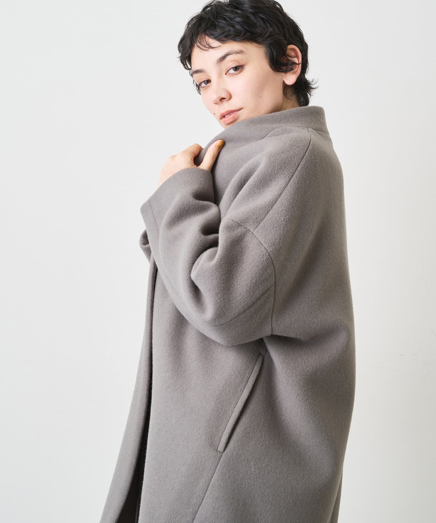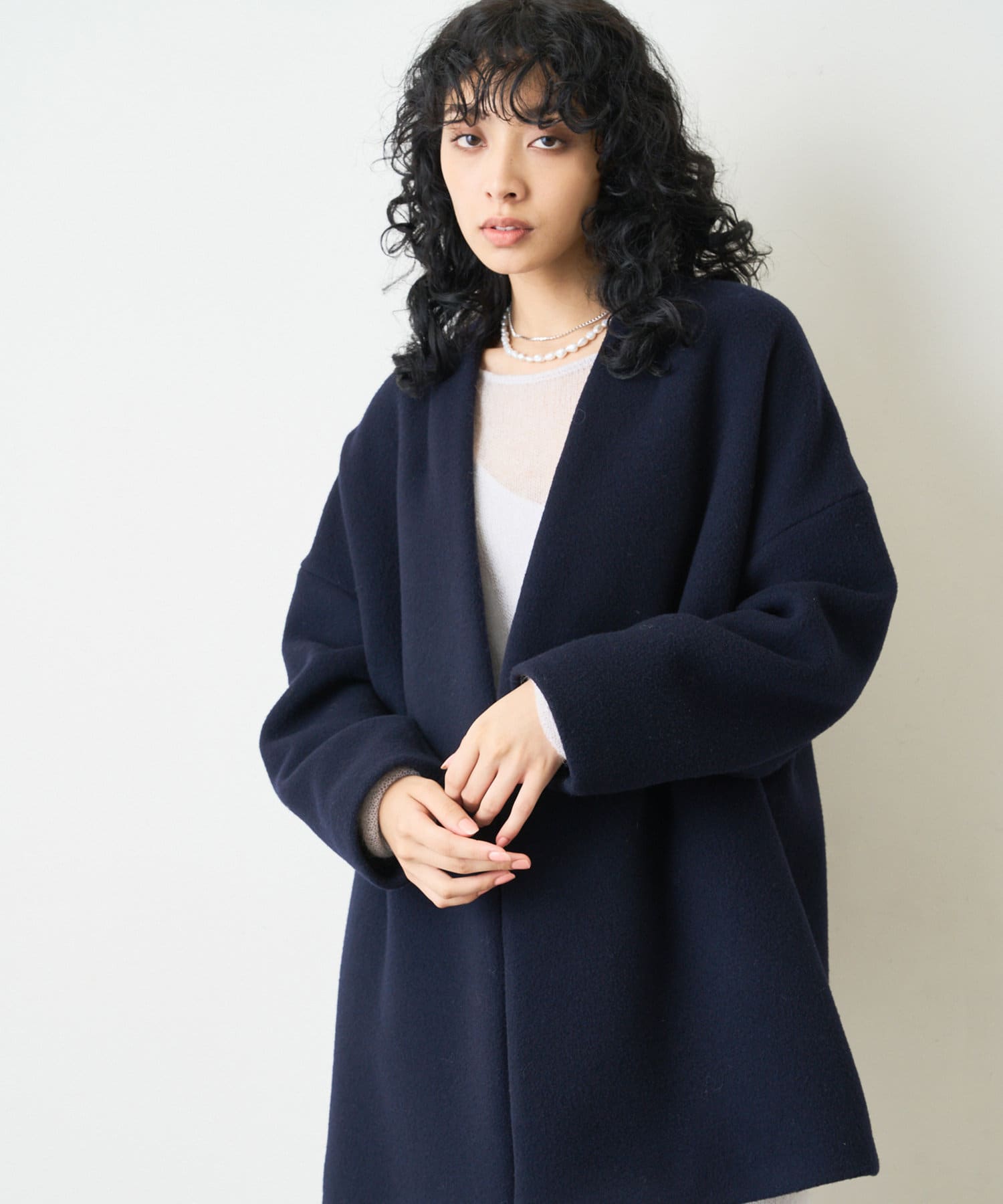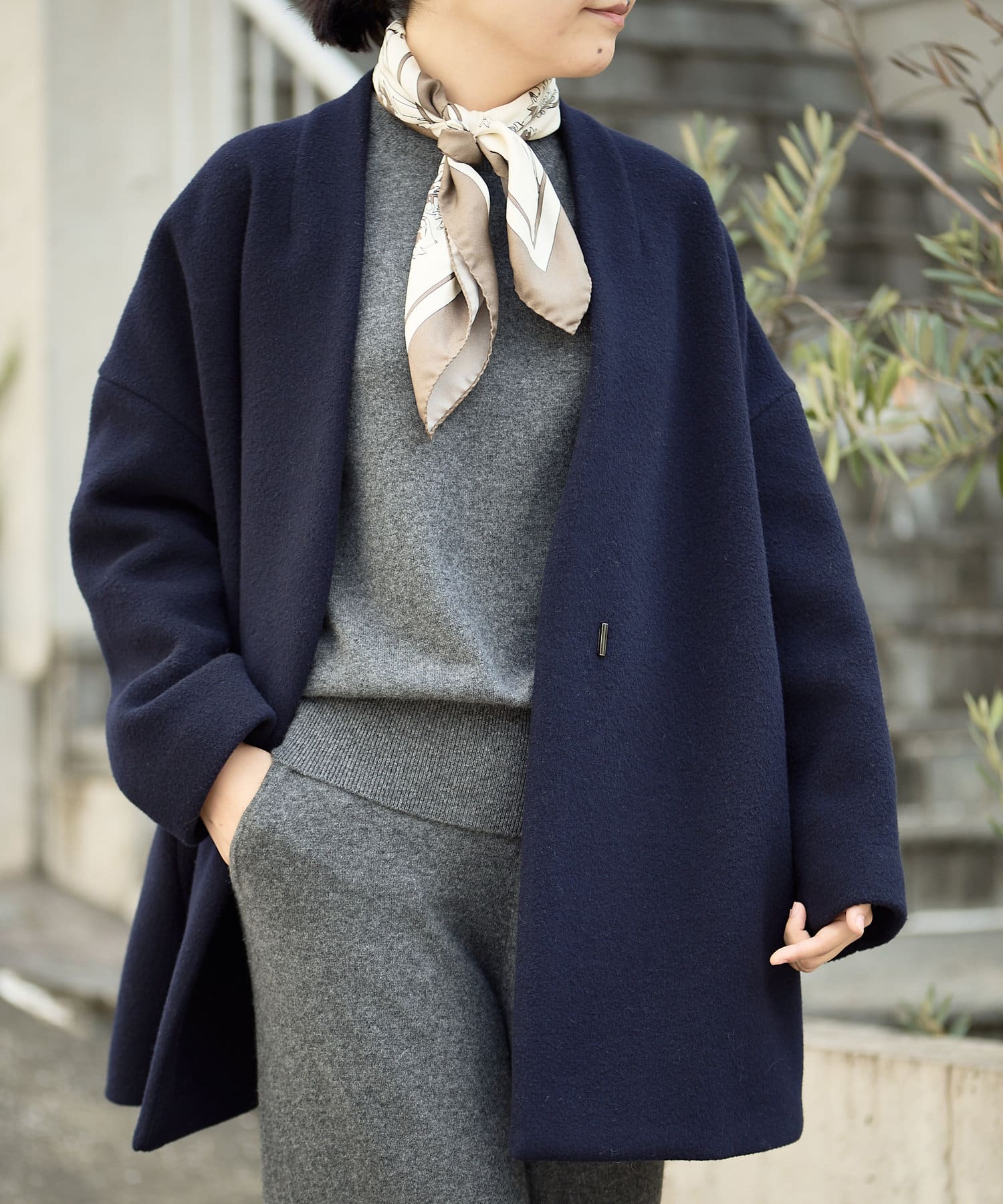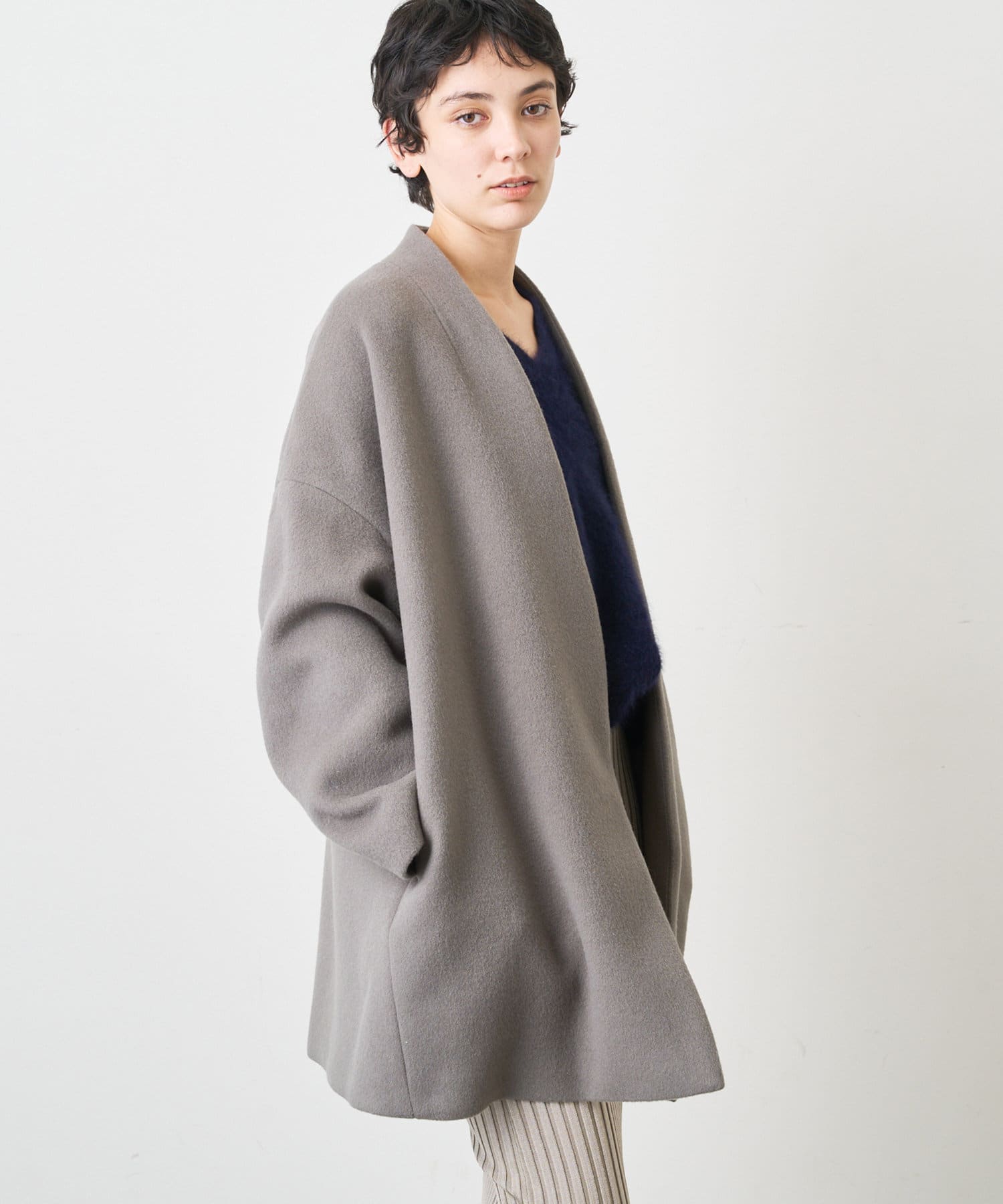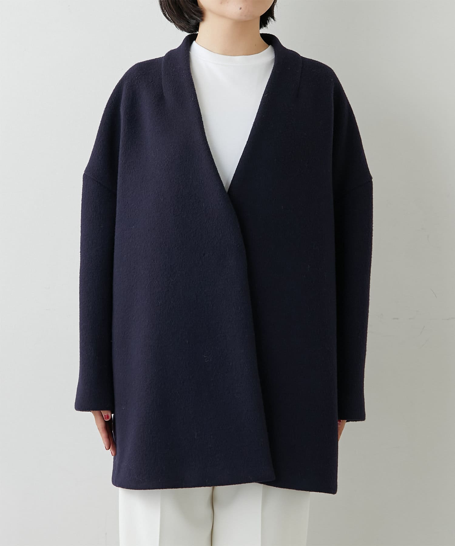 とても軽くサクッと羽織れるミドル丈コート。すっきり見えるVネックのノーカラーです。後ろの襟はしっかり高さがあるので冬も風が通りにくいです。ヒップラインにまるっとかかる着丈で、パンツでもスカートでもバランスも取りやすいですよ。