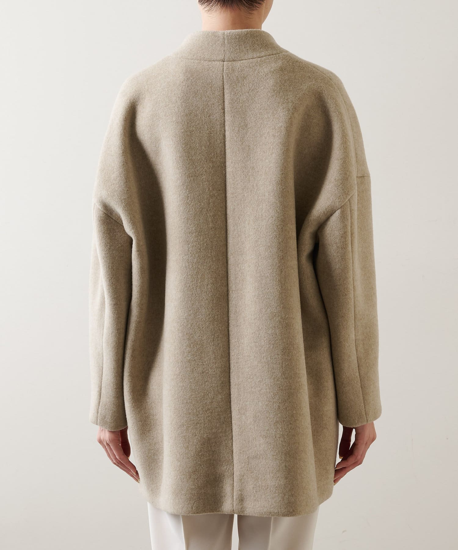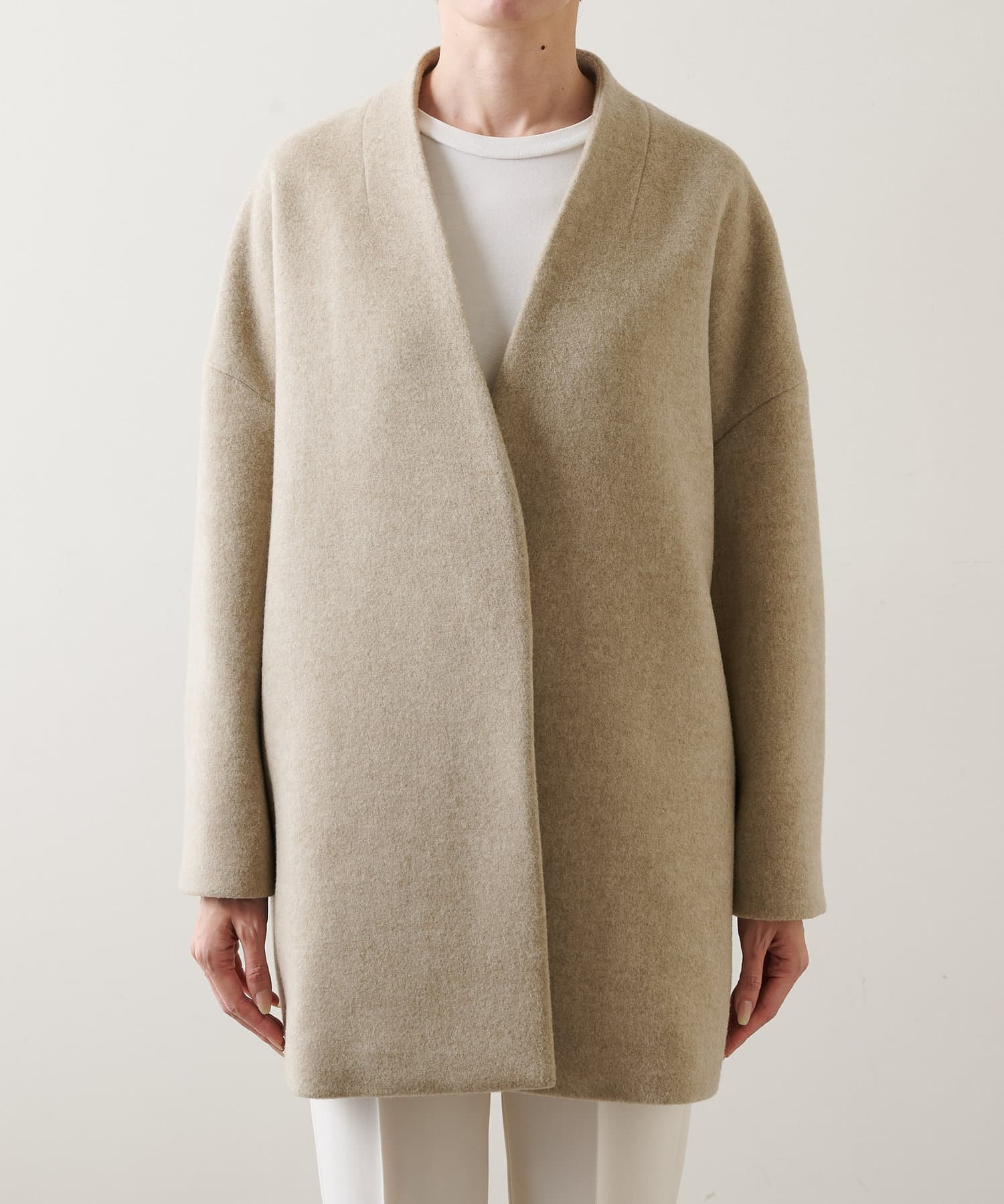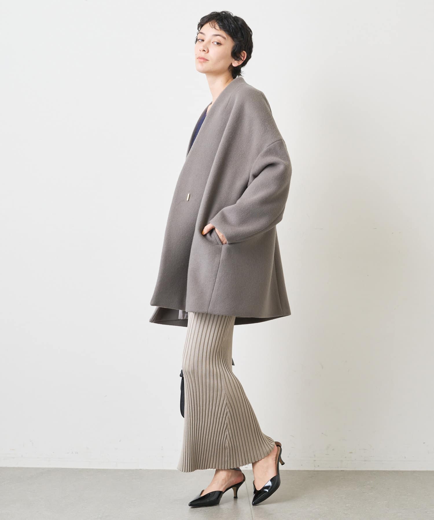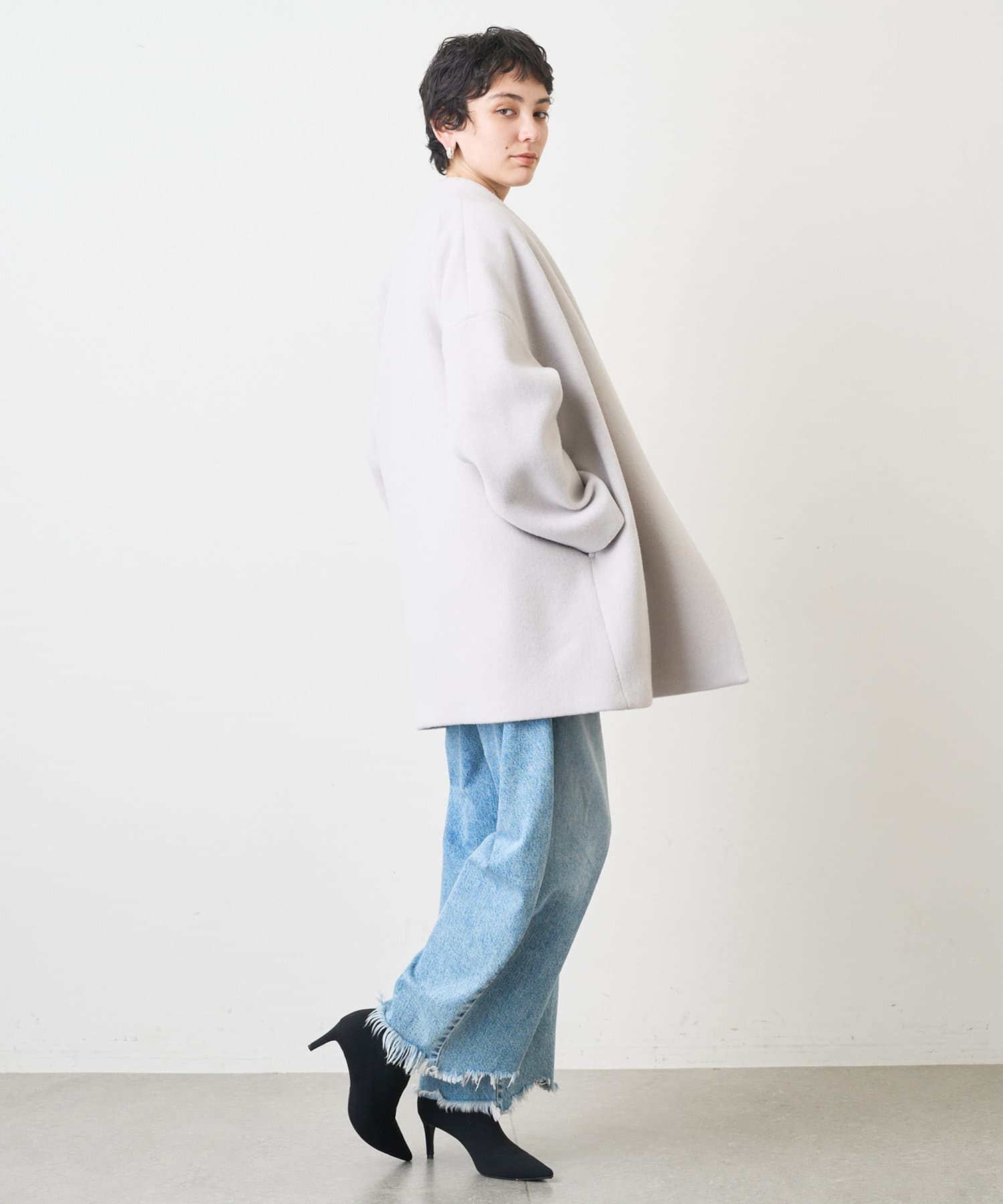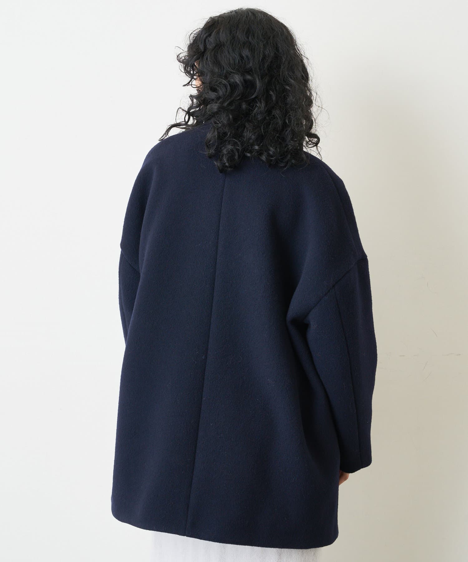 とても軽くサクッと羽織れるミドル丈コート。すっきり見えるVネックのノーカラーです。後ろの襟はしっかり高さがあるので冬も風が通りにくいです。ヒップラインにまるっとかかる着丈で、パンツでもスカートでもバランスも取りやすいですよ。