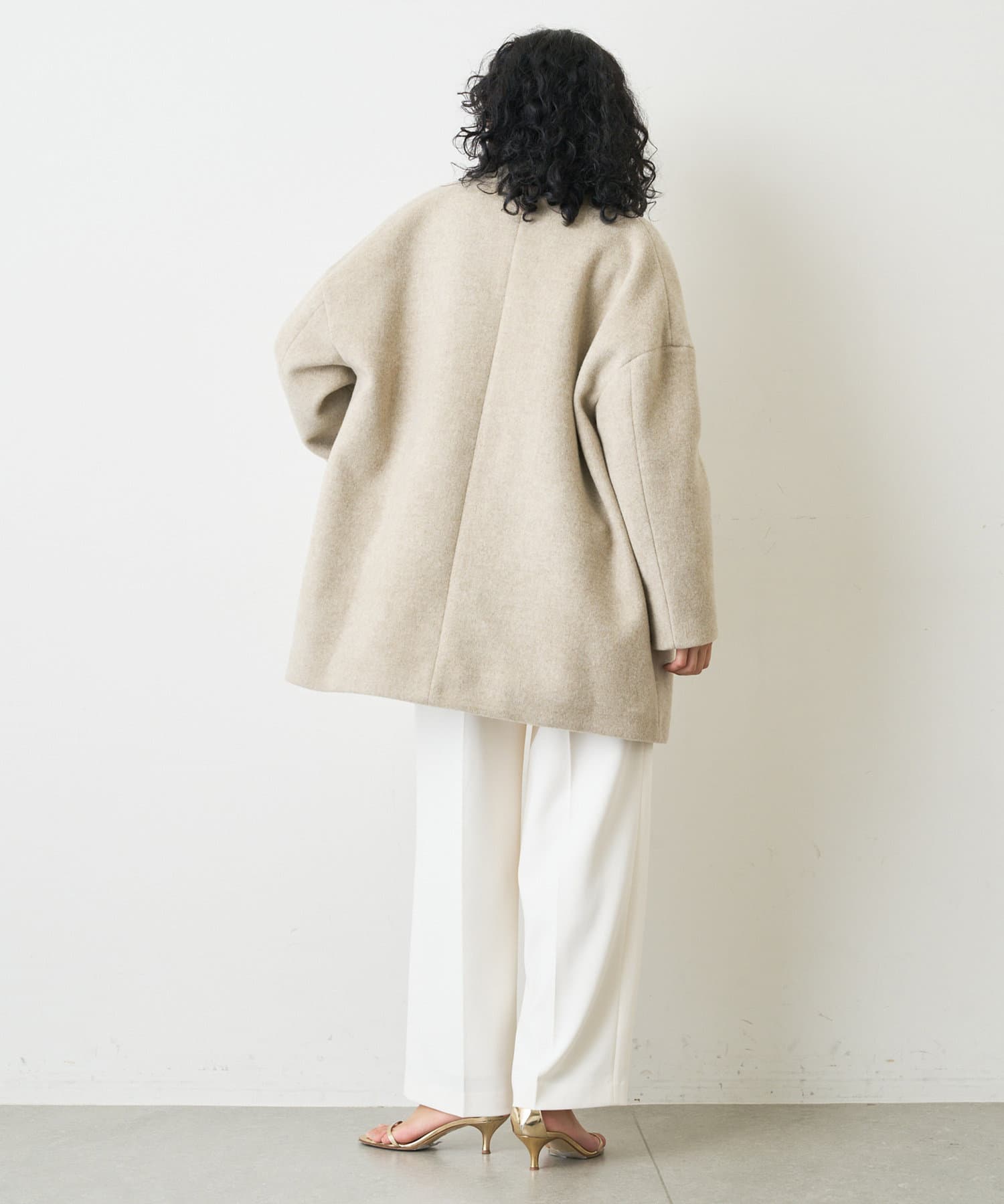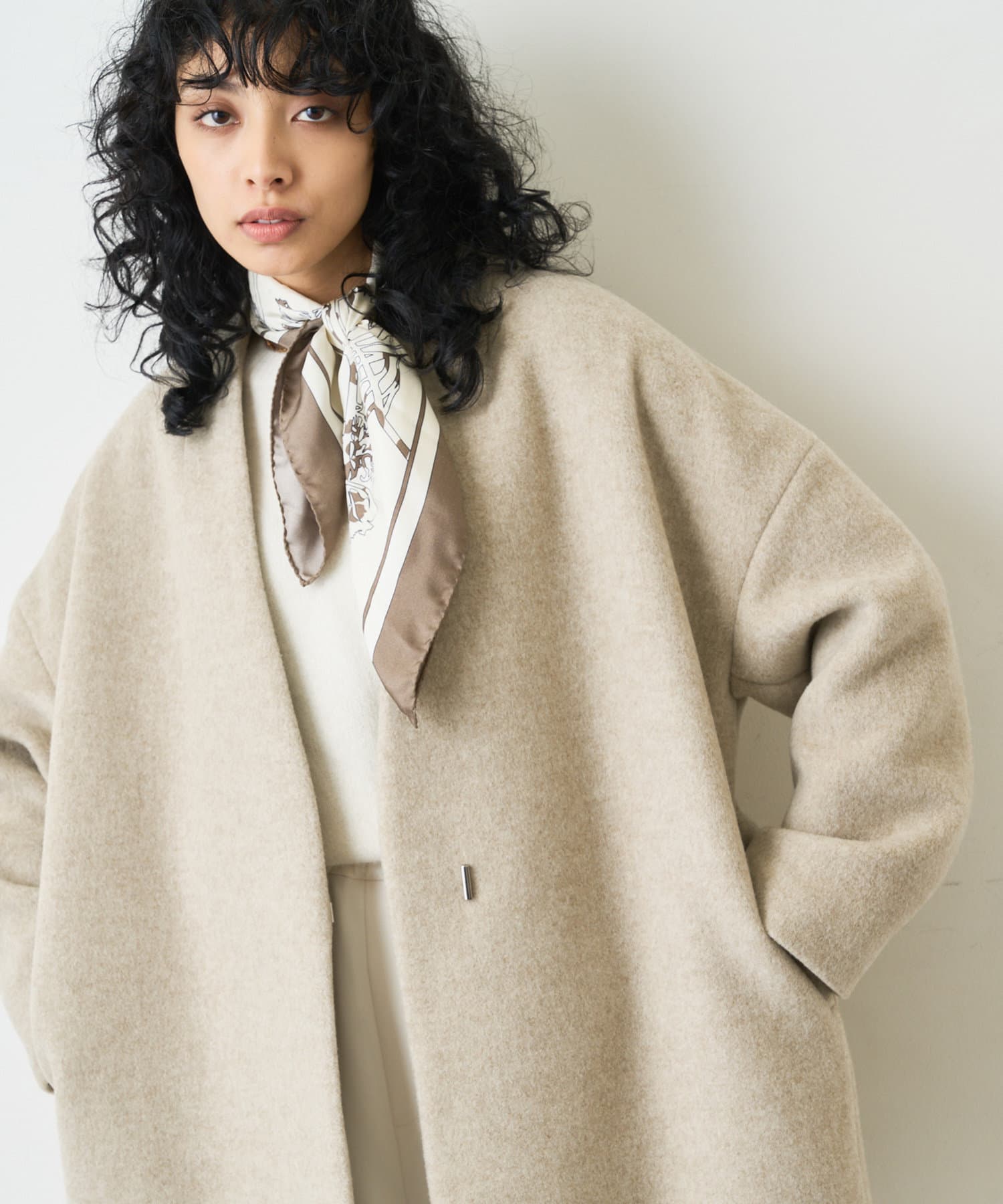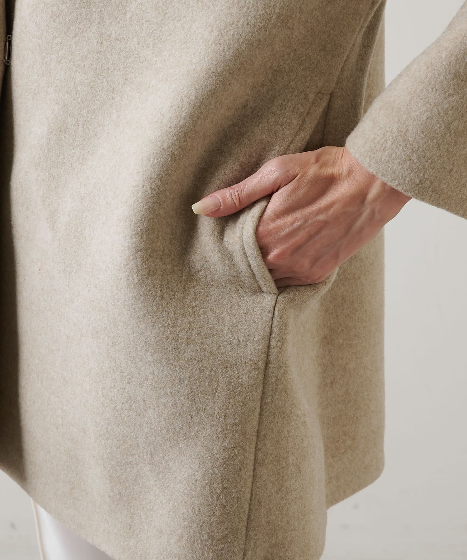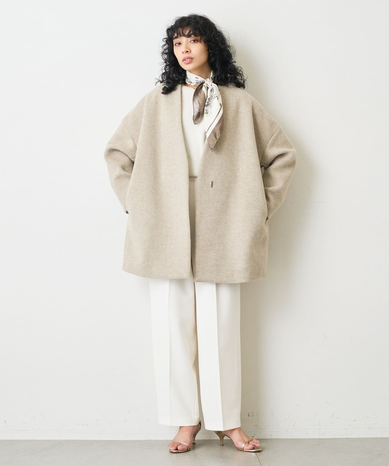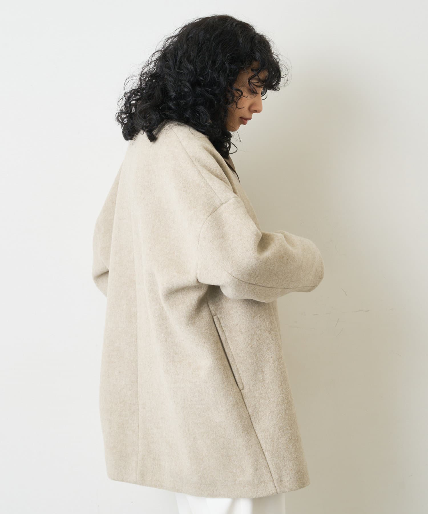 とても軽くサクッと羽織れるミドル丈コート。すっきり見えるVネックのノーカラーです。後ろの襟はしっかり高さがあるので冬も風が通りにくいです。ヒップラインにまるっとかかる着丈で、パンツでもスカートでもバランスも取りやすいですよ。
