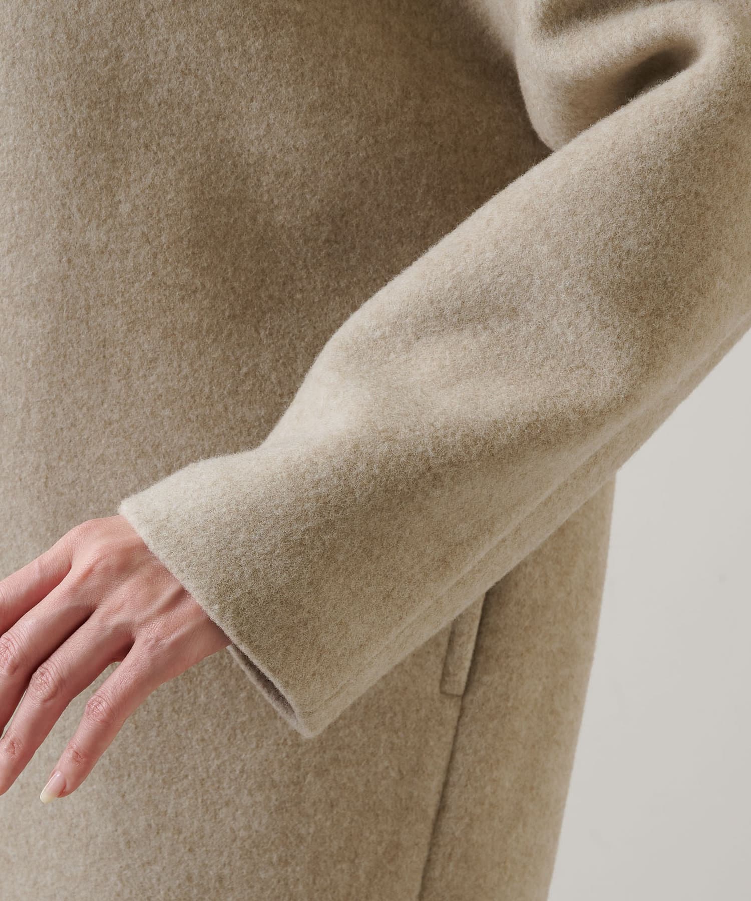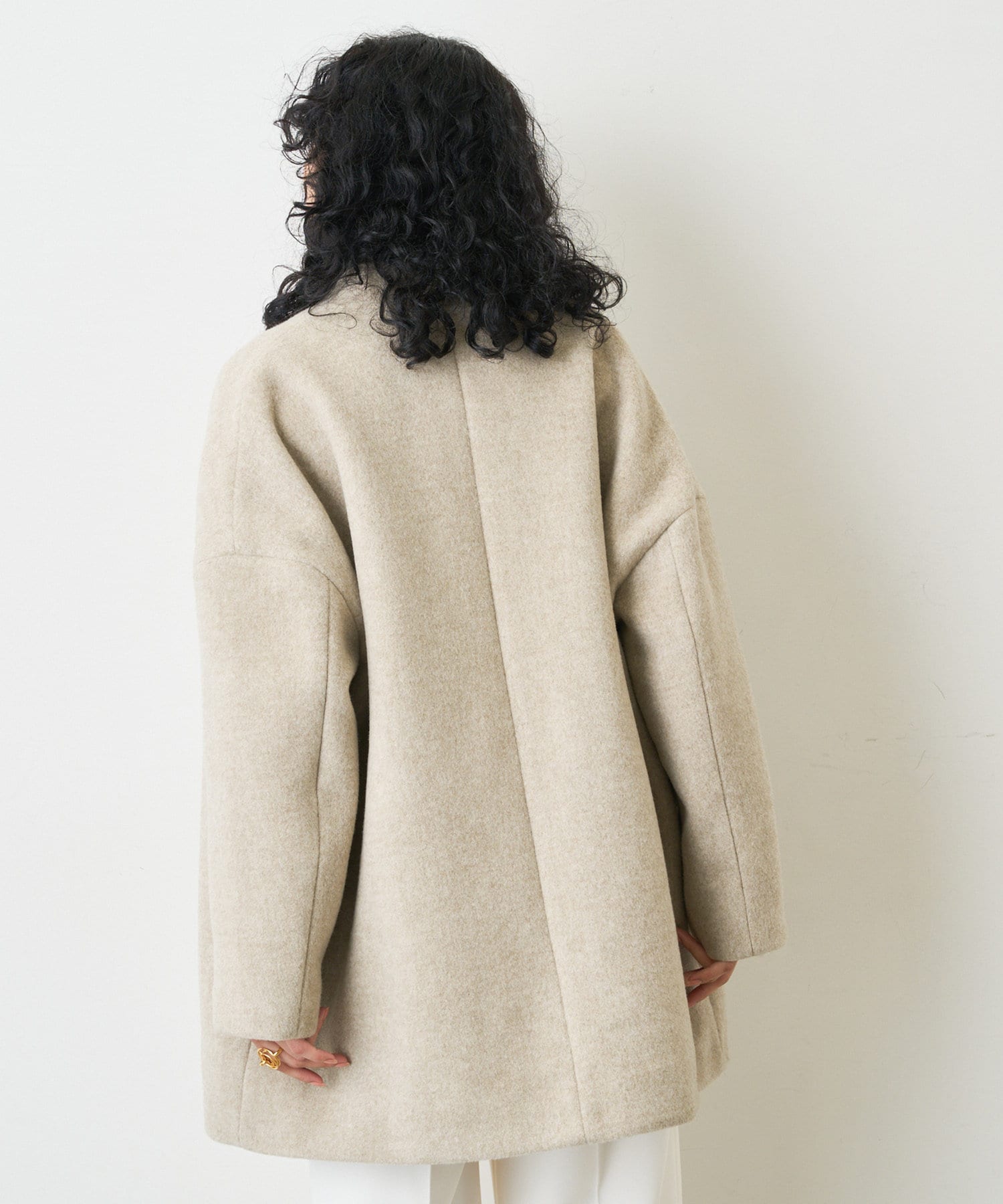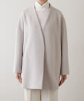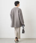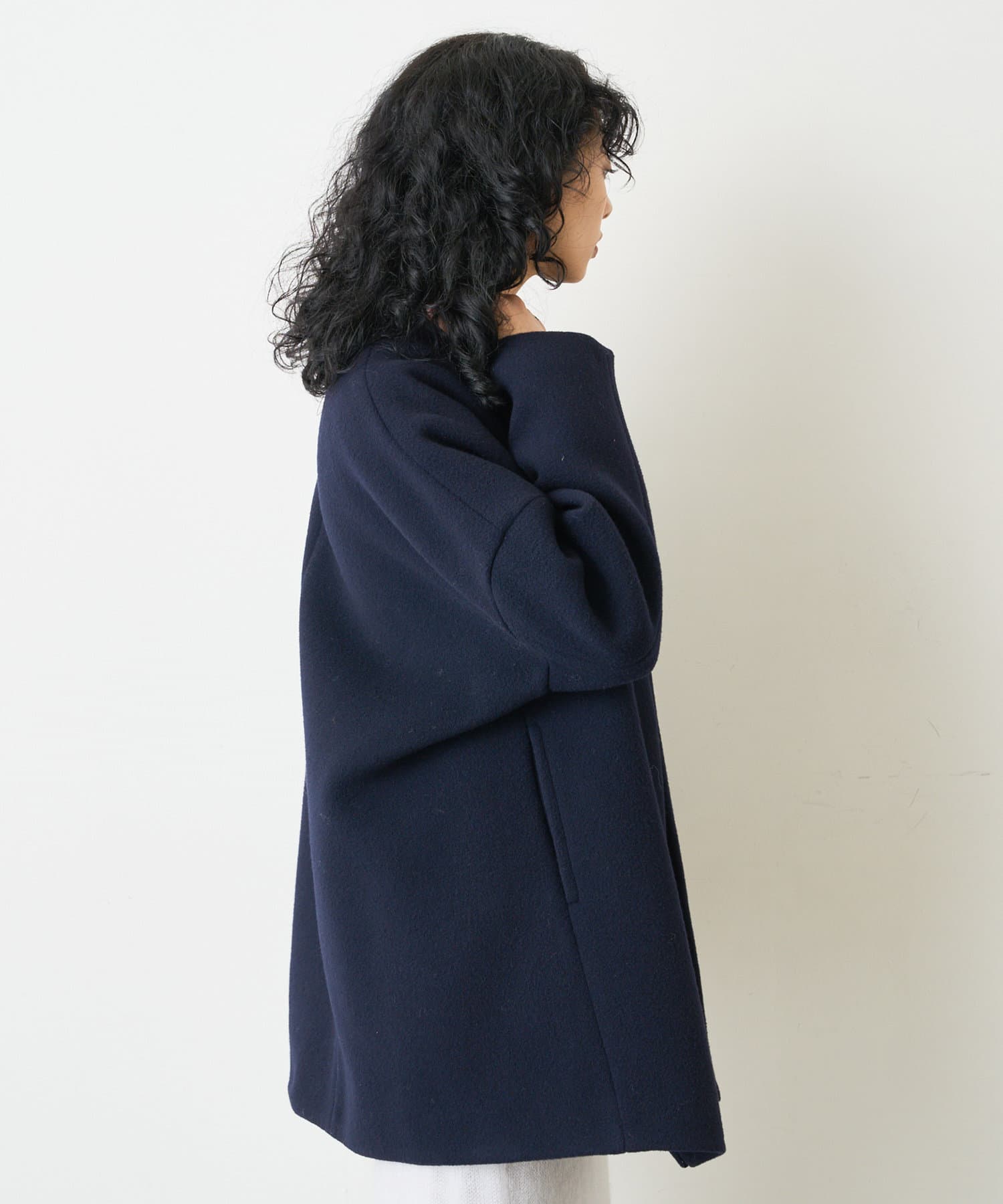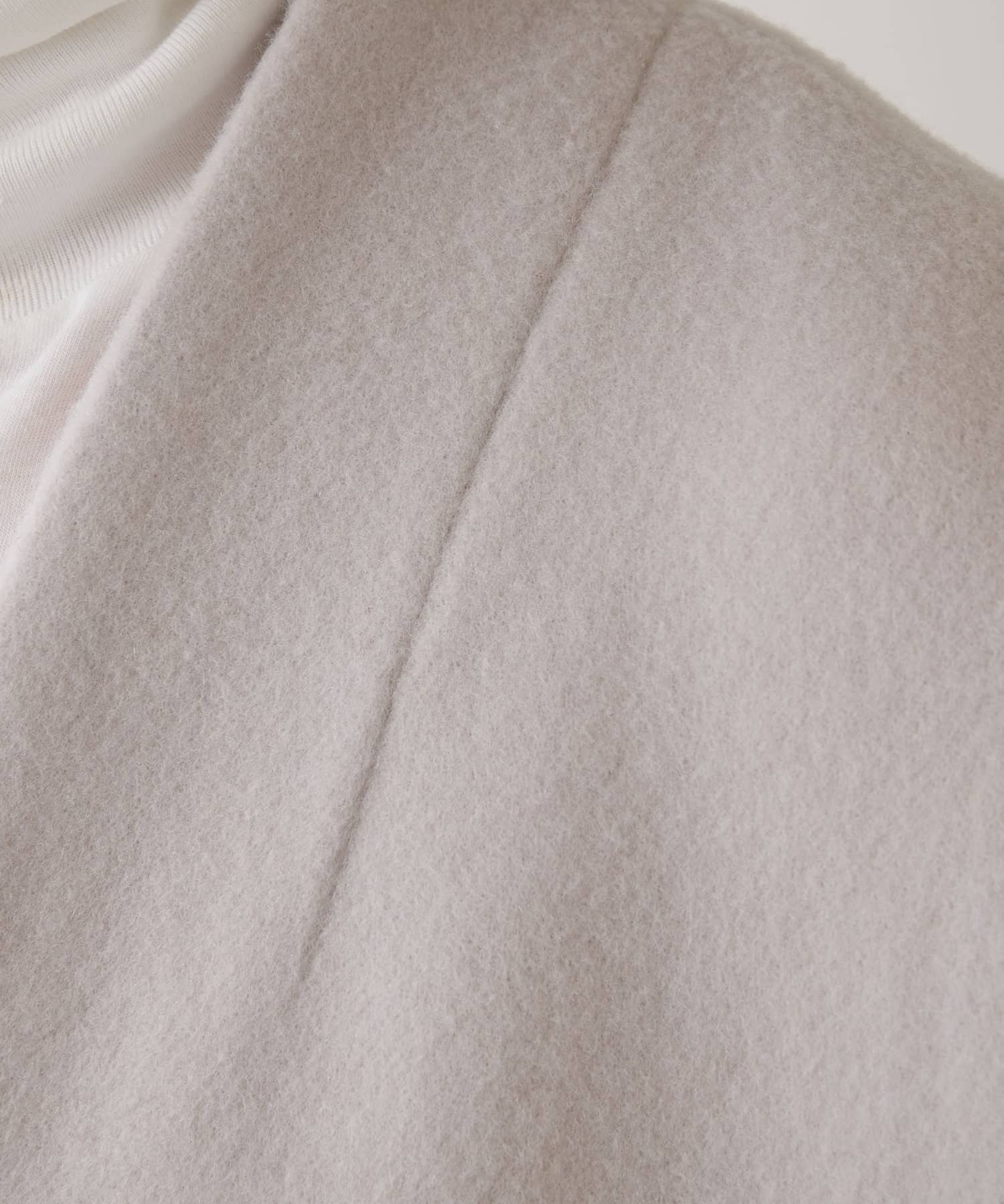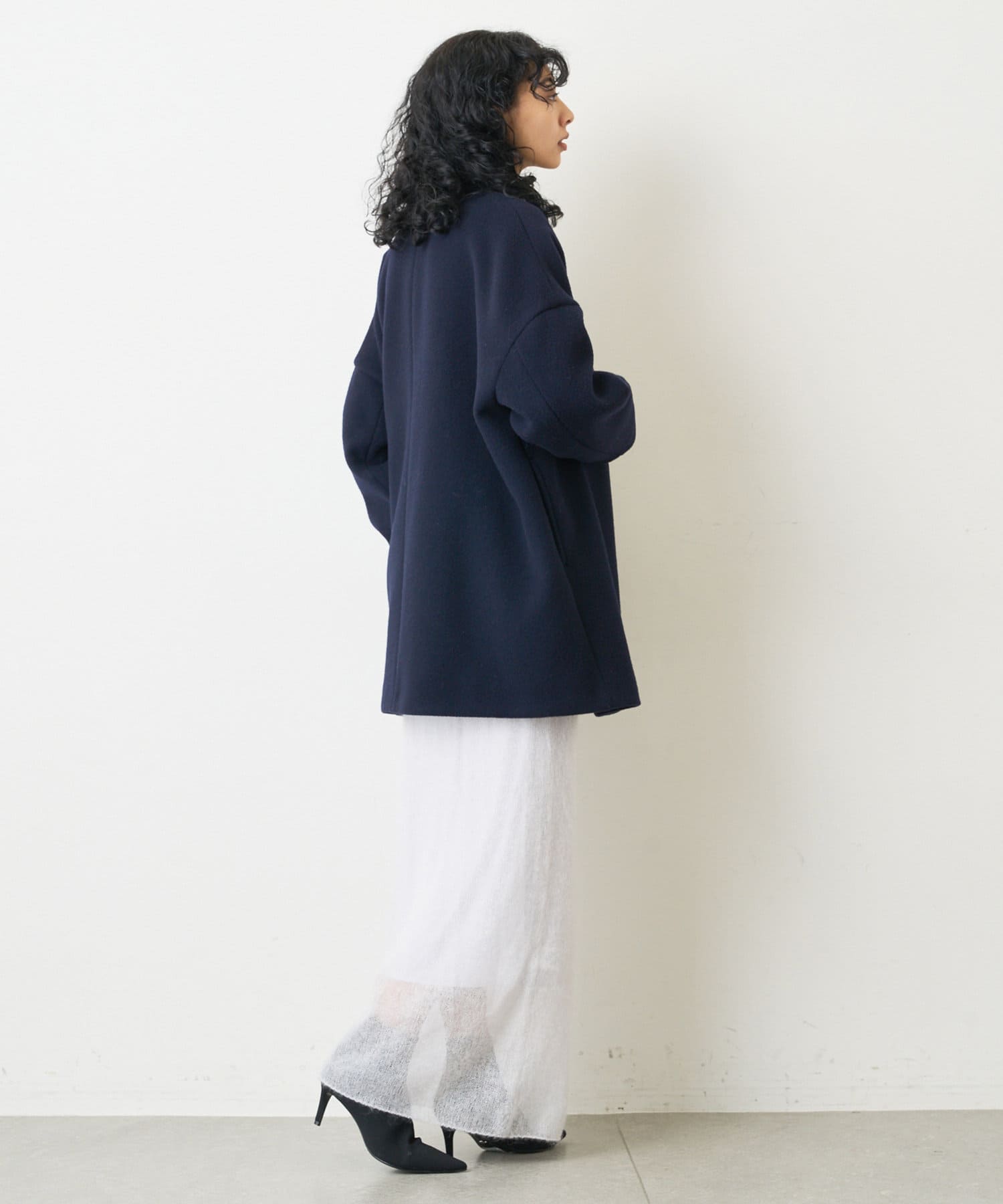 とても軽くサクッと羽織れるミドル丈コート。すっきり見えるVネックのノーカラーです。後ろの襟はしっかり高さがあるので冬も風が通りにくいです。ヒップラインにまるっとかかる着丈で、パンツでもスカートでもバランスも取りやすいですよ。