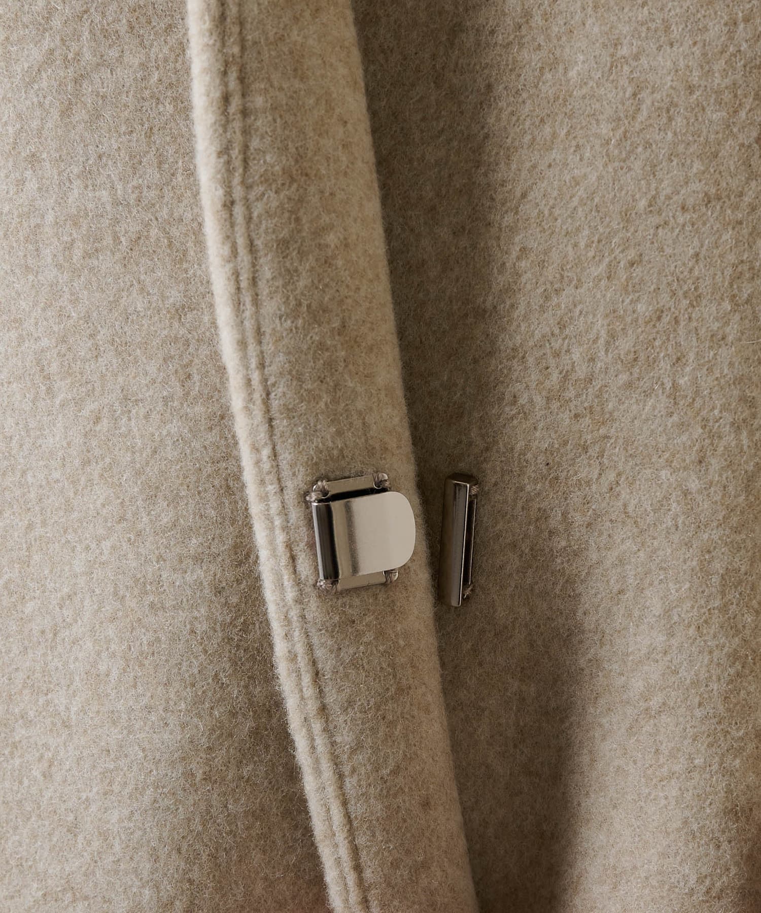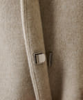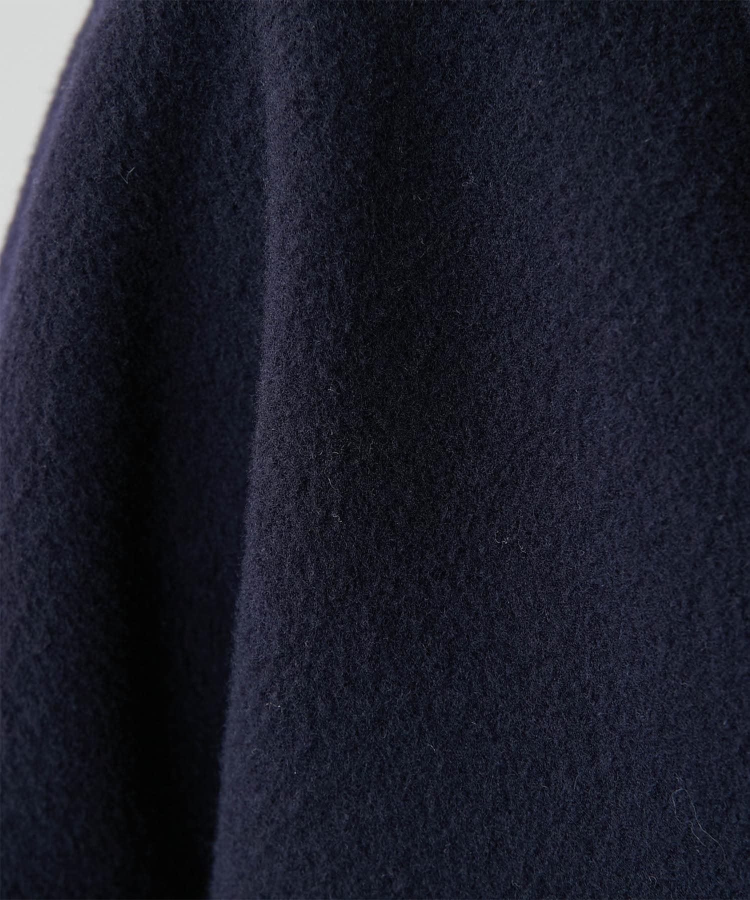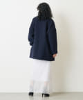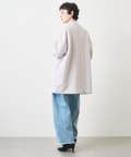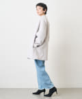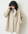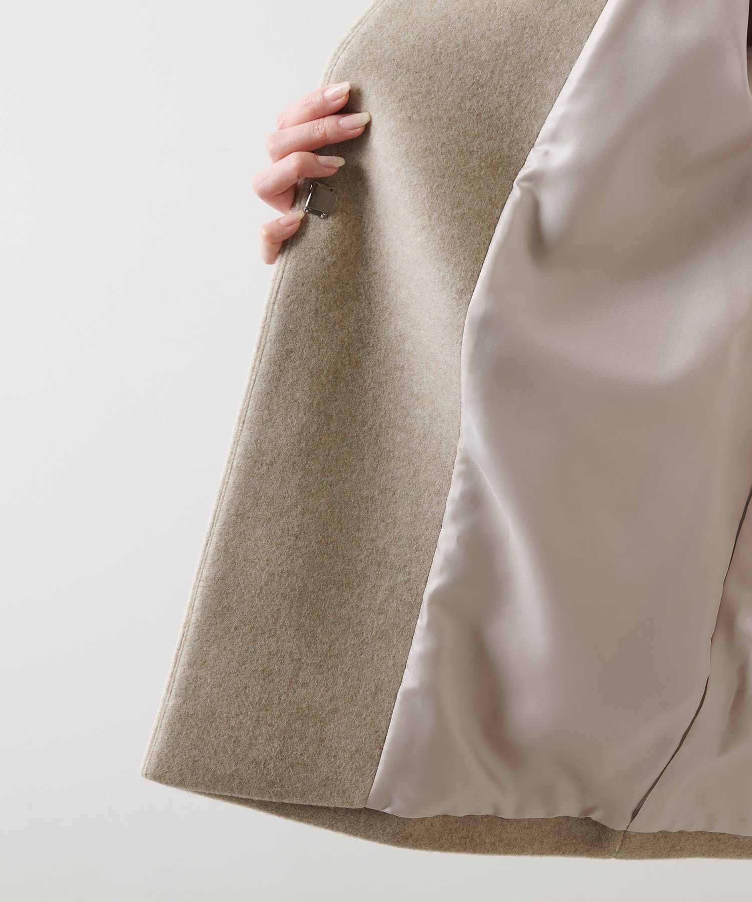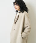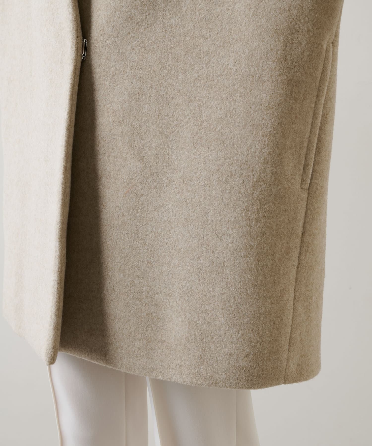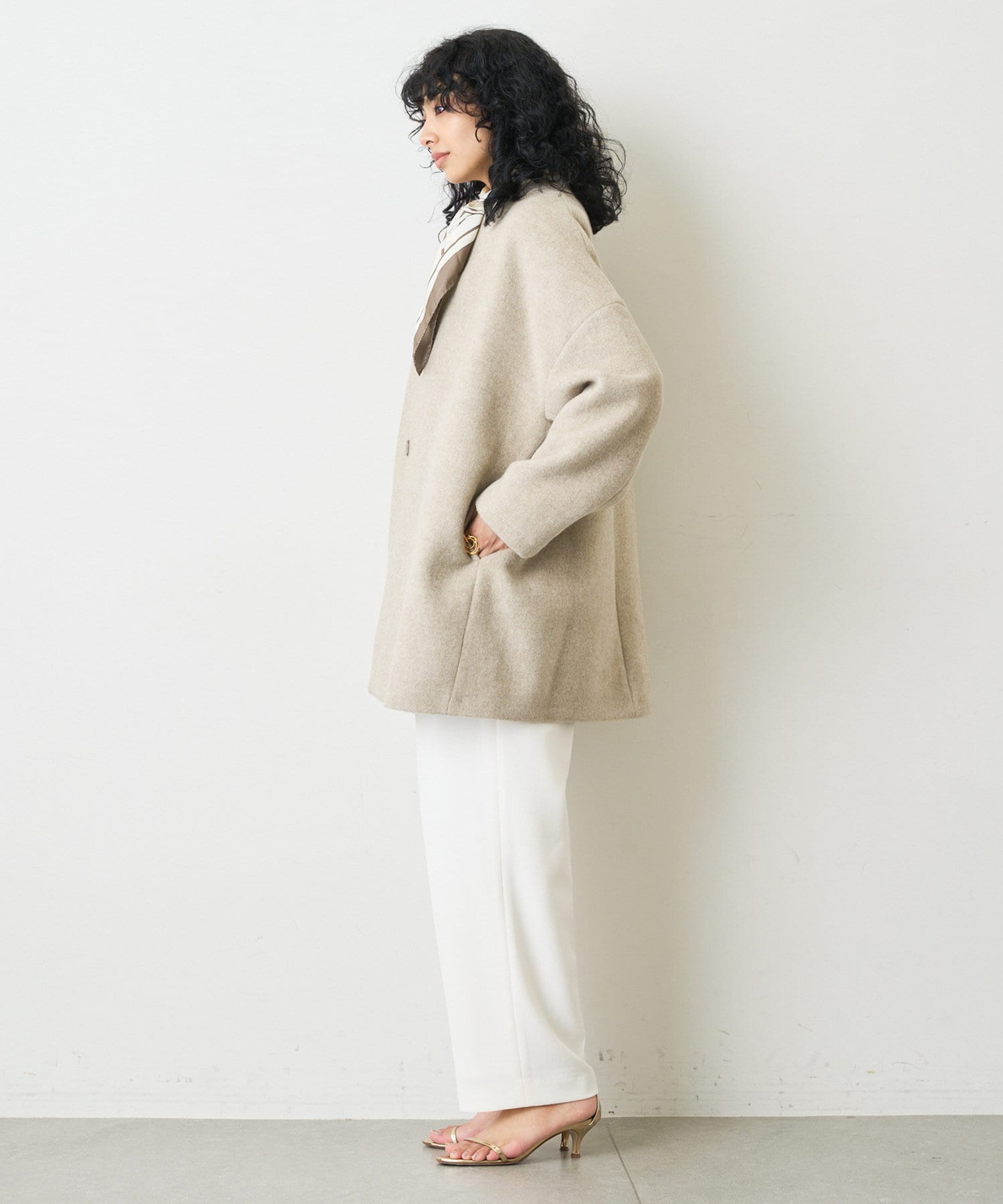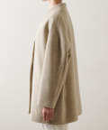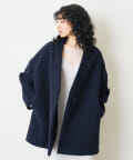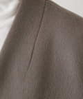 とても軽くサクッと羽織れるミドル丈コート。すっきり見えるVネックのノーカラーです。後ろの襟はしっかり高さがあるので冬も風が通りにくいです。ヒップラインにまるっとかかる着丈で、パンツでもスカートでもバランスも取りやすいですよ。