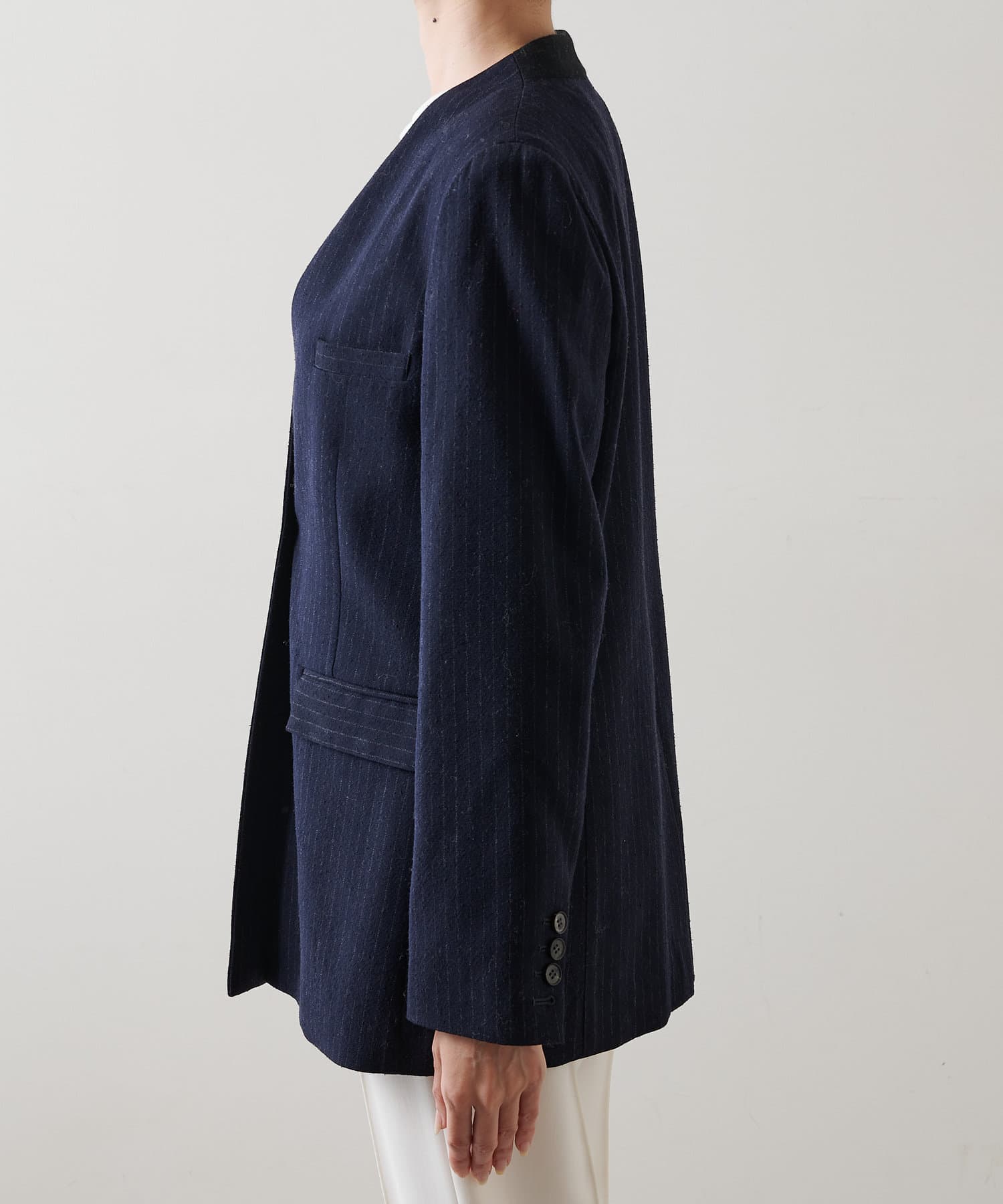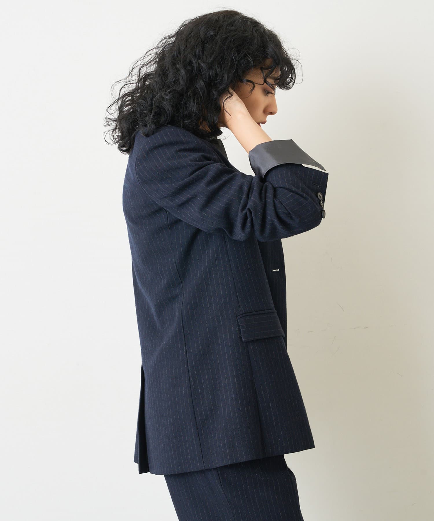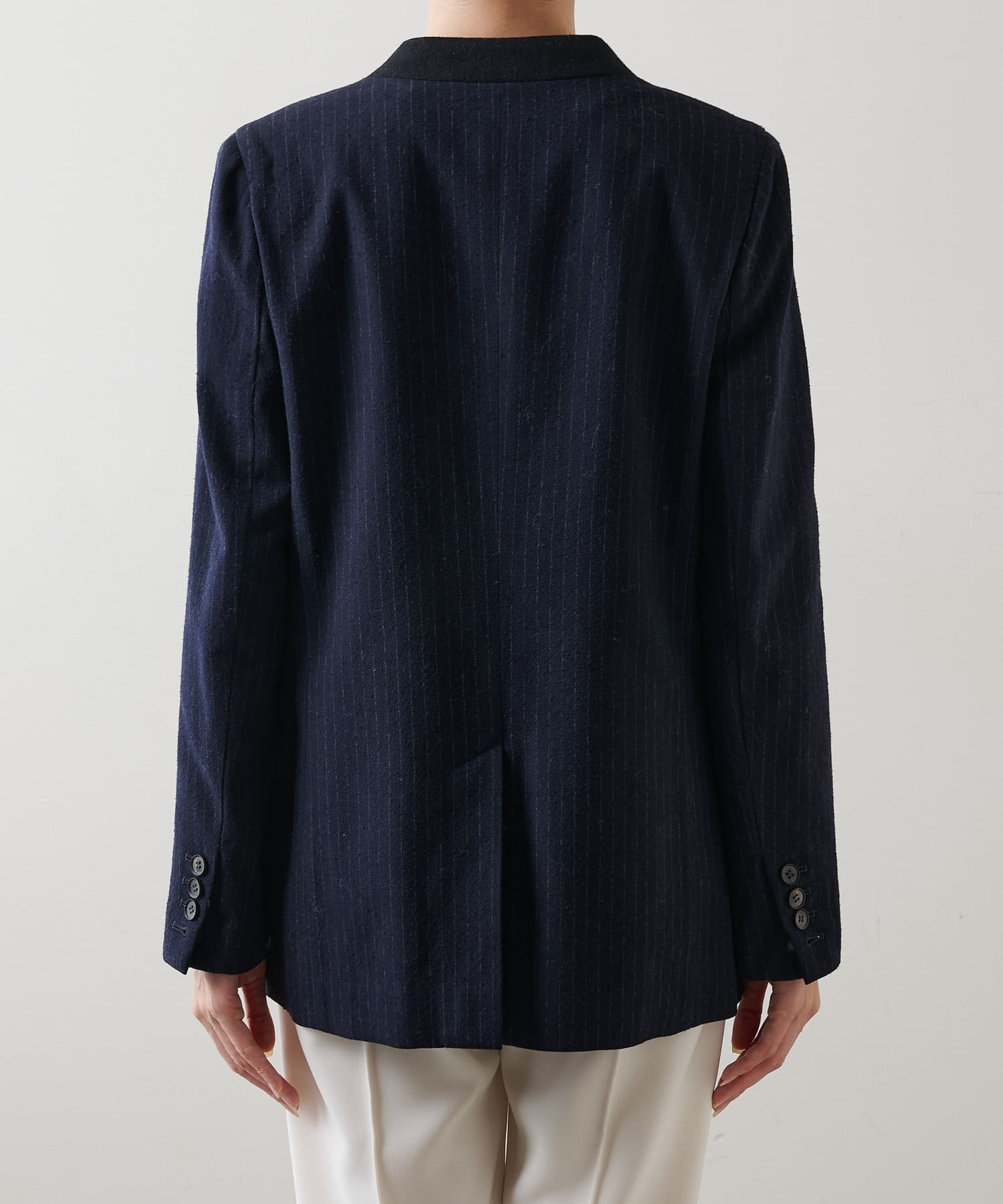 ■ナチュラル感のあるシルクウールで仕立てたピンストライプジャケット。