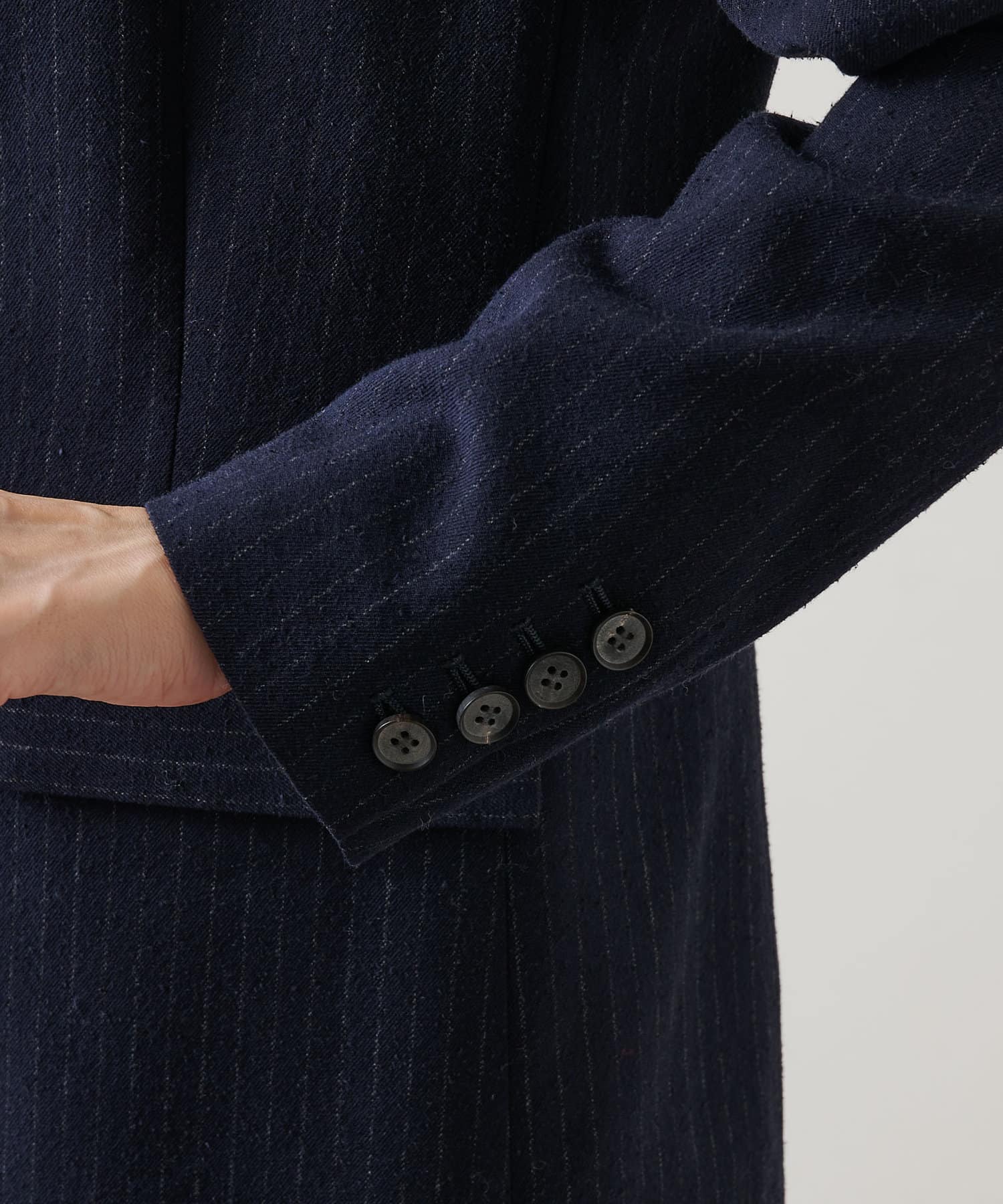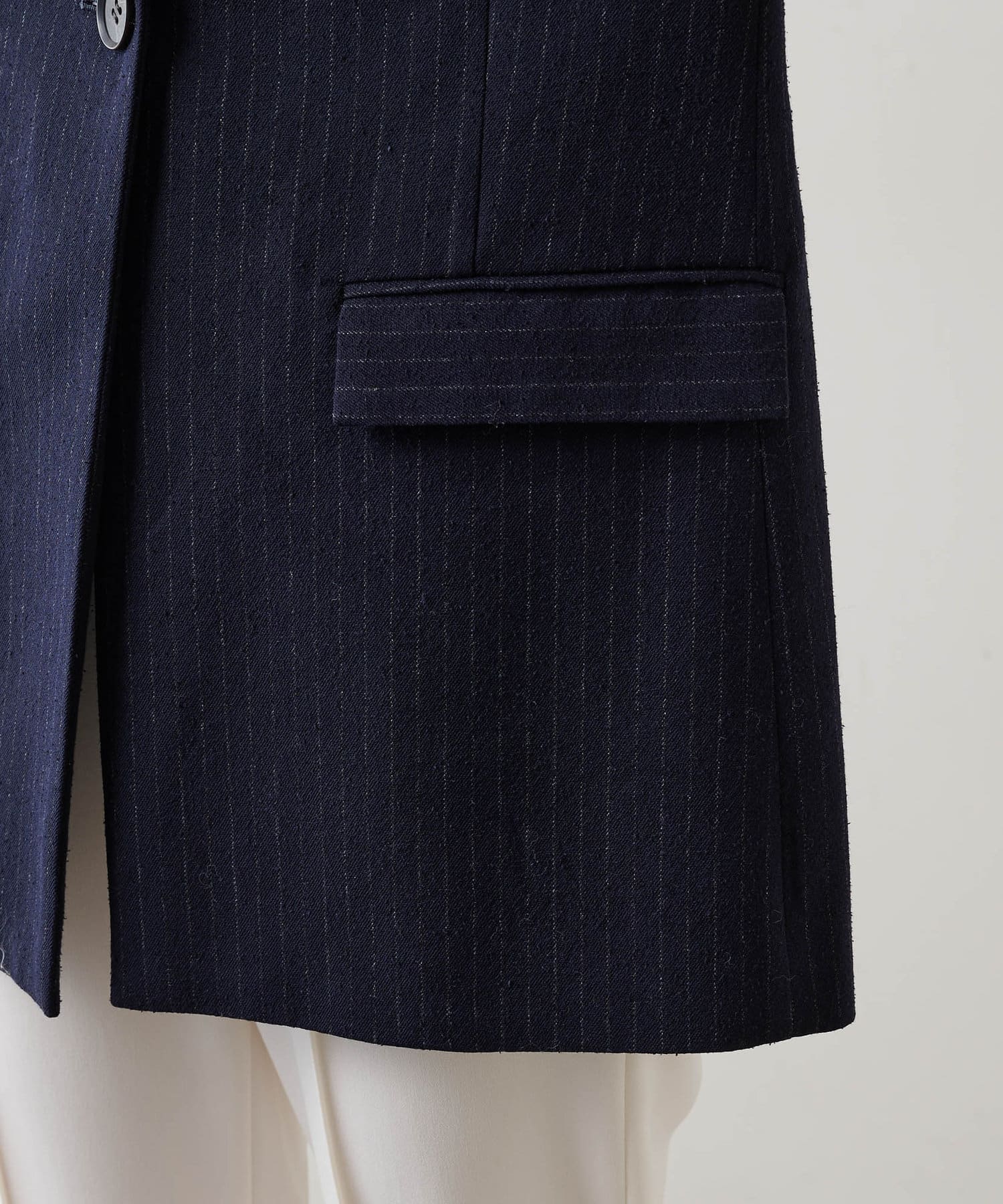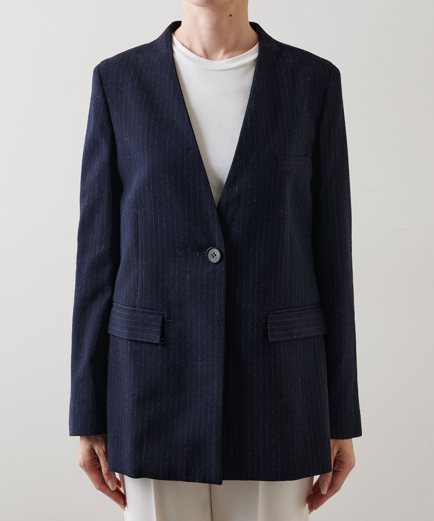 ■ナチュラル感のあるシルクウールで仕立てたピンストライプジャケット。