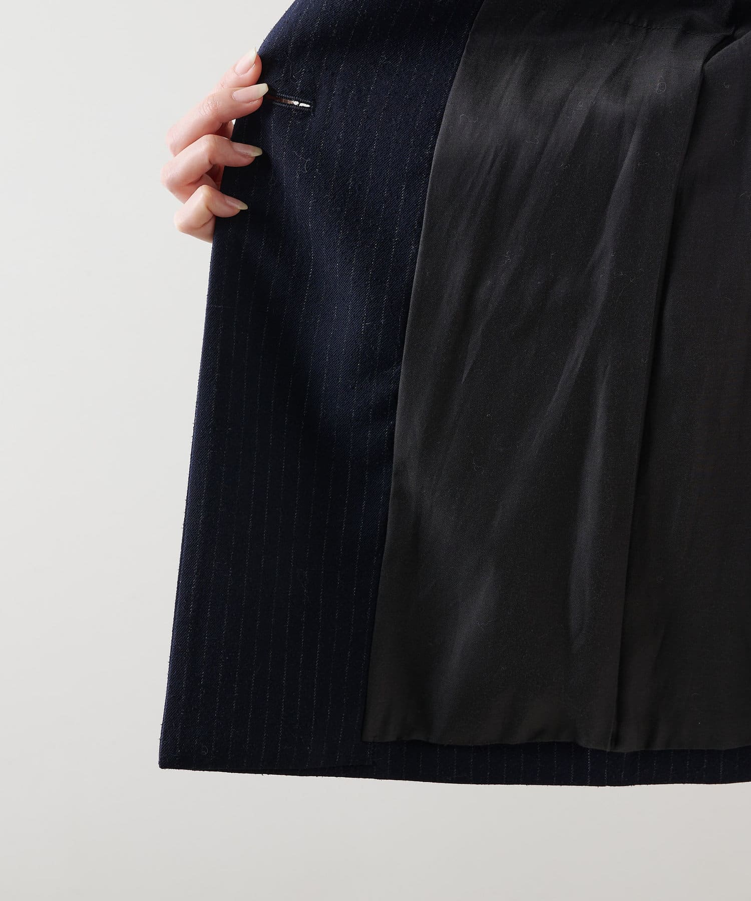 ピンストライプのシャープ感を引き立てるクラシカルなネイビー。