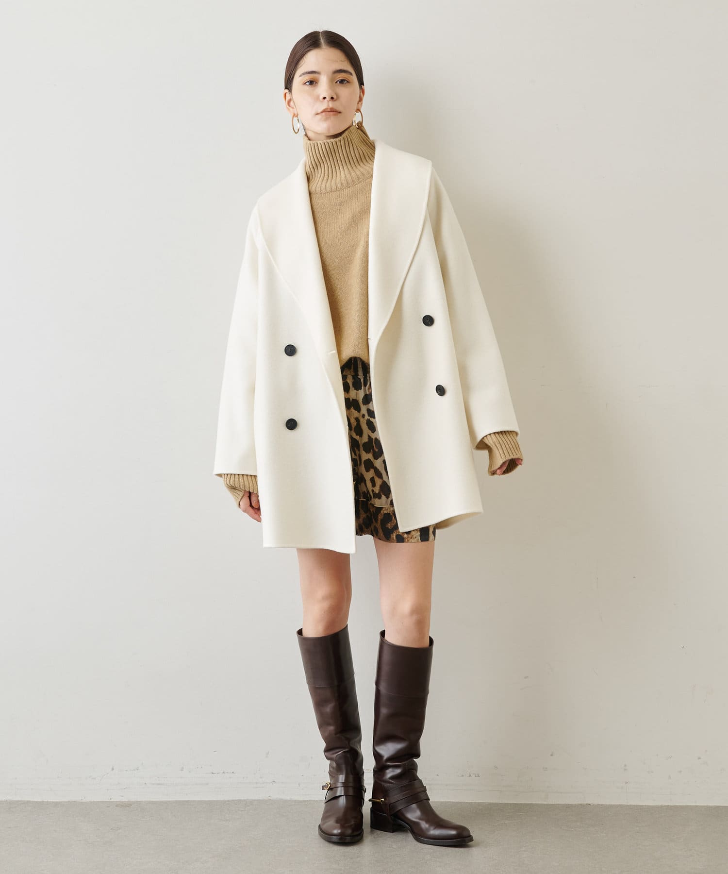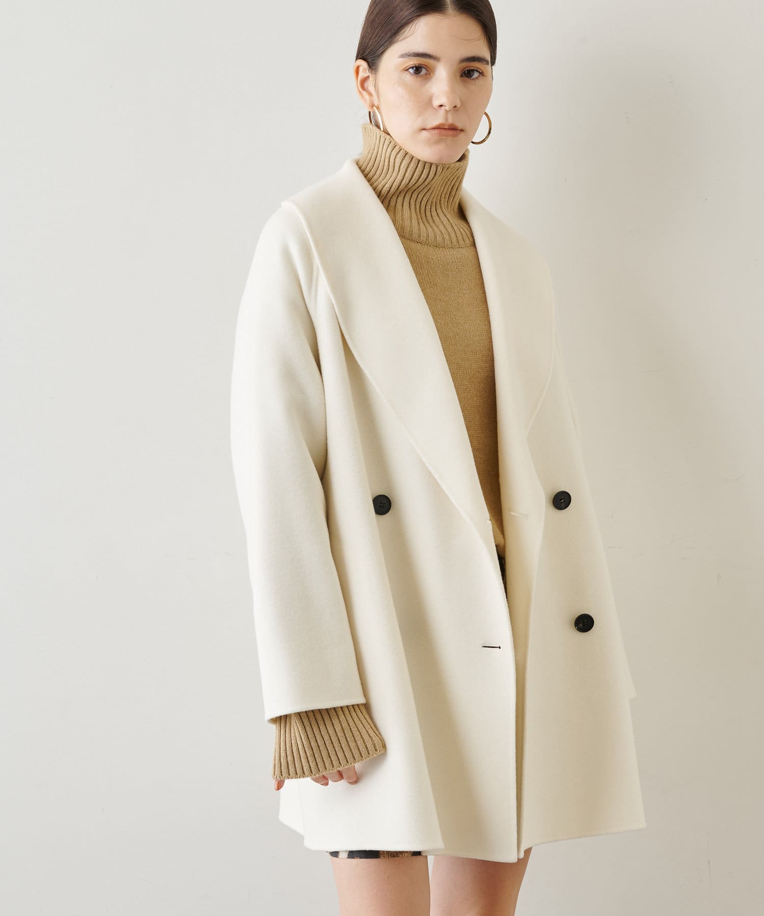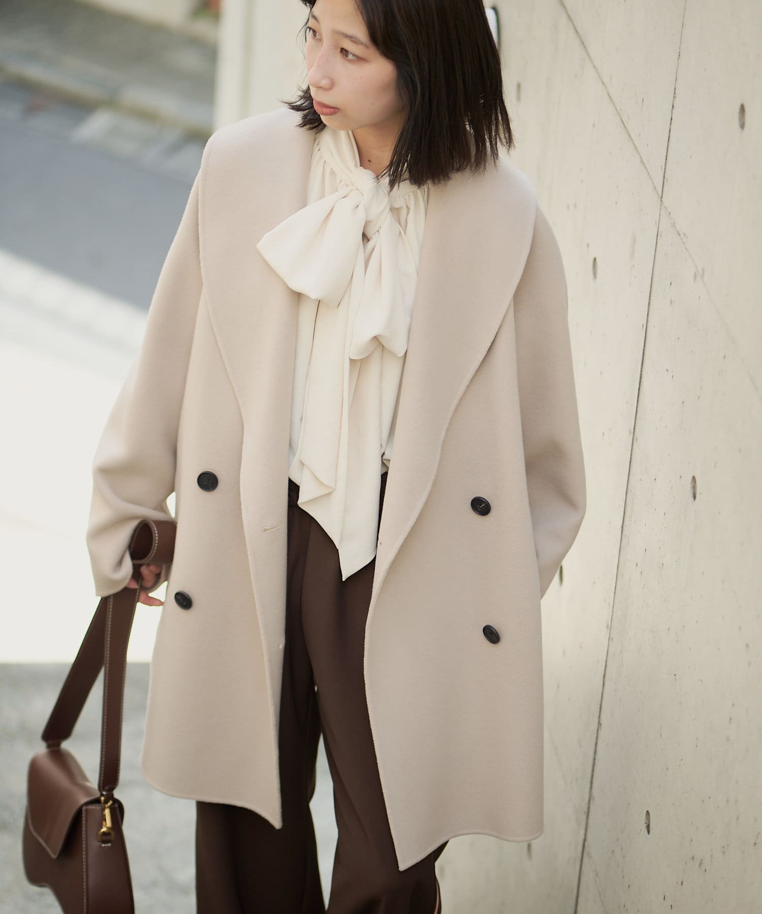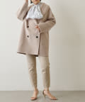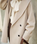 ■大きなラペルは顔周りを引き締め、オーバーサイズの横広なデザインでトレンドライクな印象に。