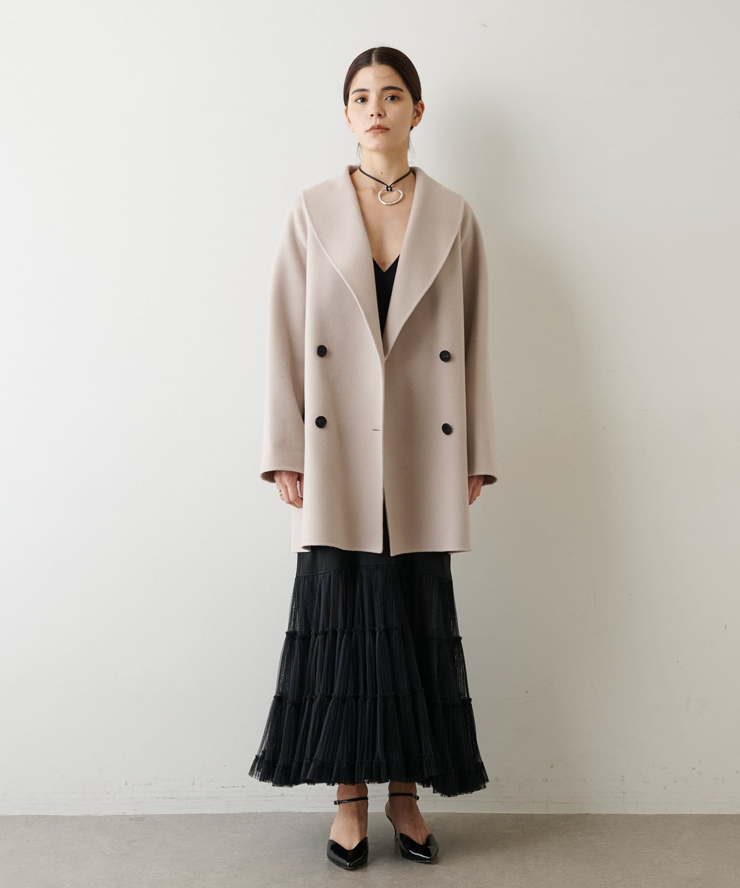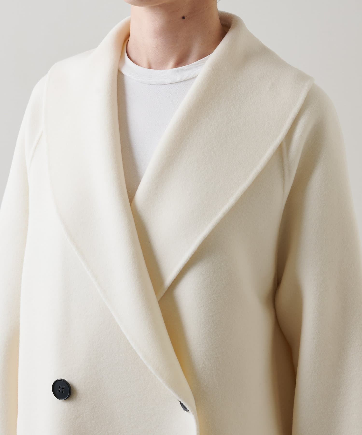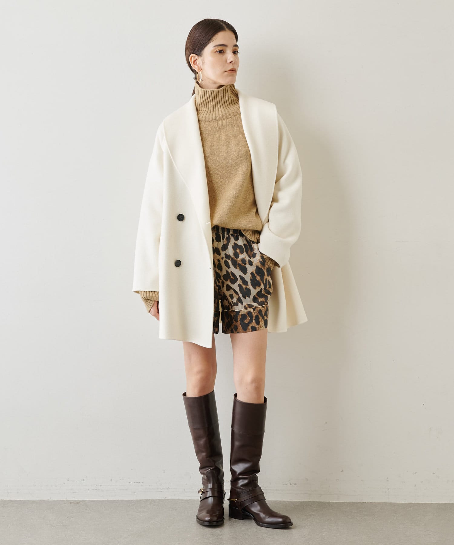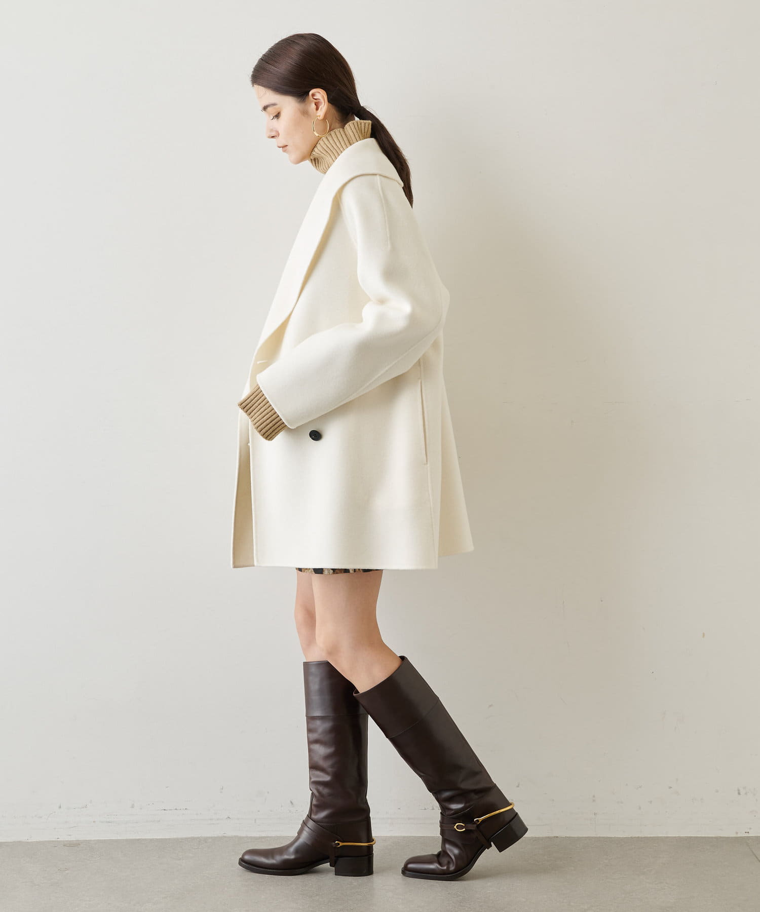 ■大きなラペルは顔周りを引き締め、オーバーサイズの横広なデザインでトレンドライクな印象に。