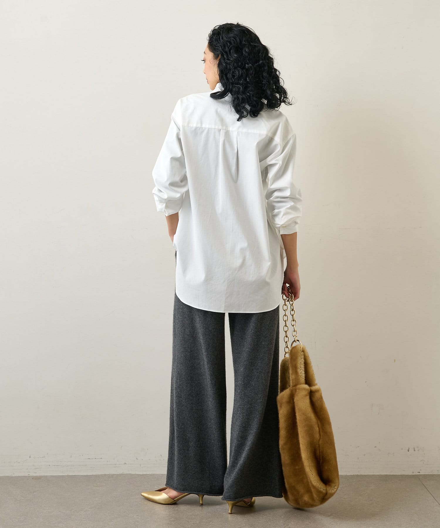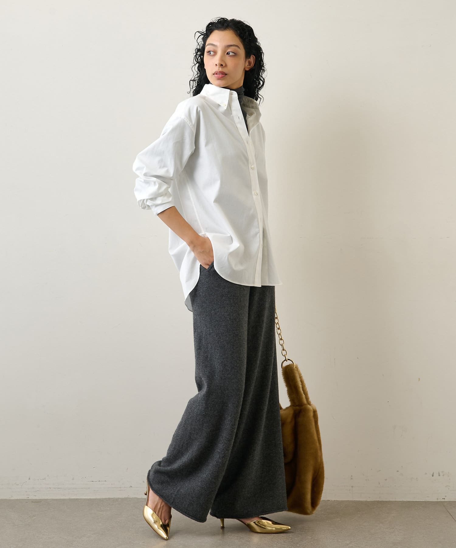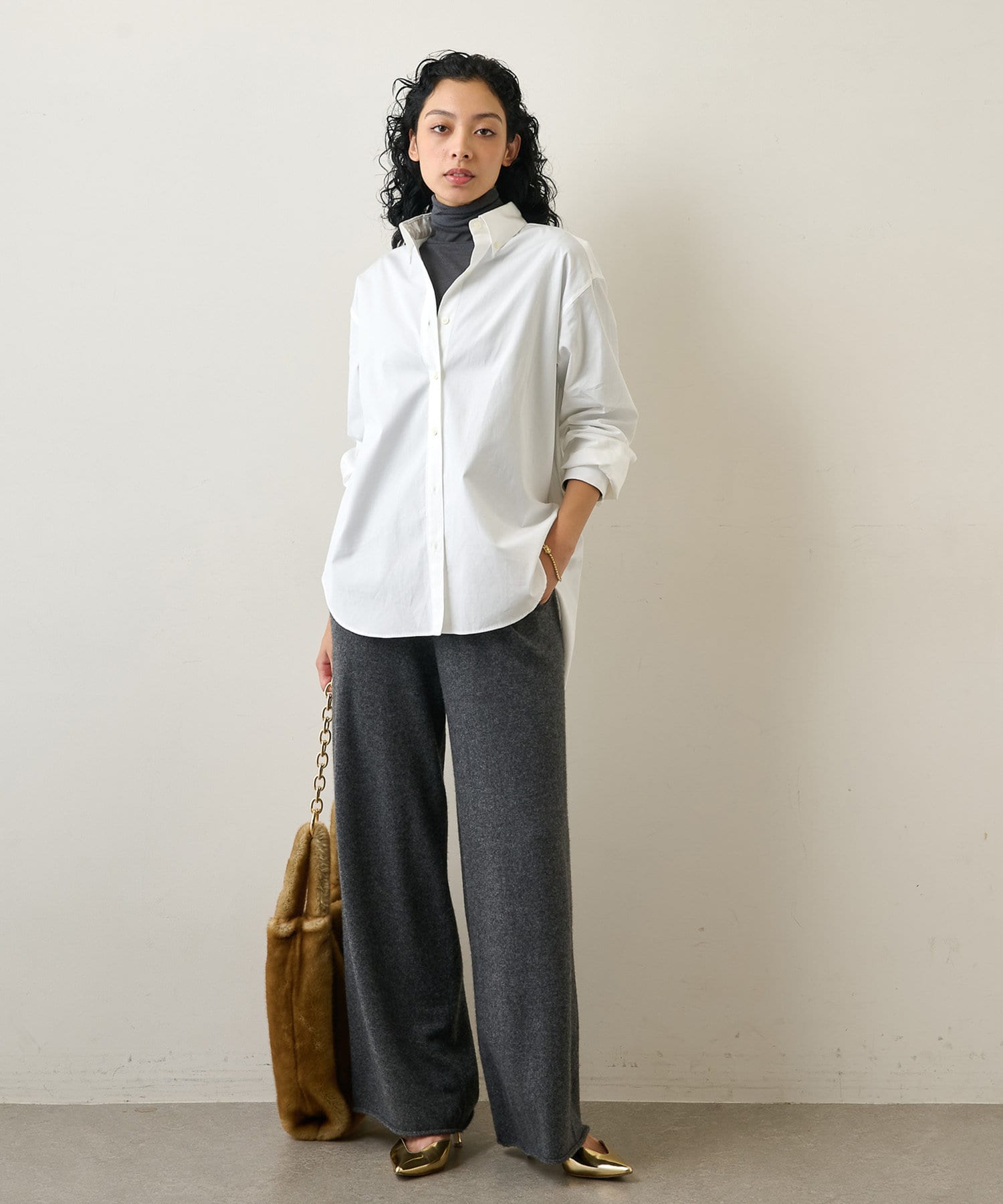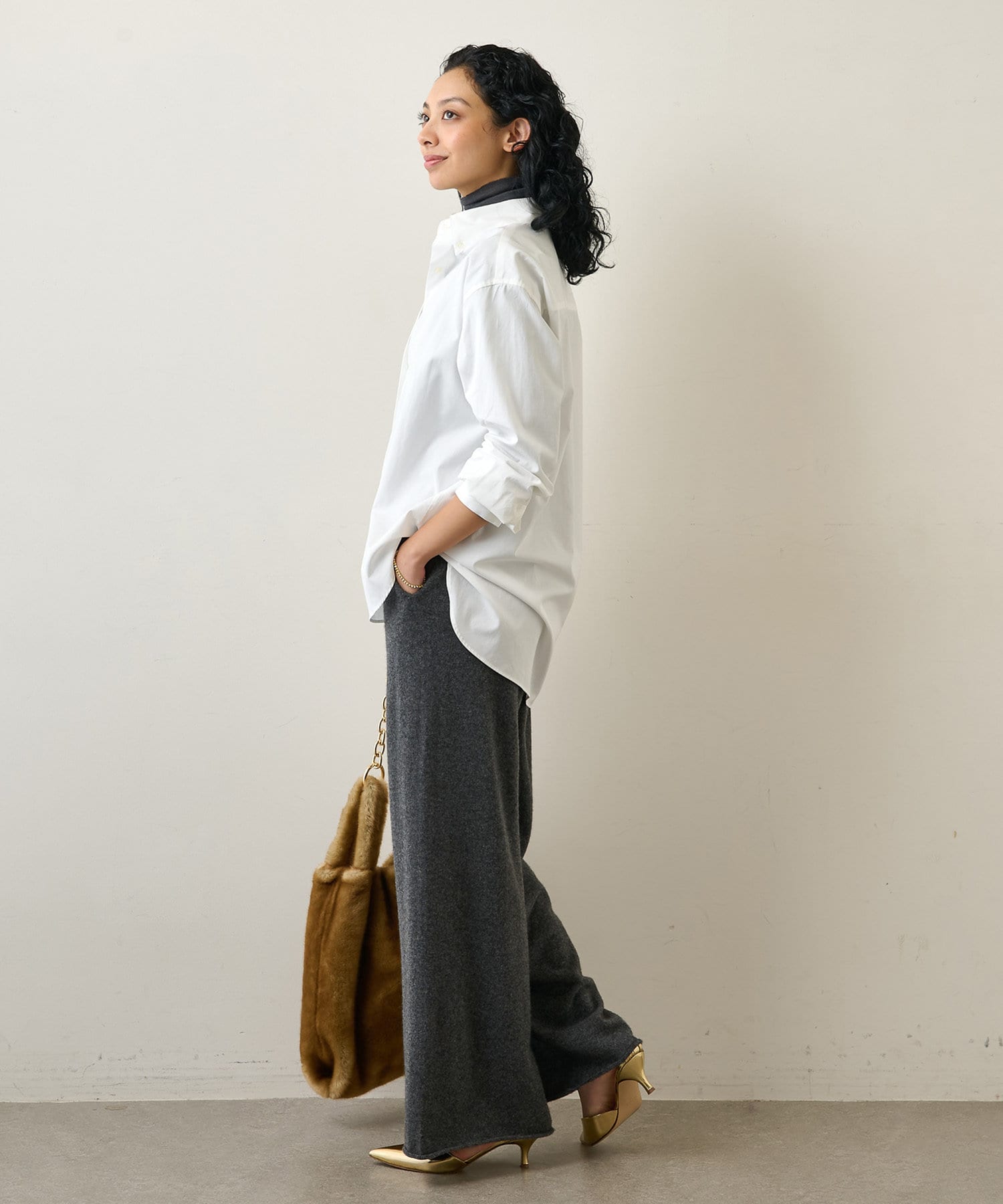 ■程よくゆとりのあるシルエットと、柔らかく流れるカシミヤの素材感がコーディネートに抜け感をプラス。