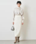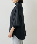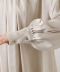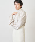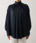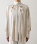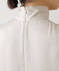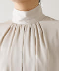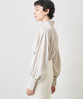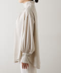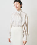 ■上品な光沢のサテン素材が美しく映えるハイネックブラウス。