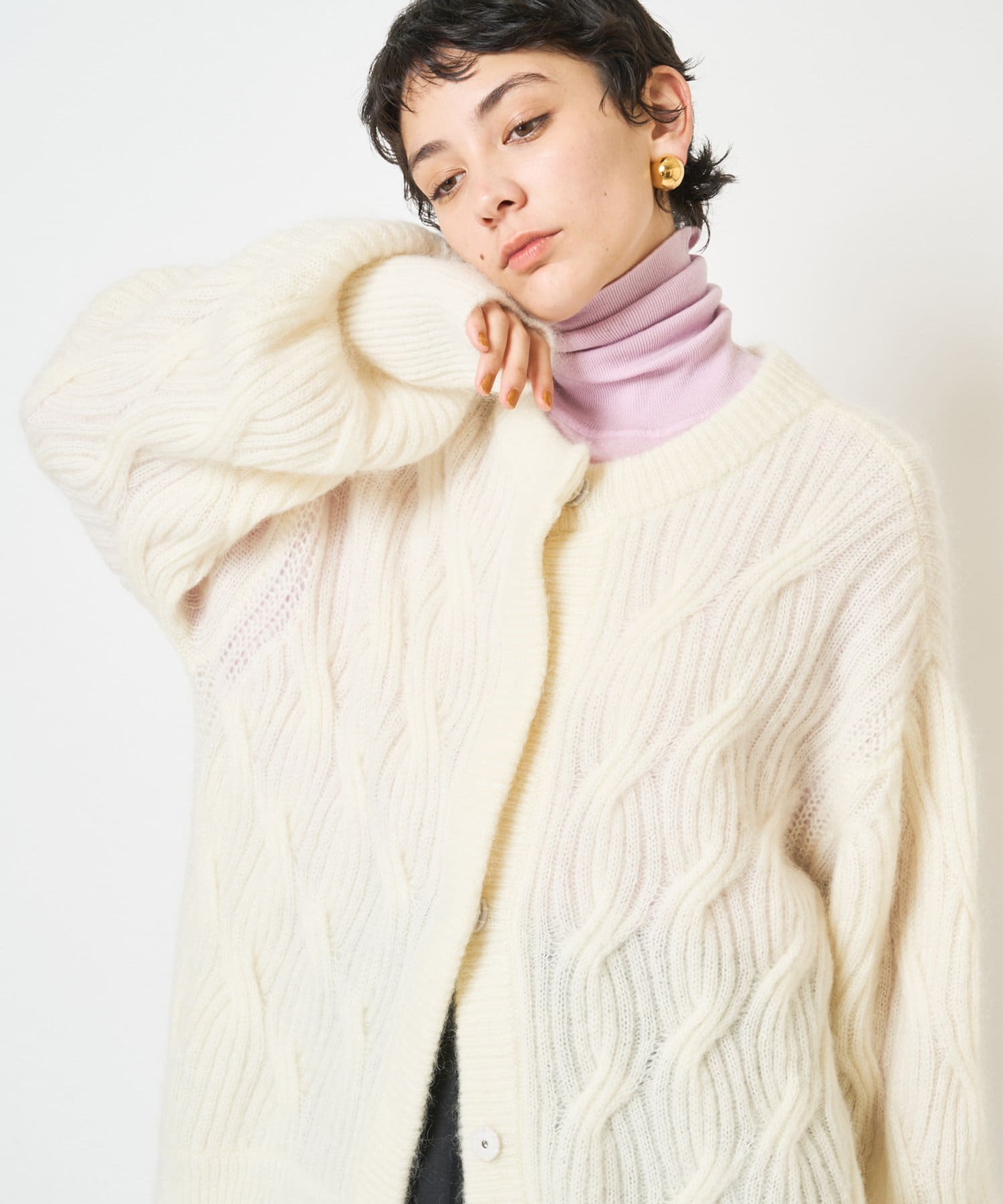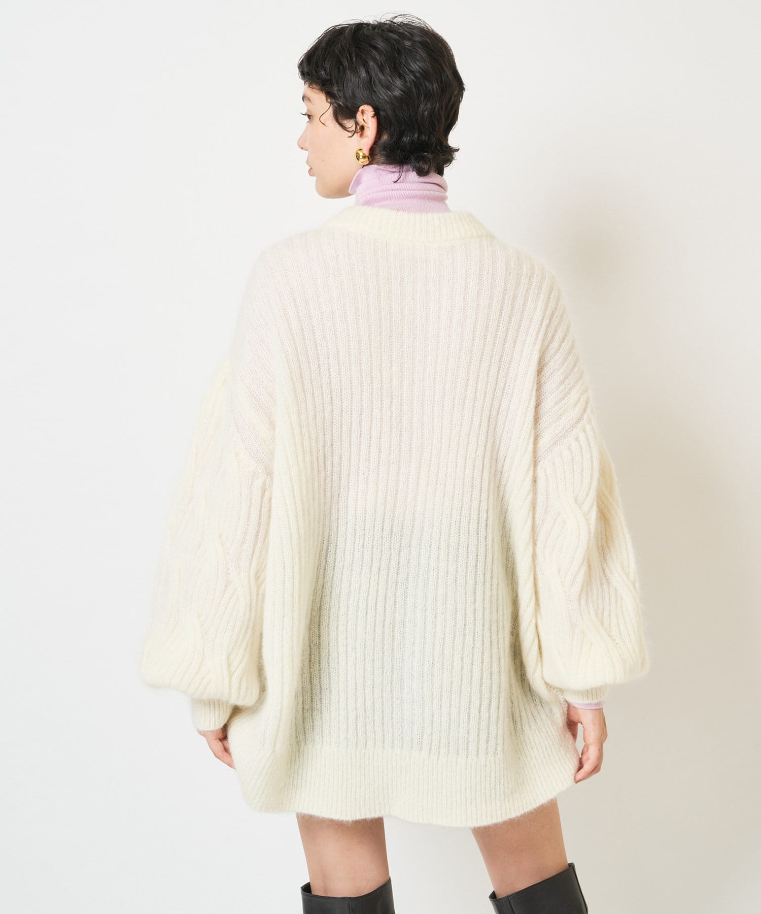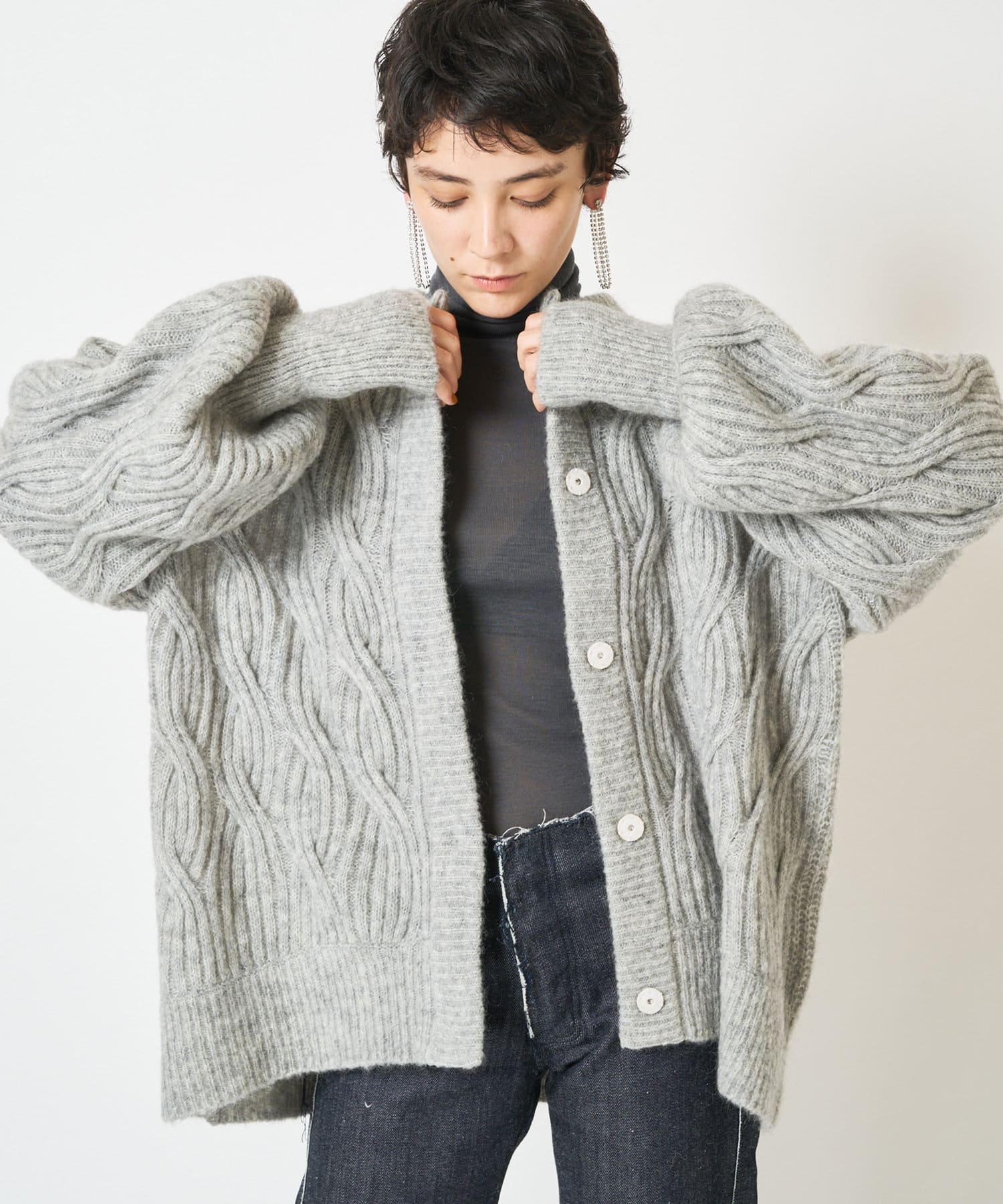 他にはないケーブルの表情が映えるモヘヤカーディガン