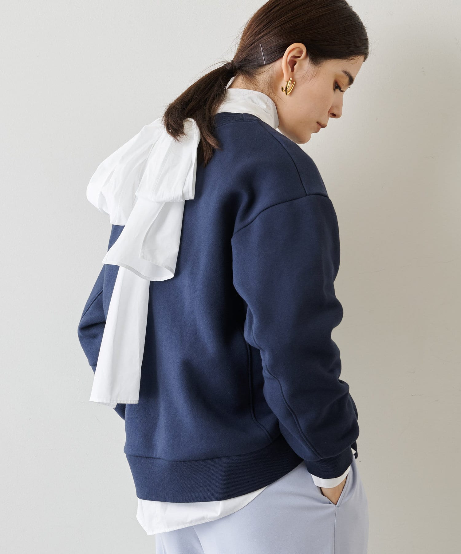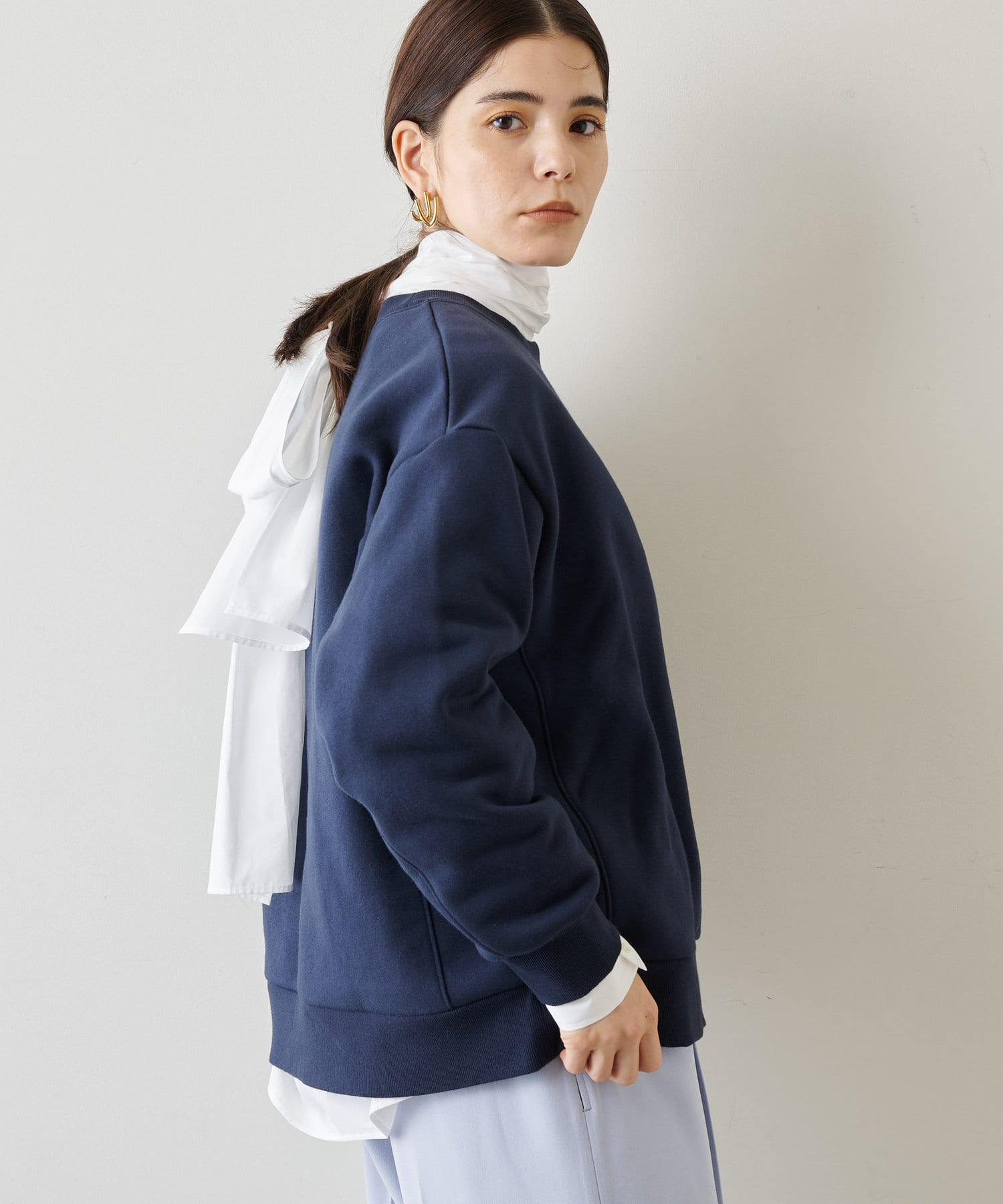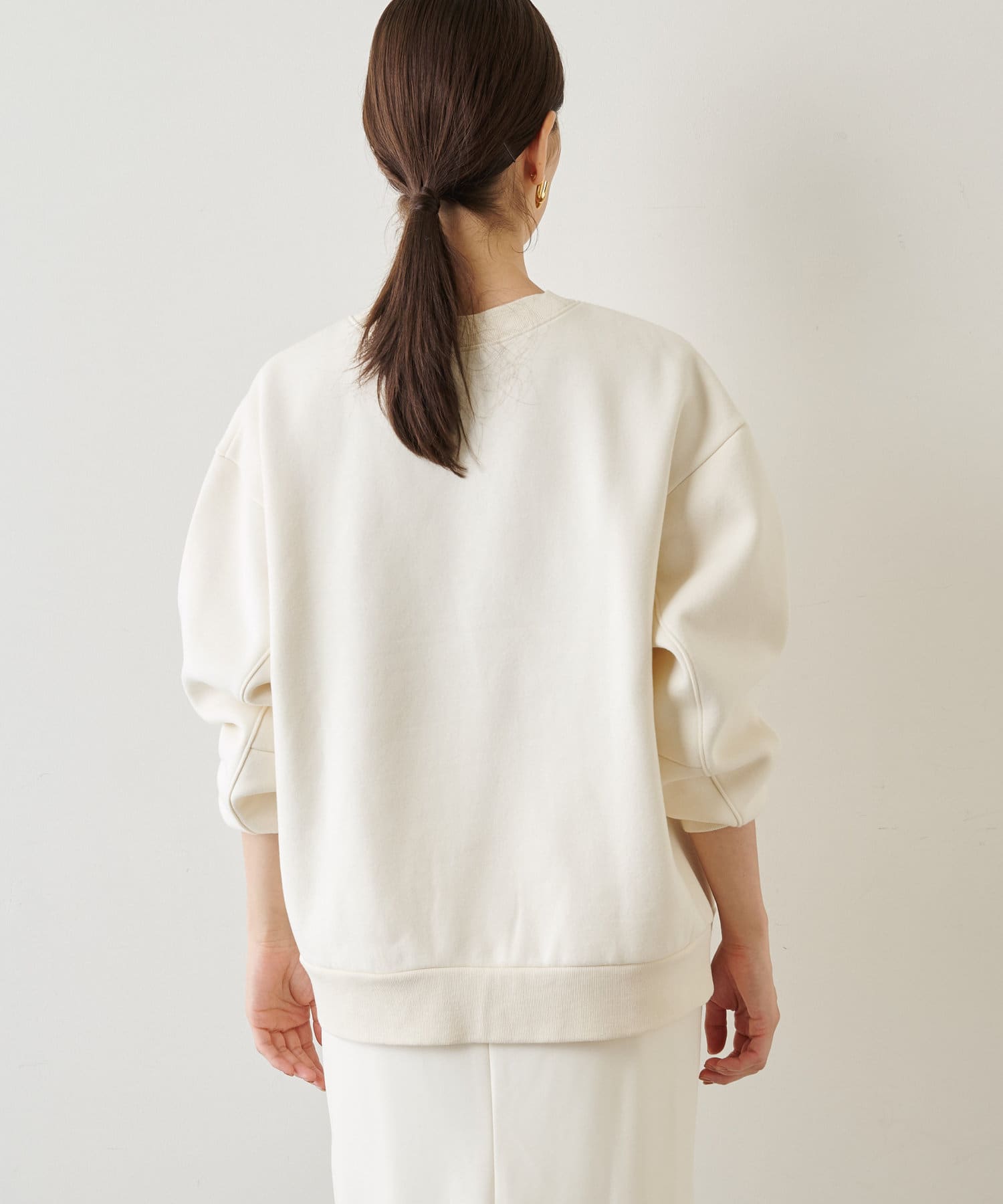 似たようなスウェットが数枚あるのですが、店頭で見てから気になって、結局オンラインで購入。スカートにもパンツにも合わせやすい着丈感です。そして何よりこの色味がいい!大人の肌をキレイに見せてくれるまろやかなトーンです。襟ぐりが開きすぎないのも上品見えのポイントです!