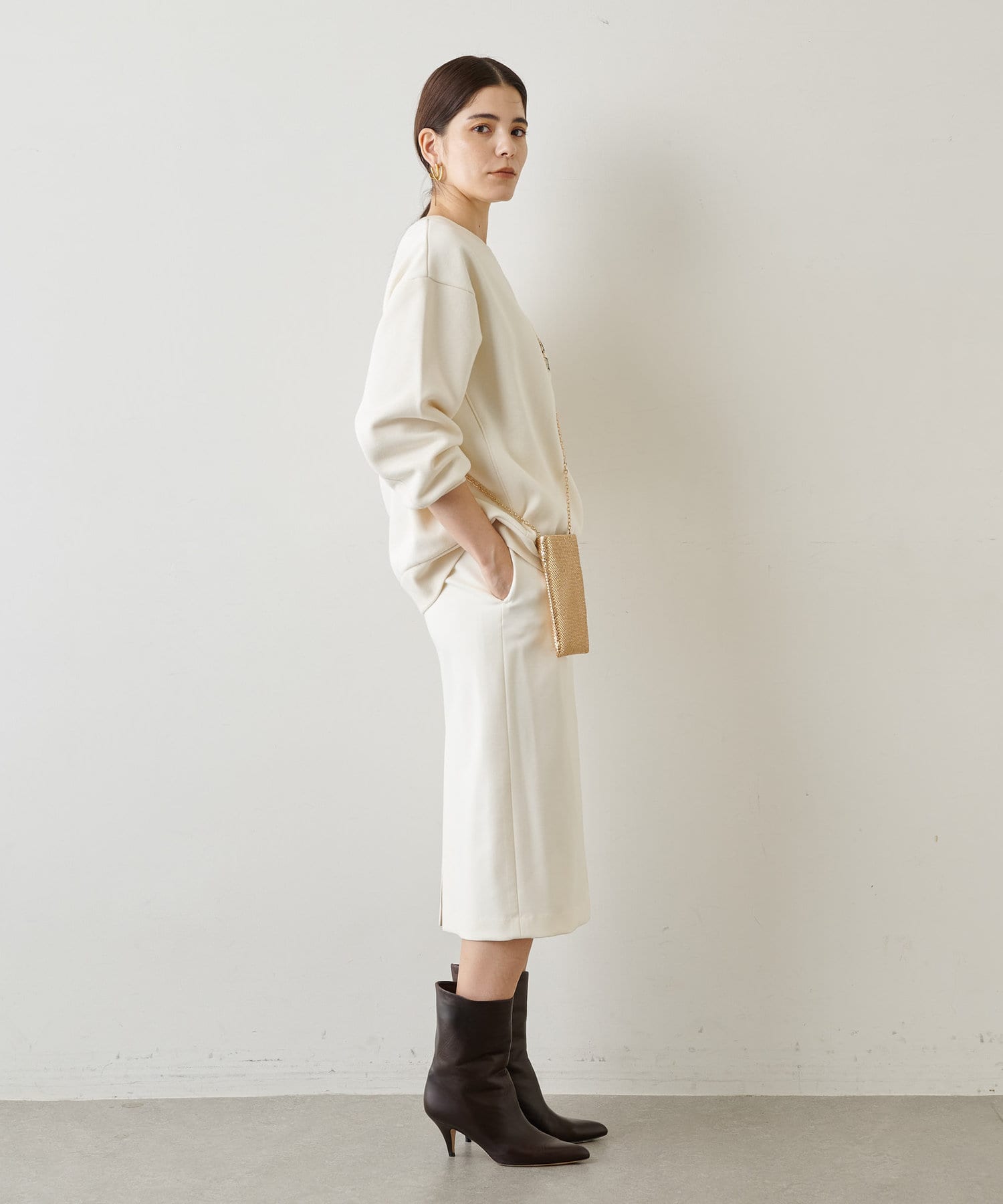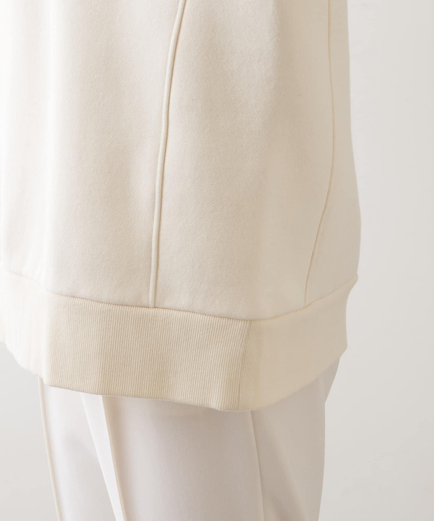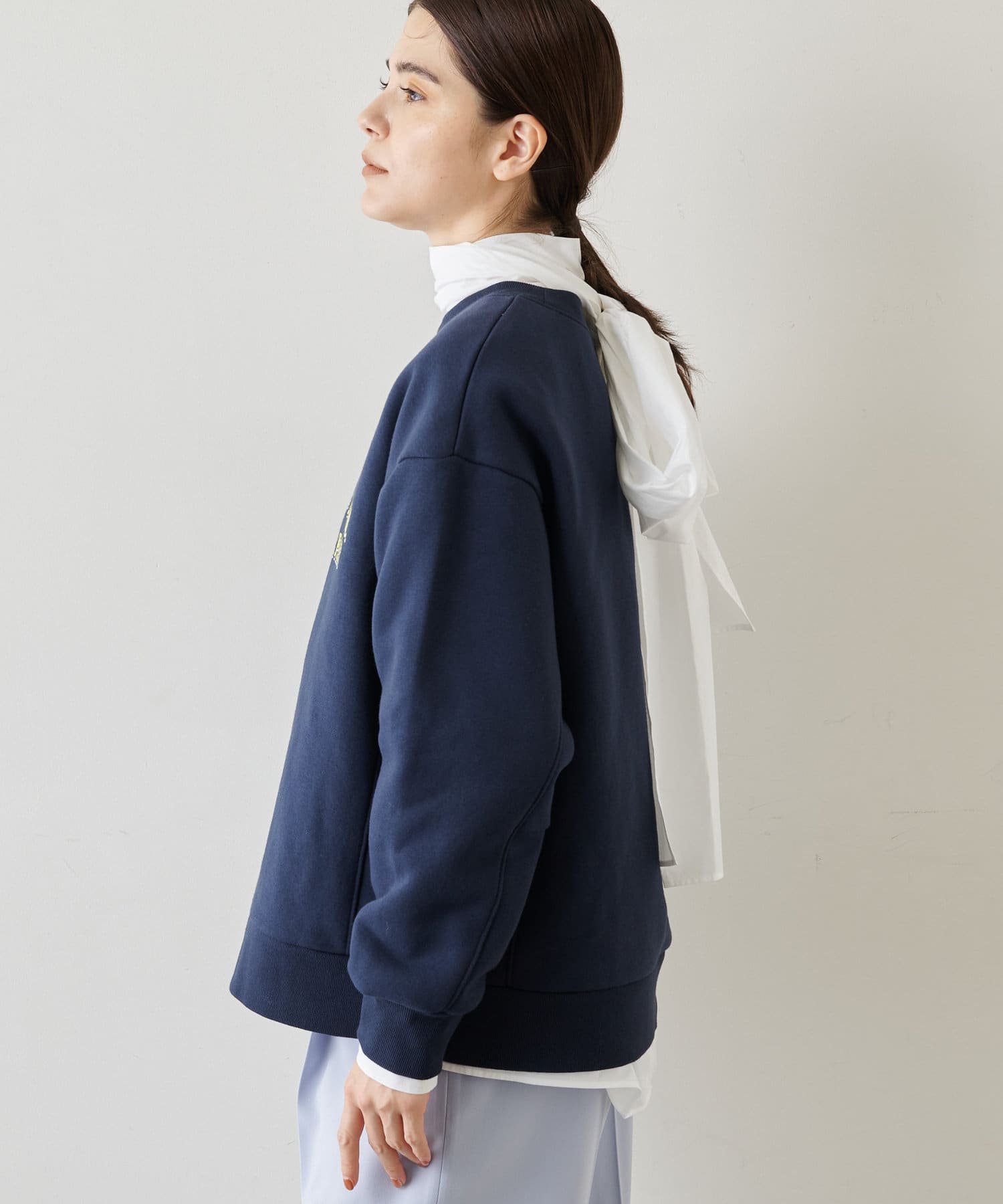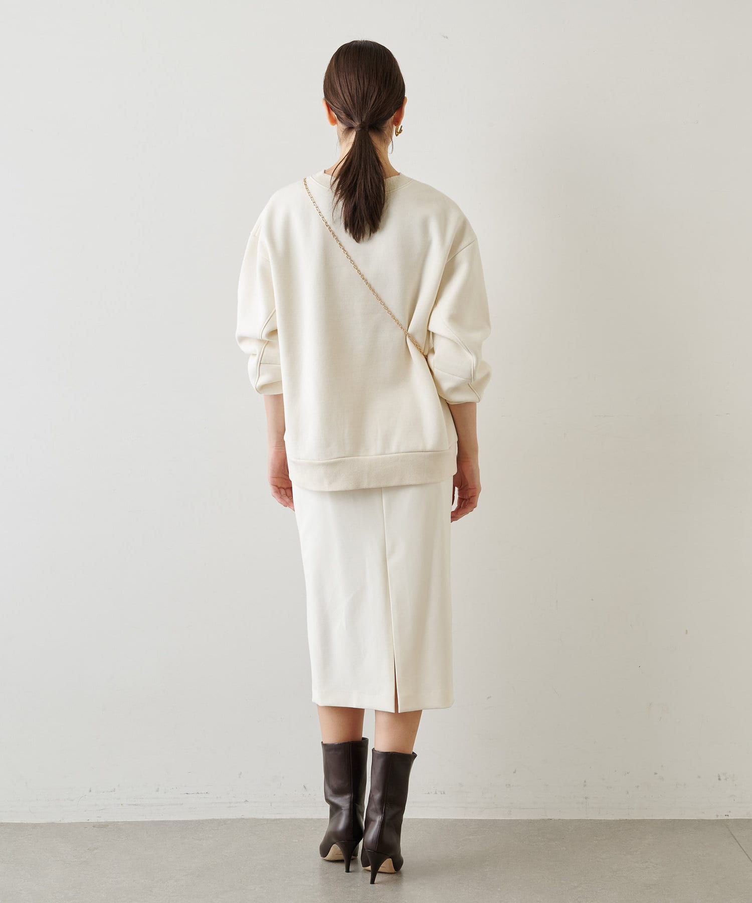 似たようなスウェットが数枚あるのですが、店頭で見てから気になって、結局オンラインで購入。スカートにもパンツにも合わせやすい着丈感です。そして何よりこの色味がいい!大人の肌をキレイに見せてくれるまろやかなトーンです。襟ぐりが開きすぎないのも上品見えのポイントです!