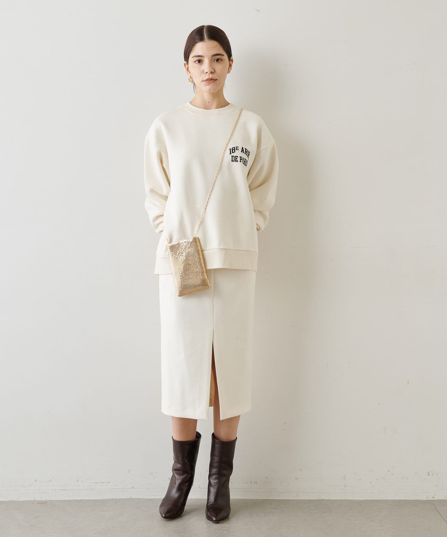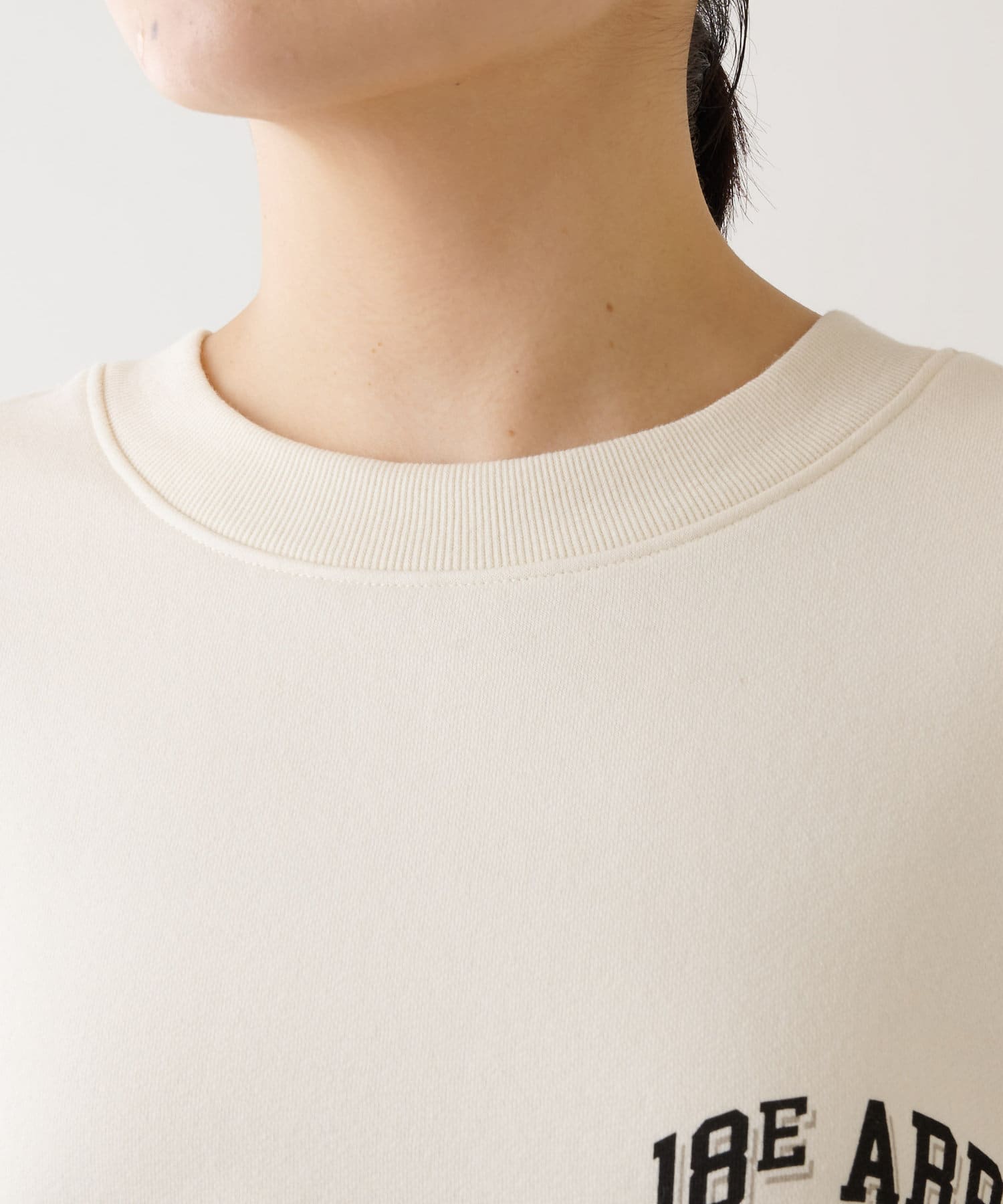 ロゴがアクセントになるスウェット。オフホワイトは柔らかなホワイトトーンがカジュアル過ぎず着こなしやすいです。タイトスカートなど女性らしいアイテムに合わせるのもおすすめですよ!
