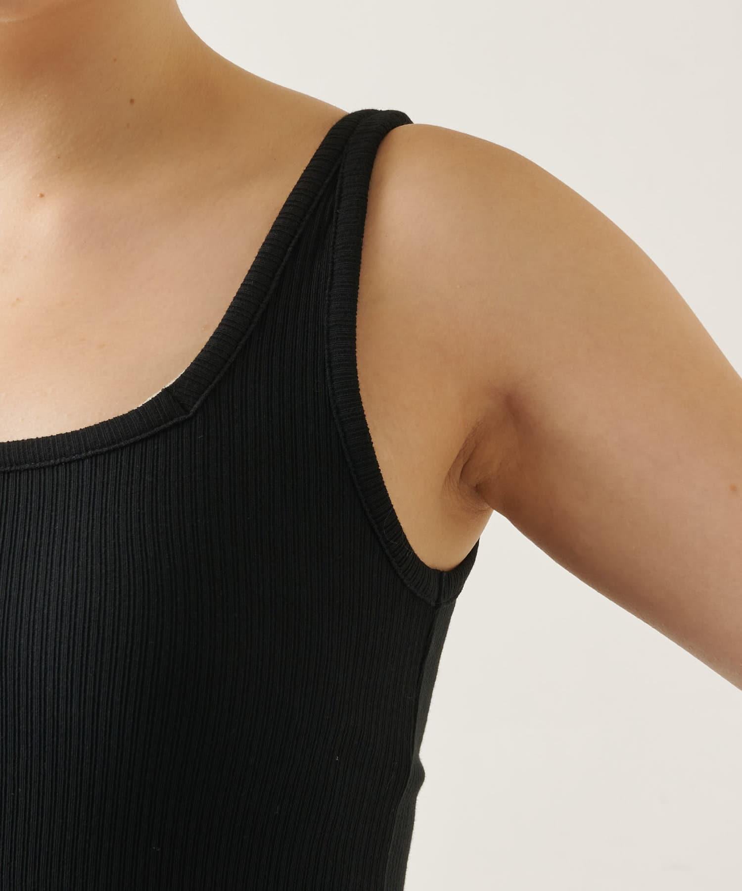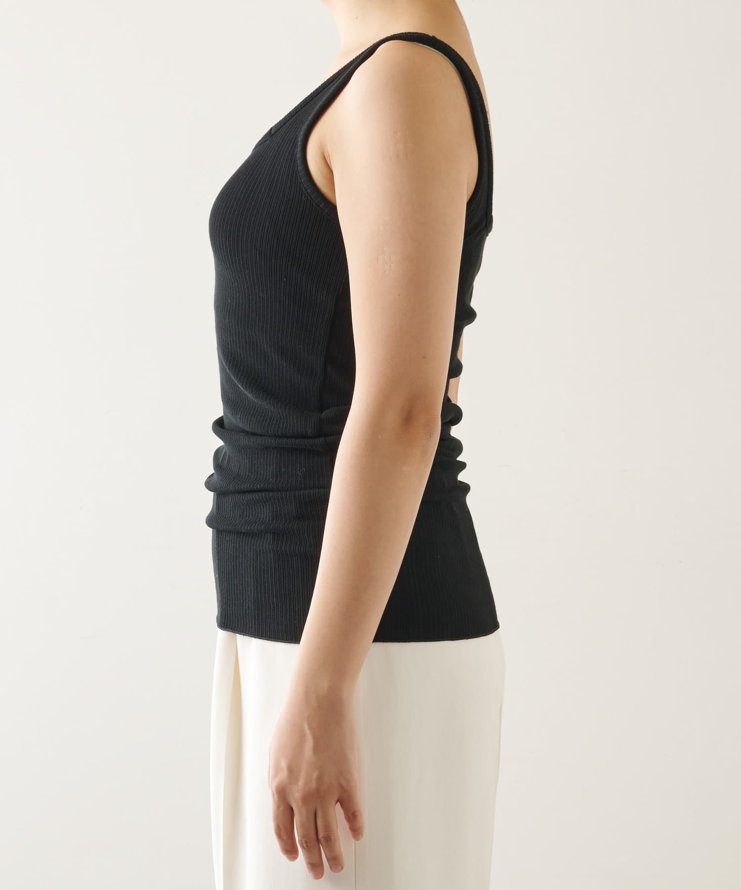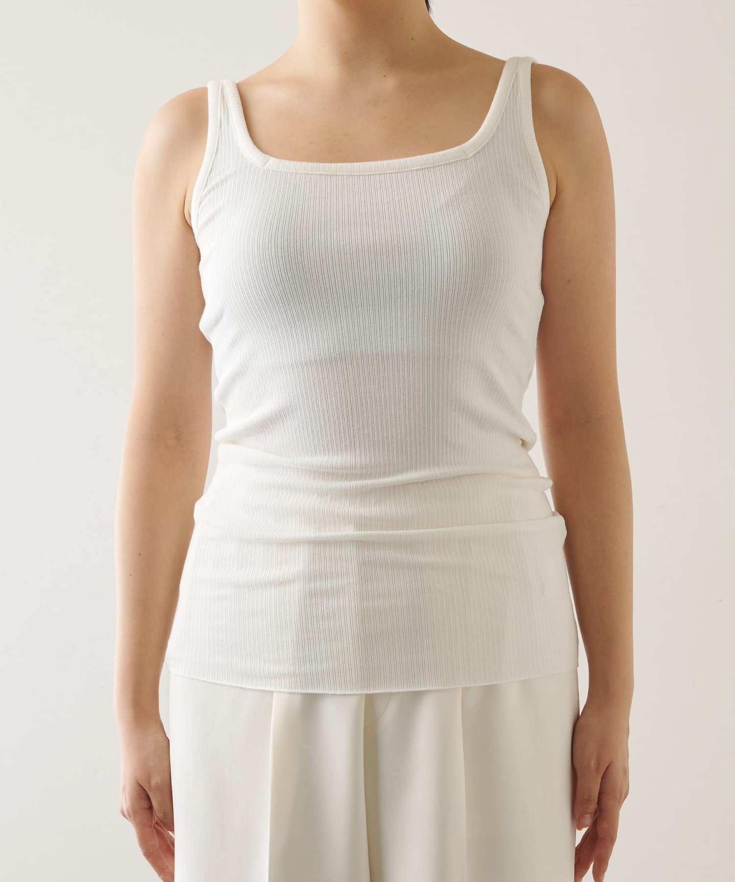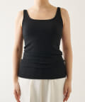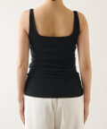 ■ピッチの細いリブでカジュアル感を抑え、上品な印象に仕上げたタンクトップ。