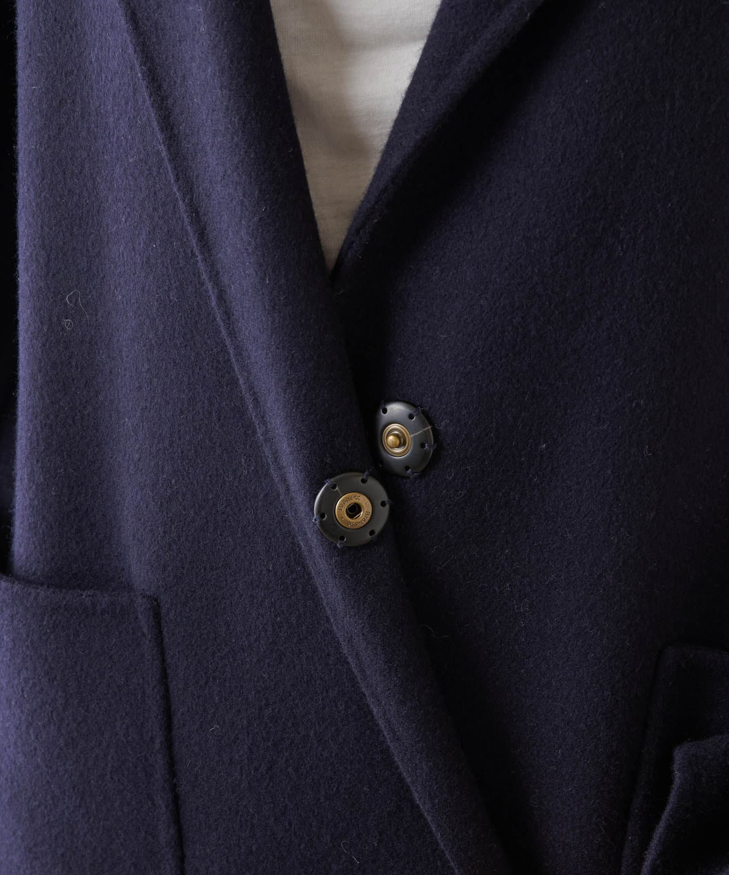 ■ロング丈のオーバーシルエットとテーラードカラーがマスキュリンな表情の一着。