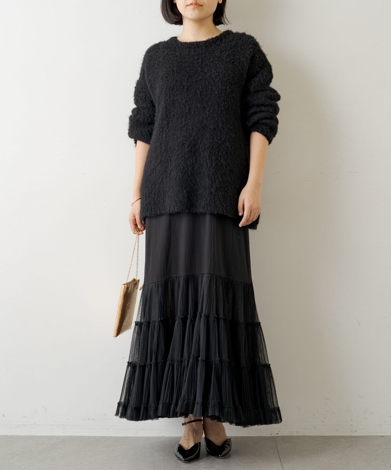 ■冬はニットを重ねたり、コートの裾からチュールを覗かせるスタイルもおすすめ。
