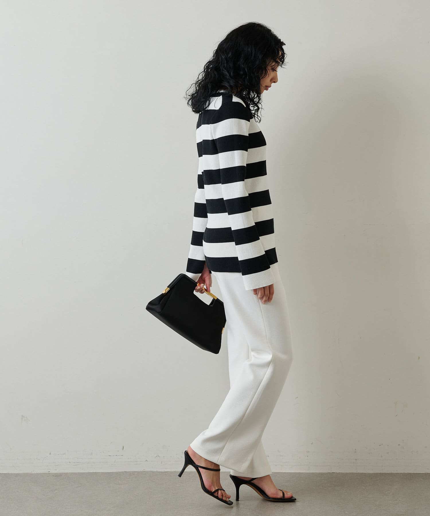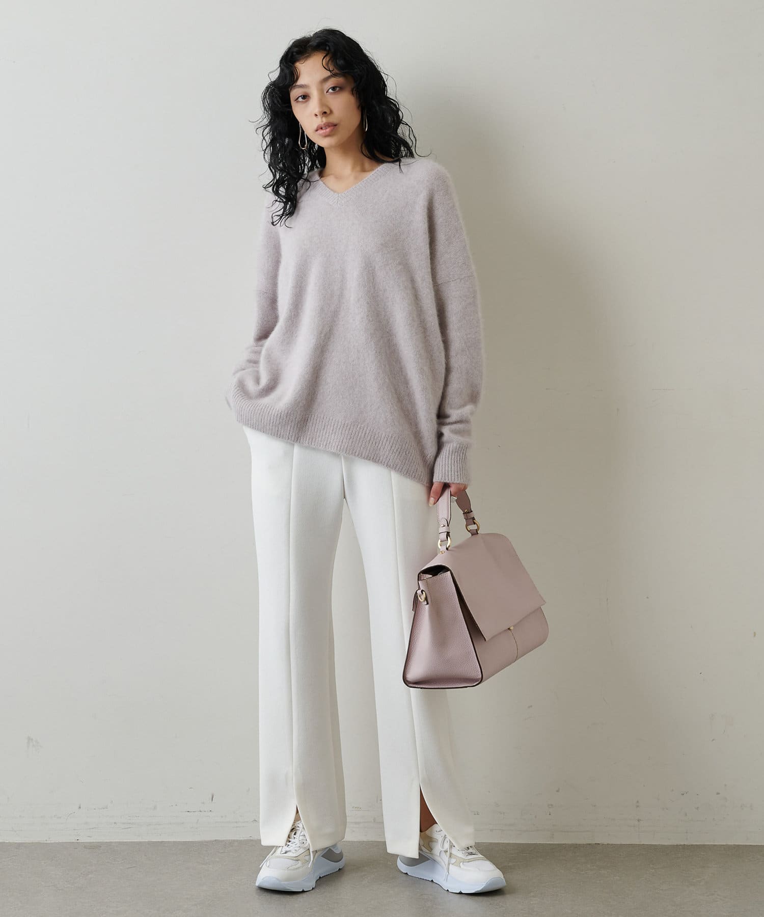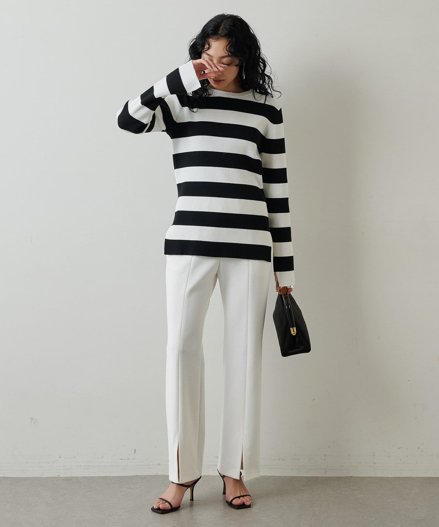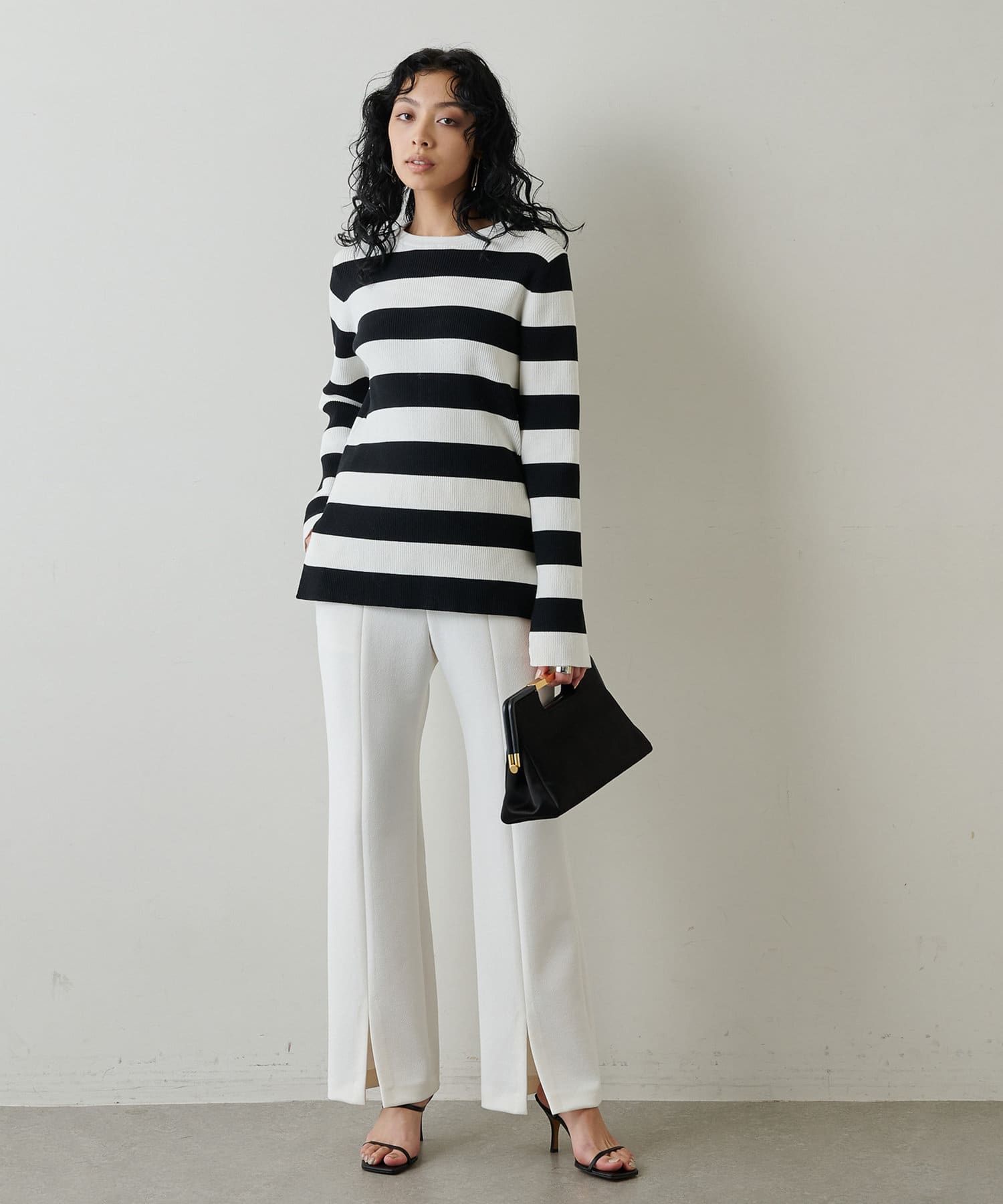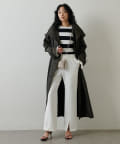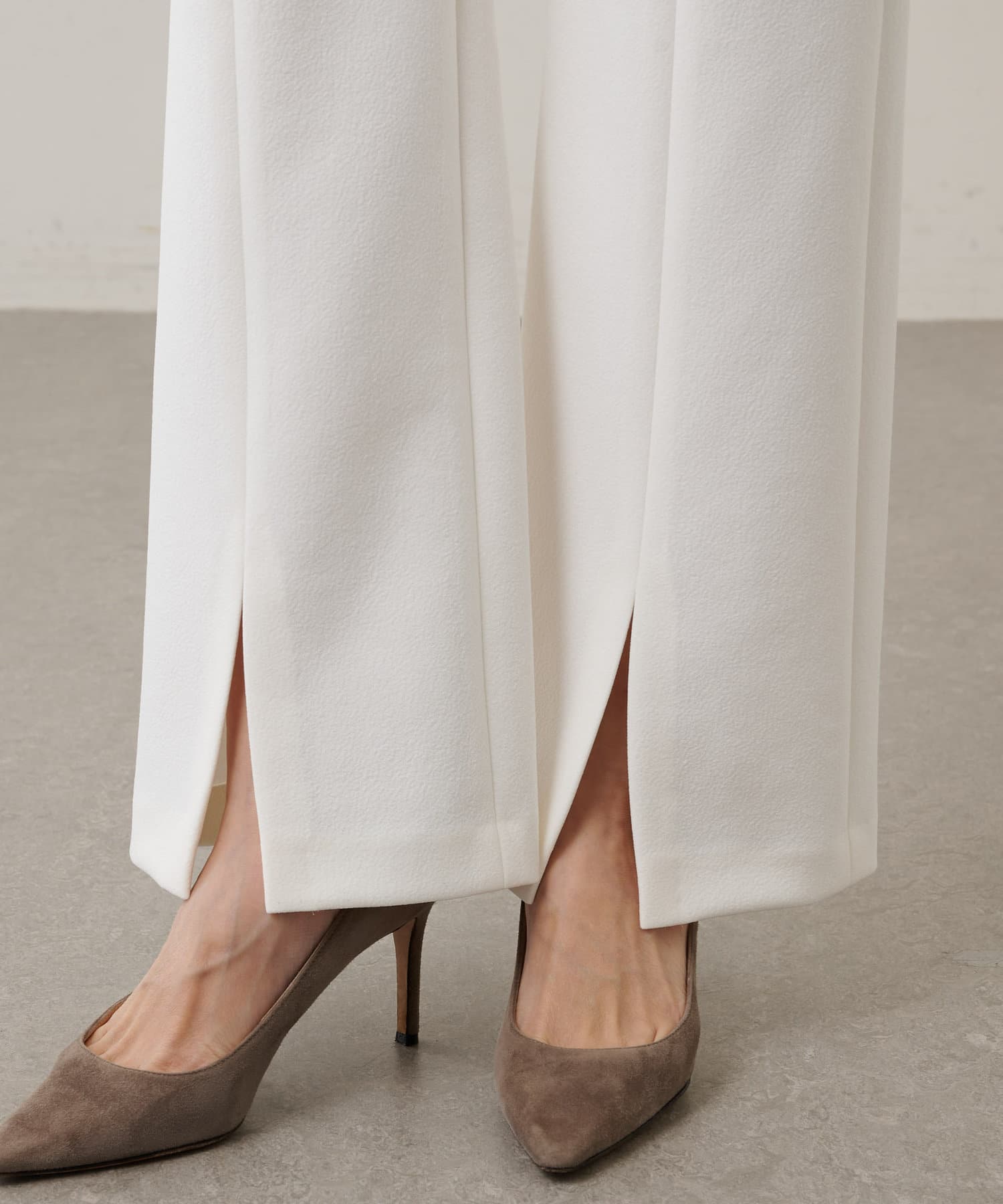 ■裾のフロントスリットが合わせるシューズを選ばず、軽やかな抜け感と女性らしさをプラス。