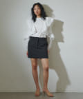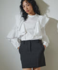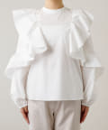 ■フリルが活きるシンプルな身頃は、クルーネックですっきりとさせ甘すぎない印象に。