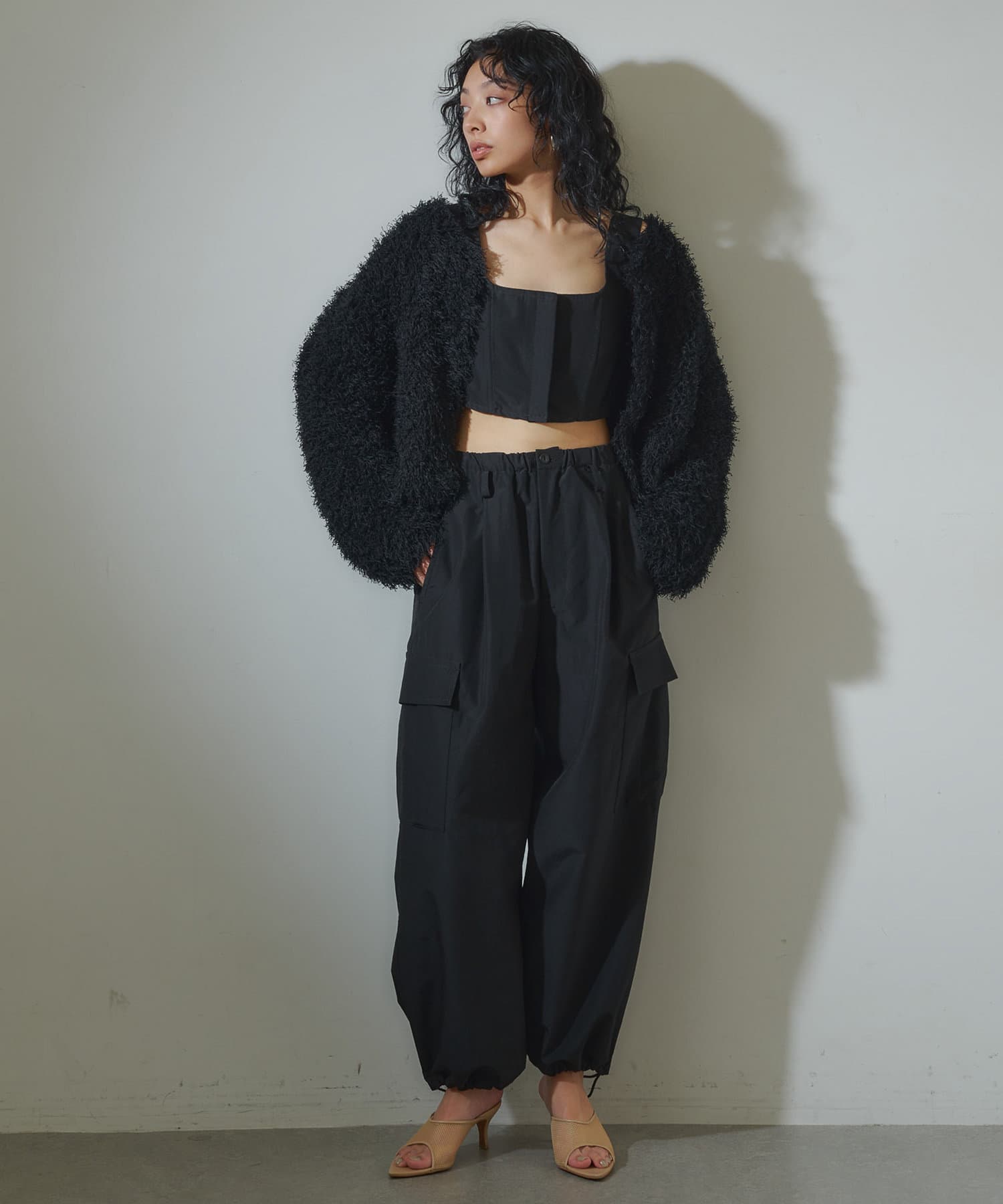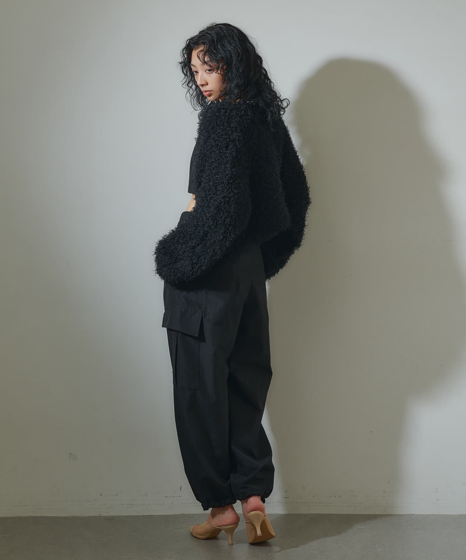 モールのボリュームを引き締め、すっきり着こなせるブラック。
