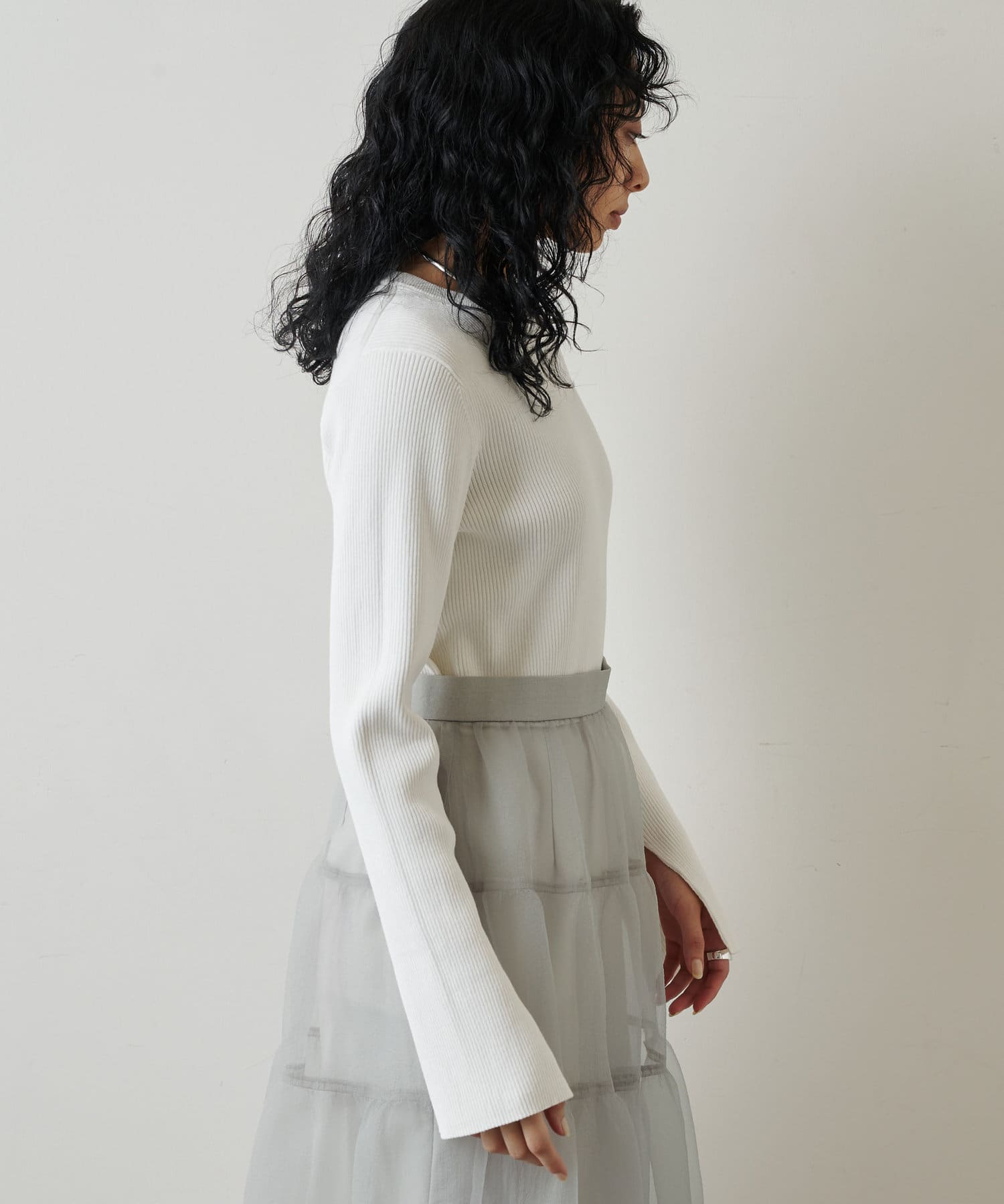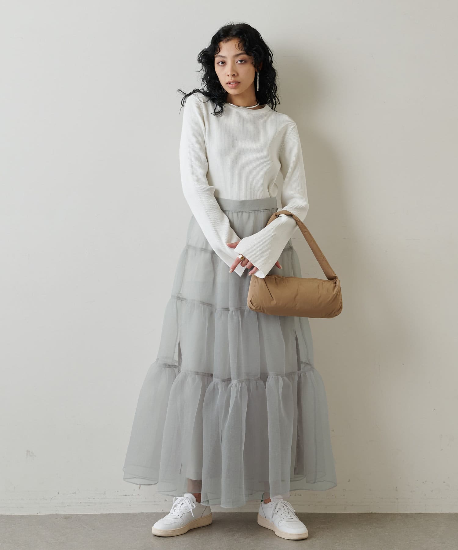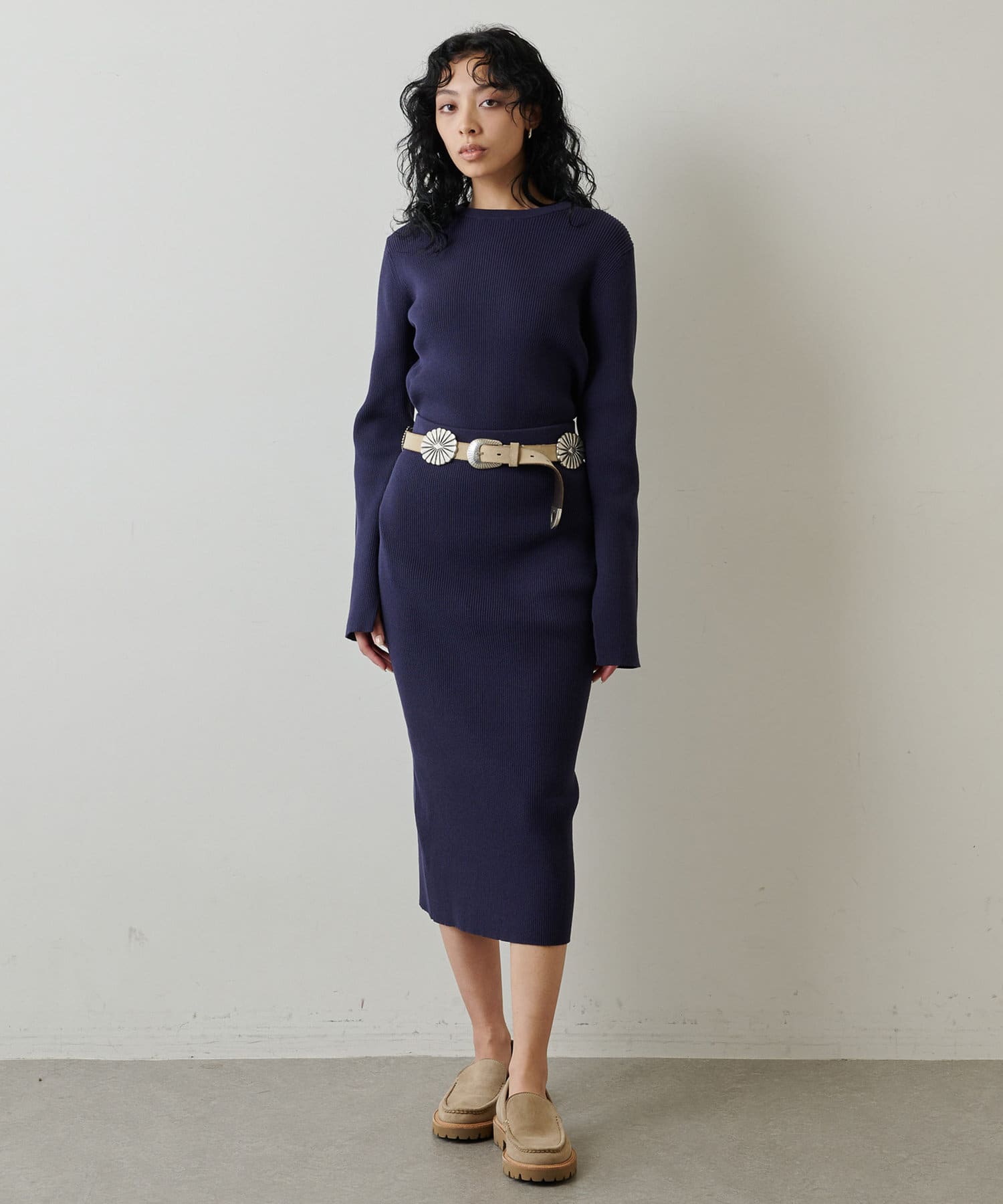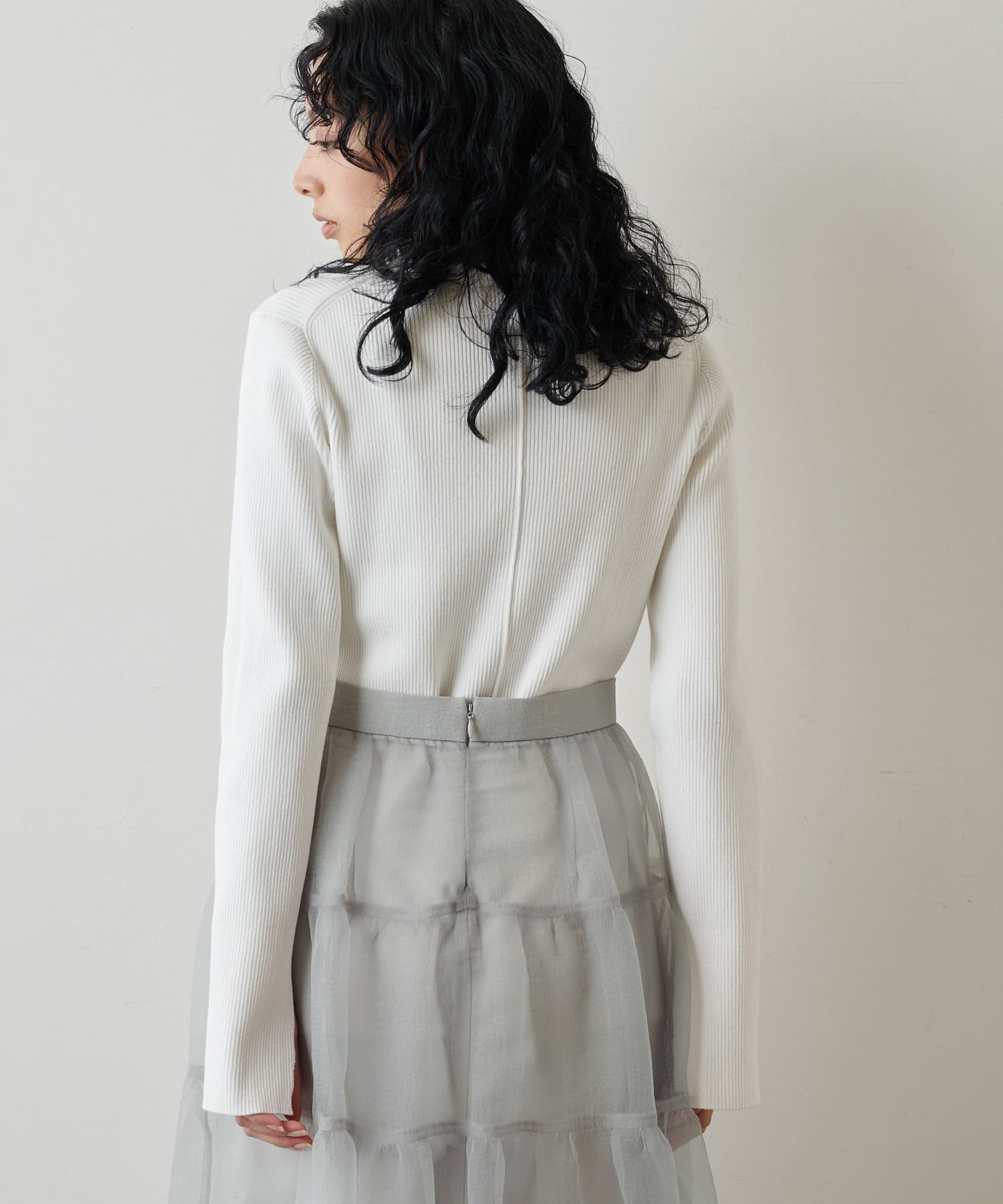 ■同素材のニットスカート(ブランド品番:WGZ1022601A0001)とのセットアップを楽しむのもおすすめ。