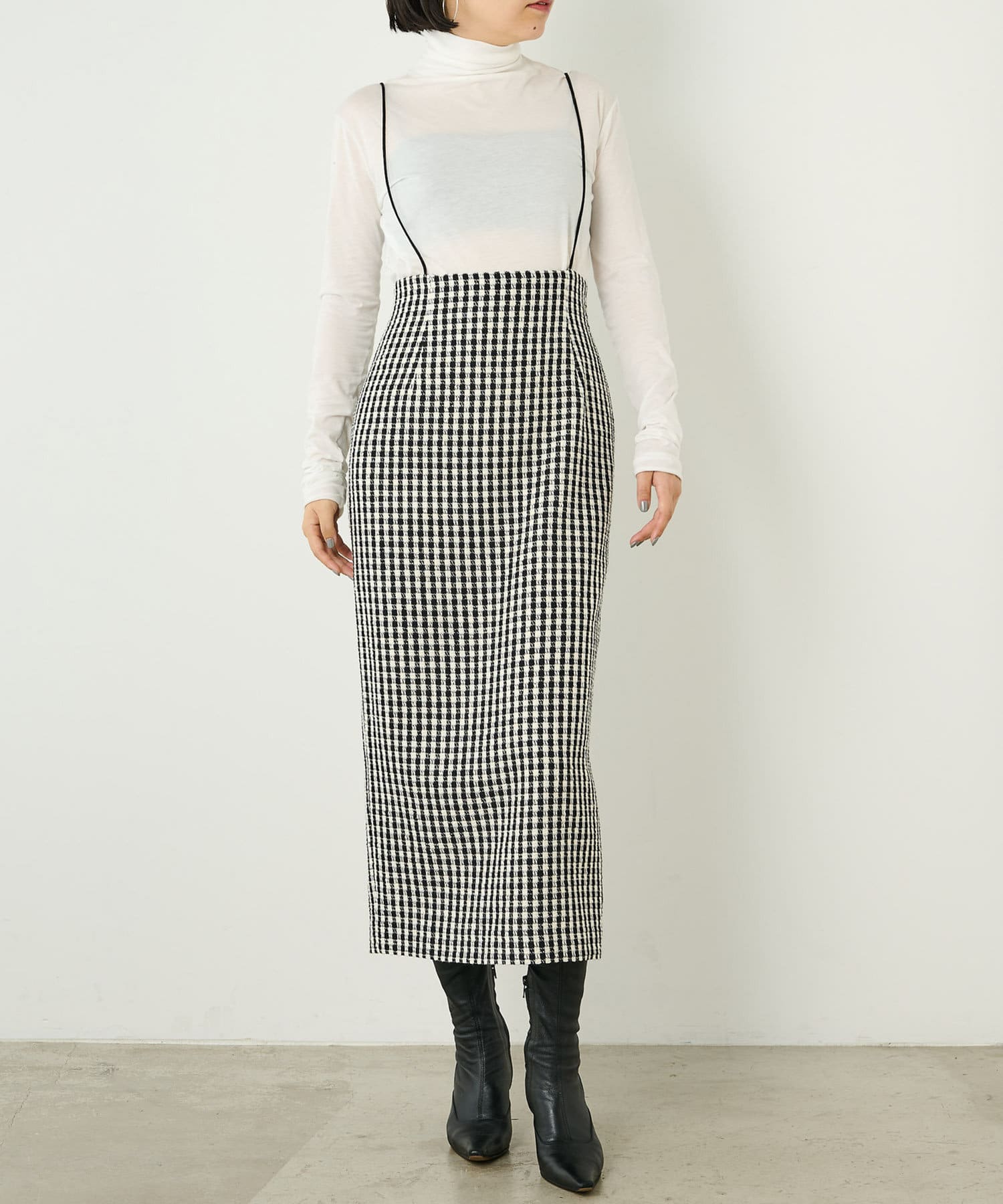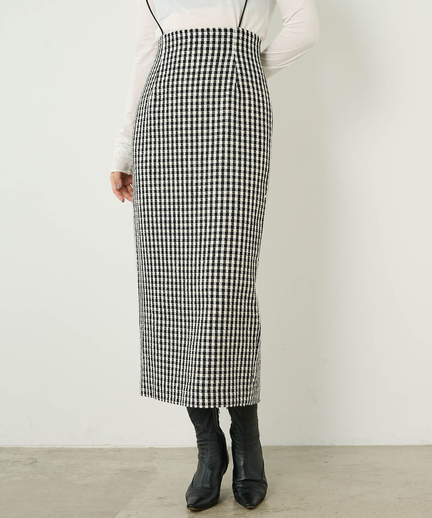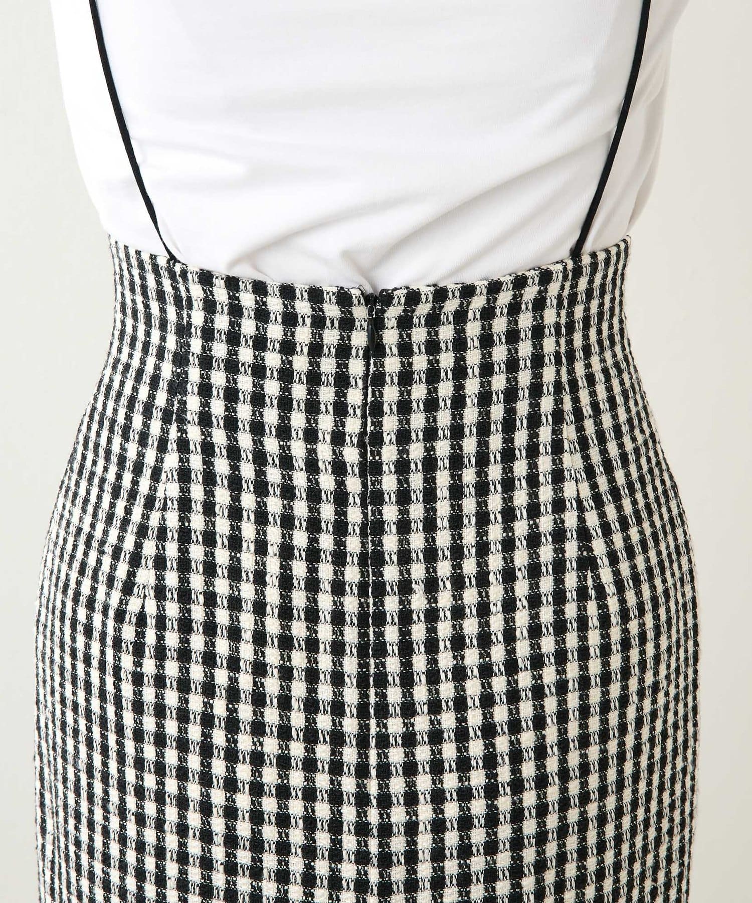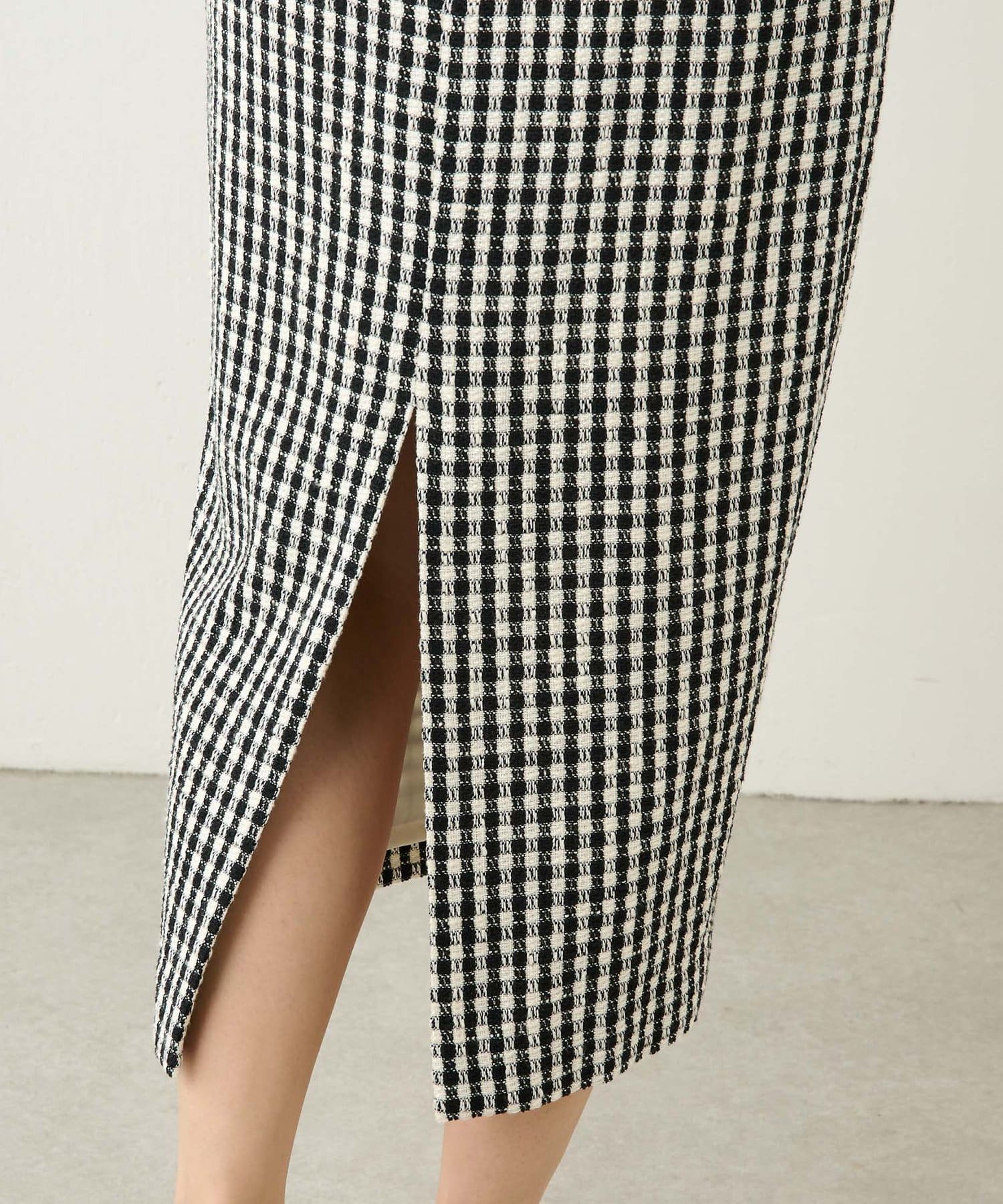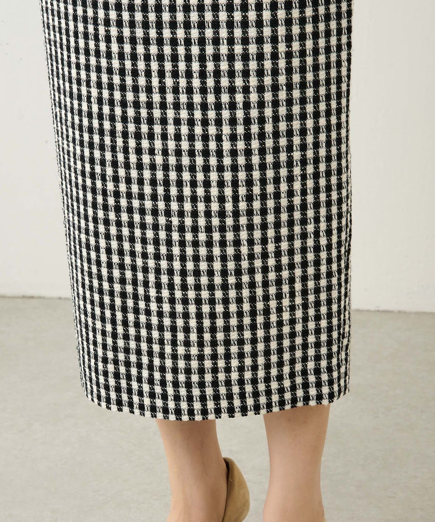 ■ファンシーチェック柄のツイード生地が印象的なタイトスカート。