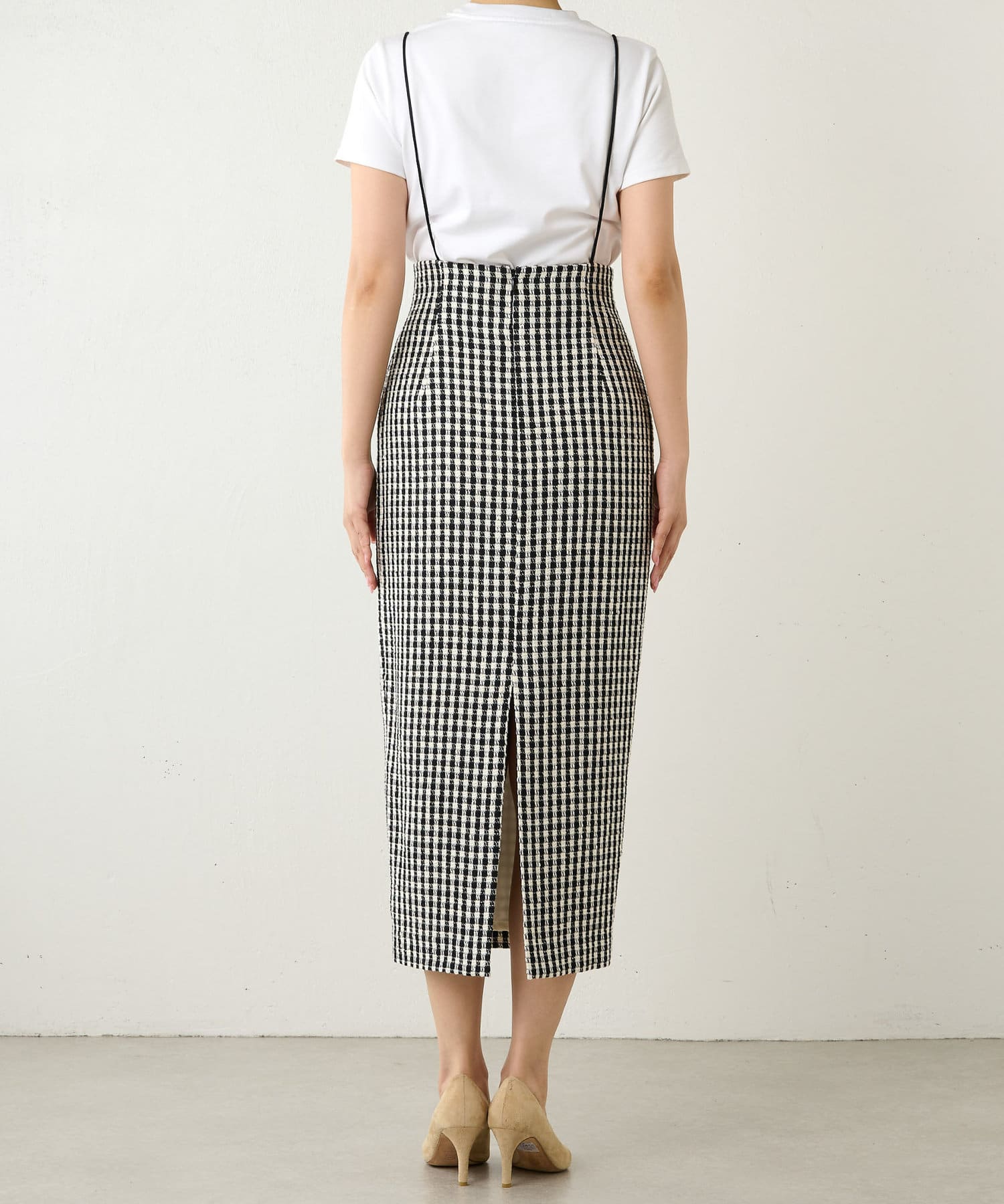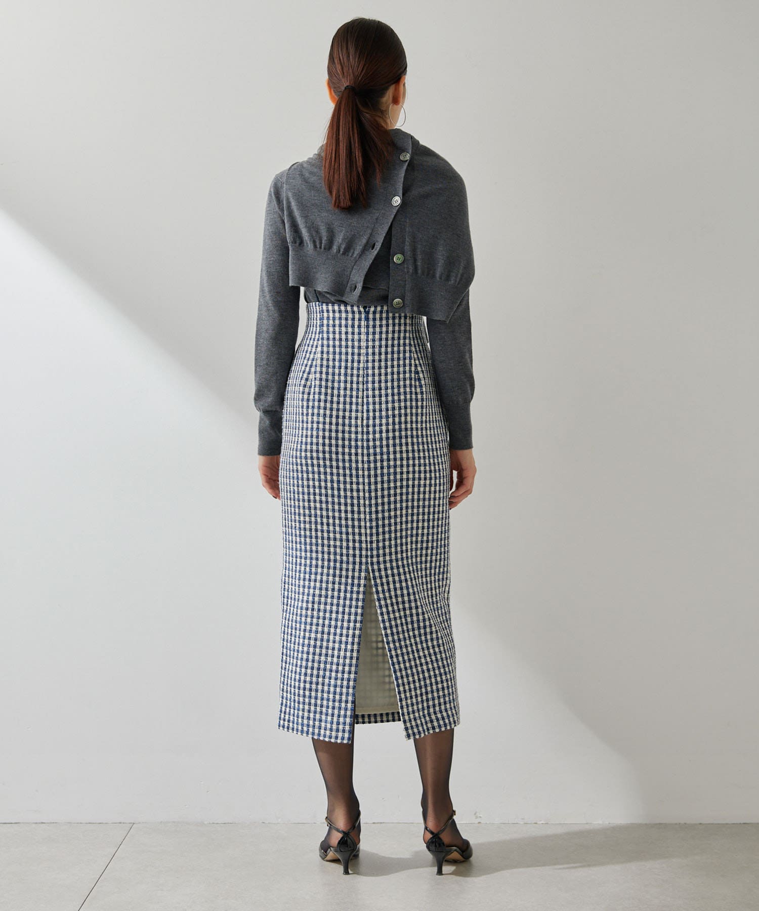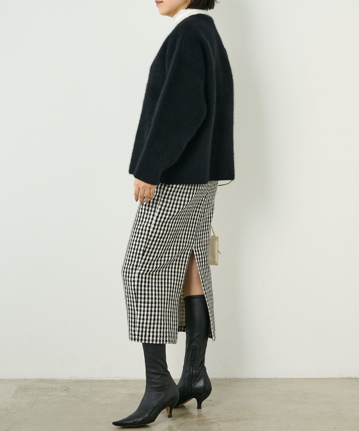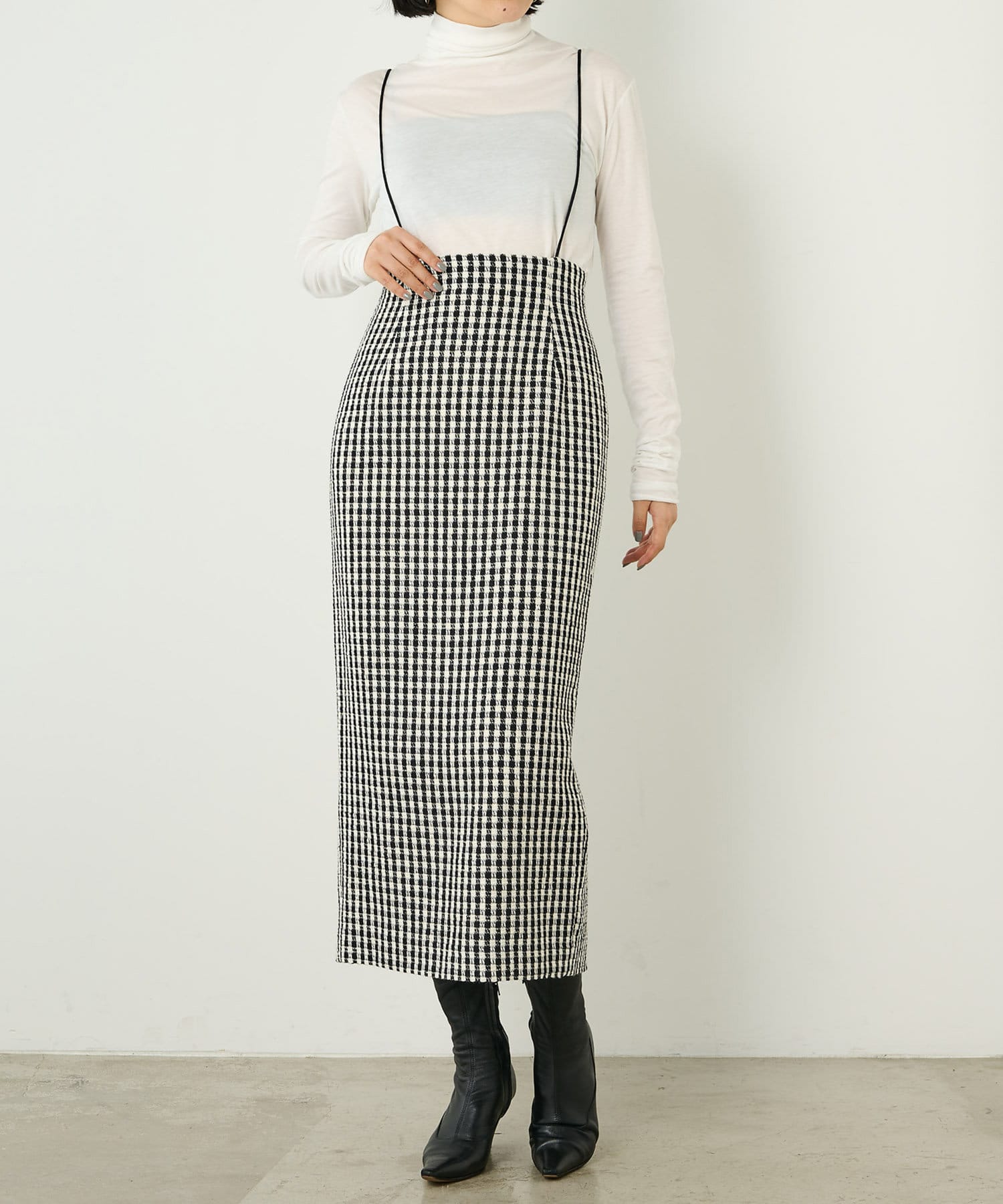 ■ファンシーチェック柄のツイード生地が印象的なタイトスカート。
