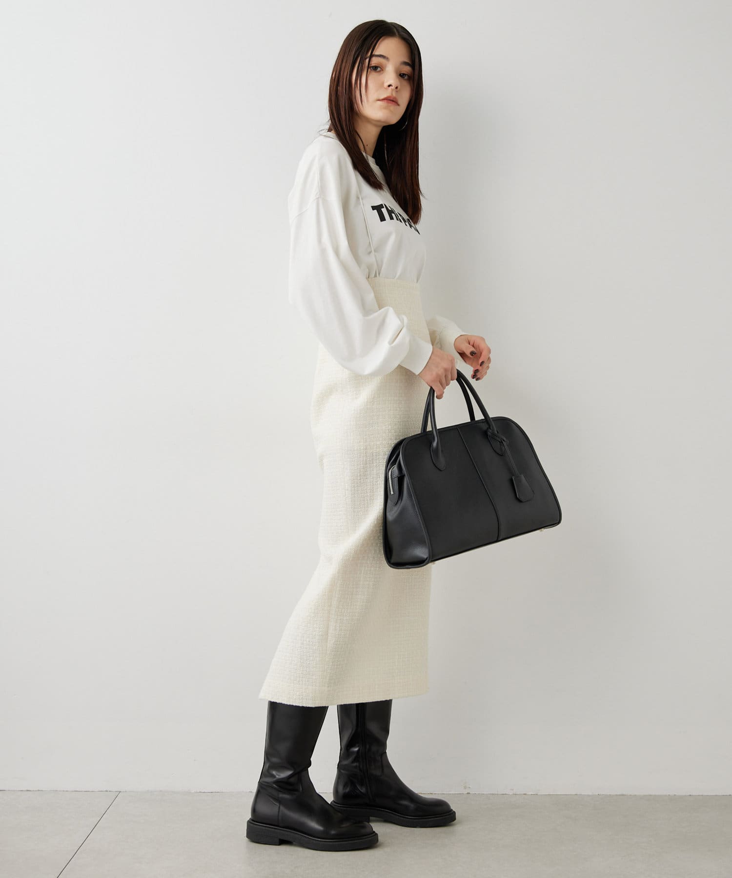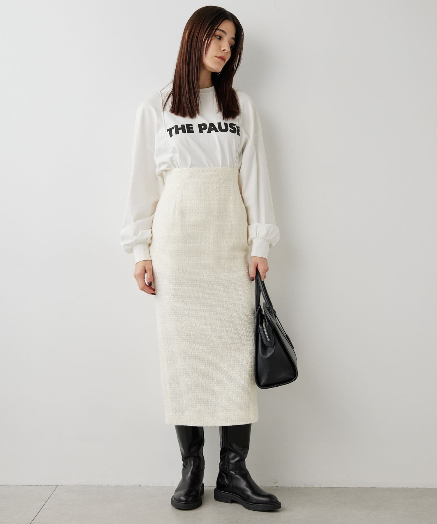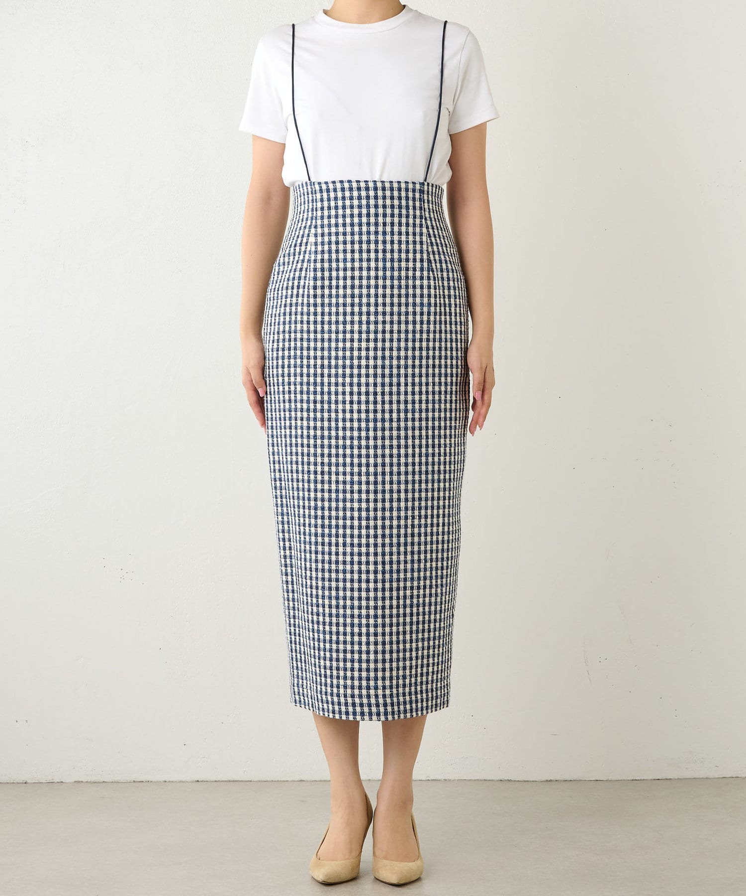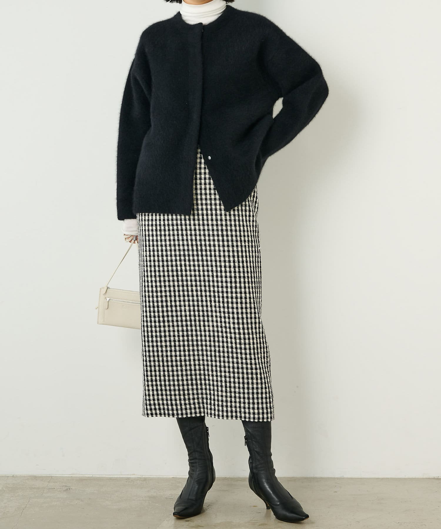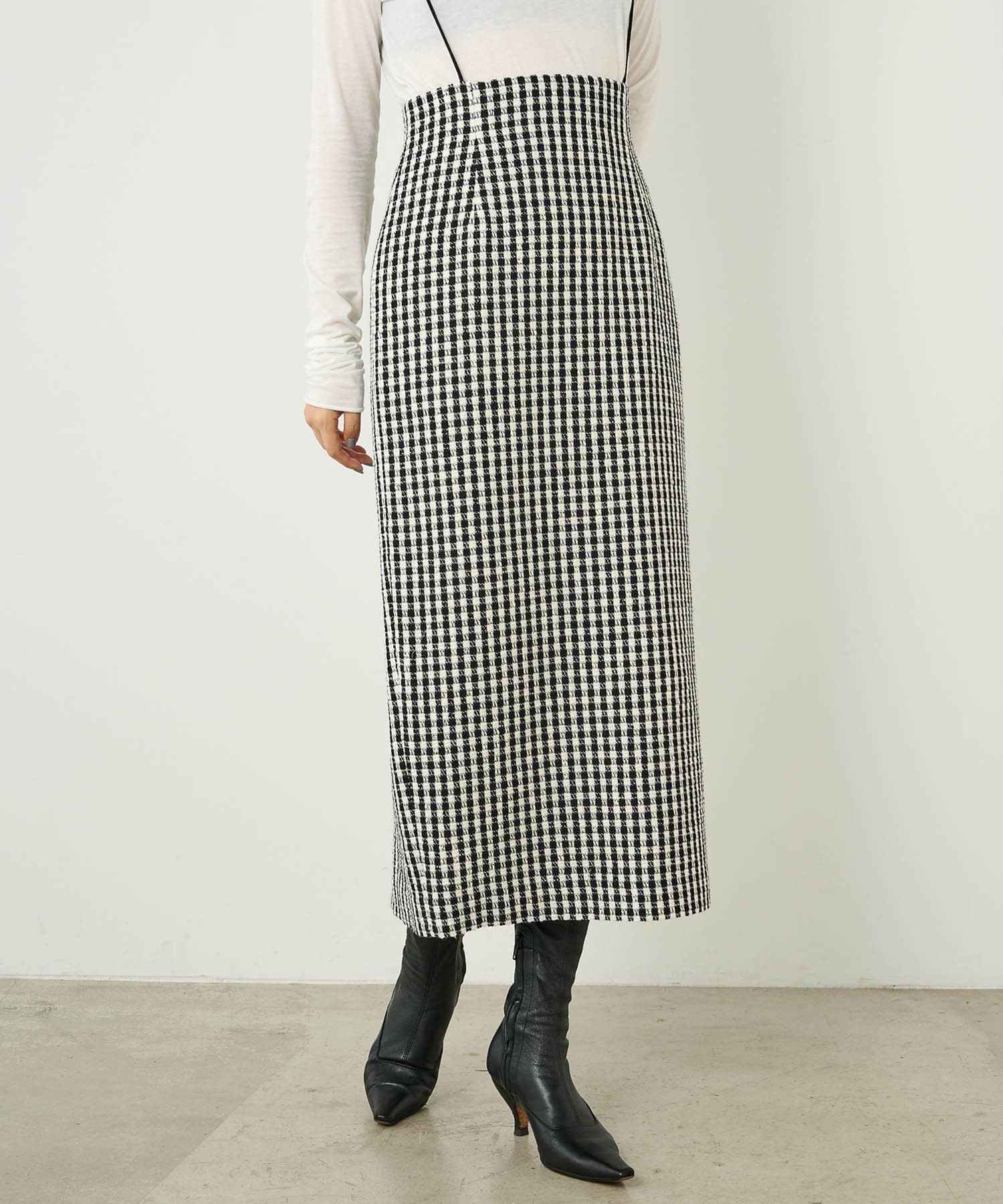 ■ファンシーチェック柄のツイード生地が印象的なタイトスカート。