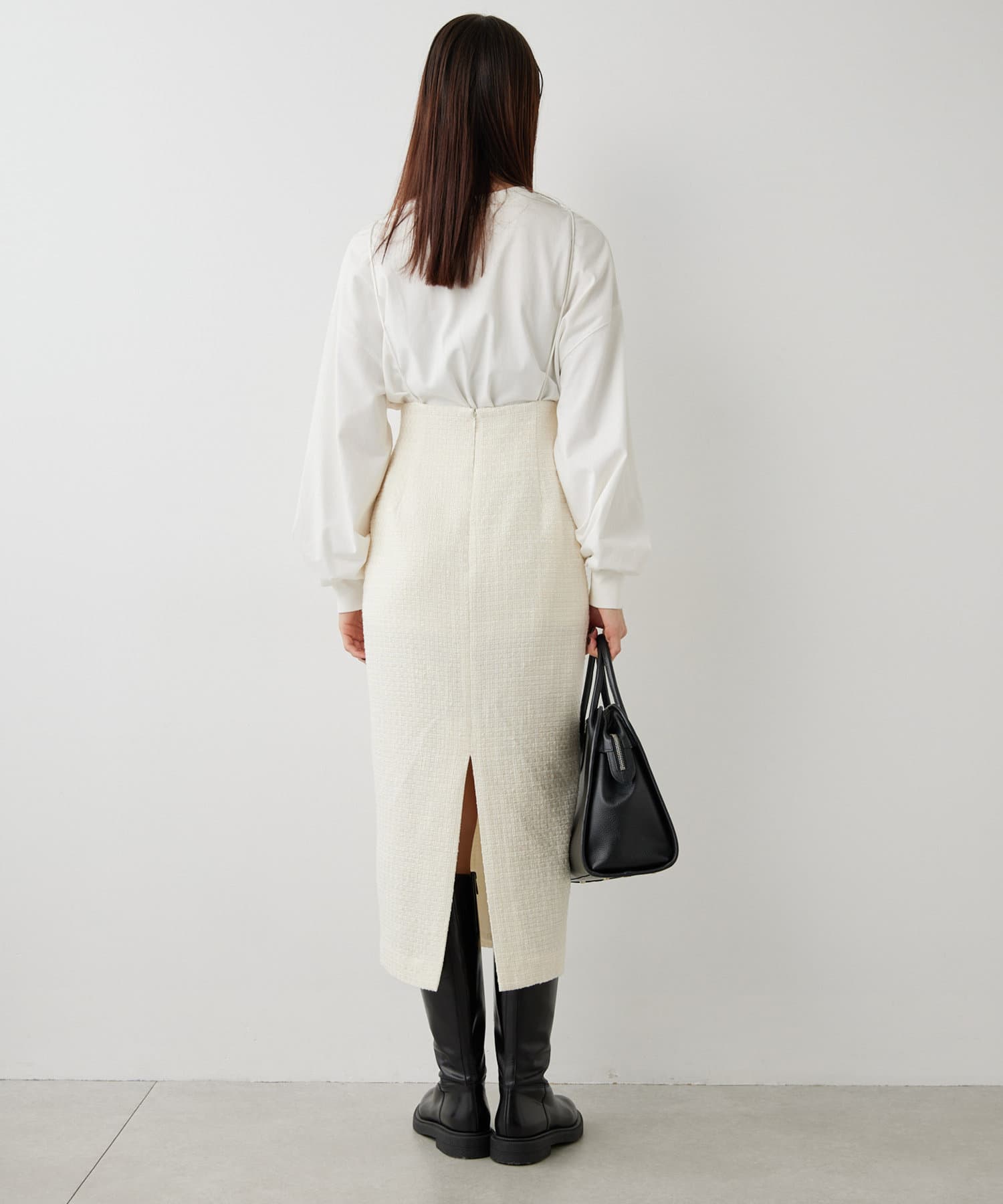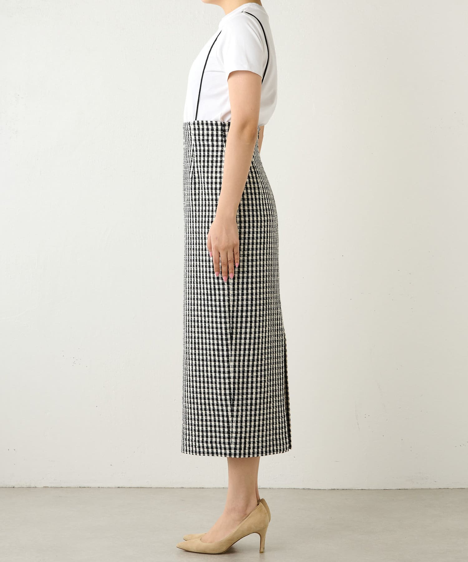 遊び心を品よく取り入れたツイードサロペスカート