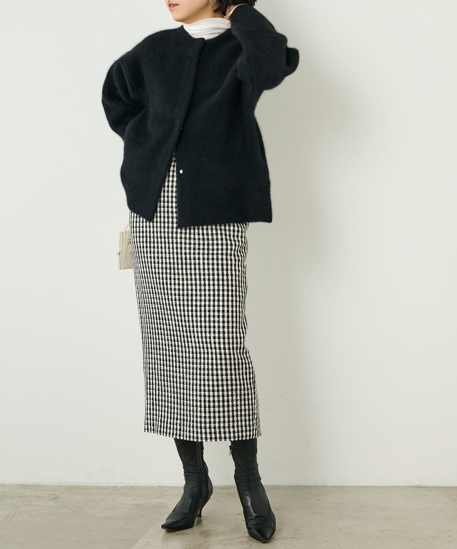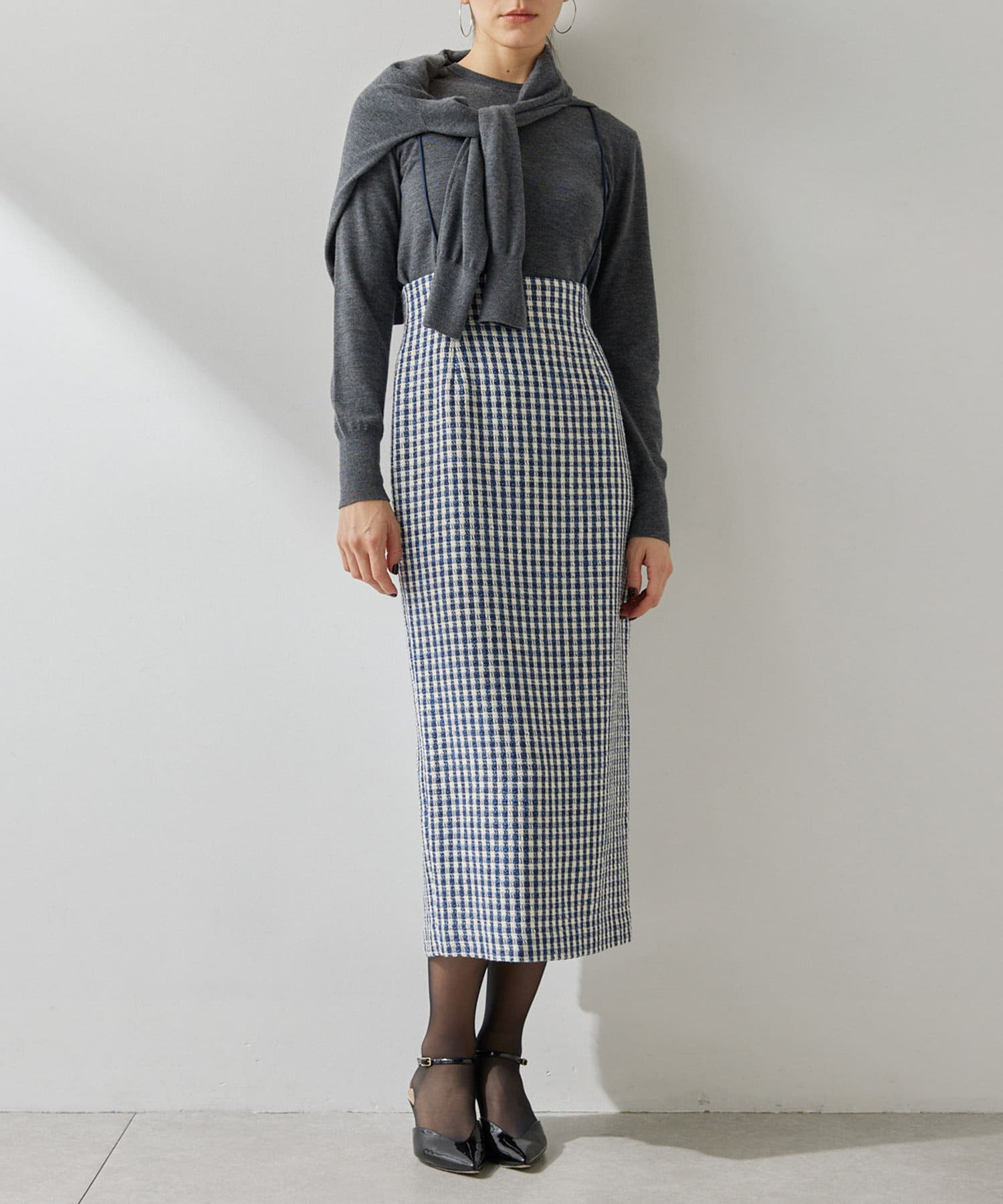 Iラインシルエットなのでスタイルアップ効果抜群。細かなチェック柄がコーディネートのポイントに。