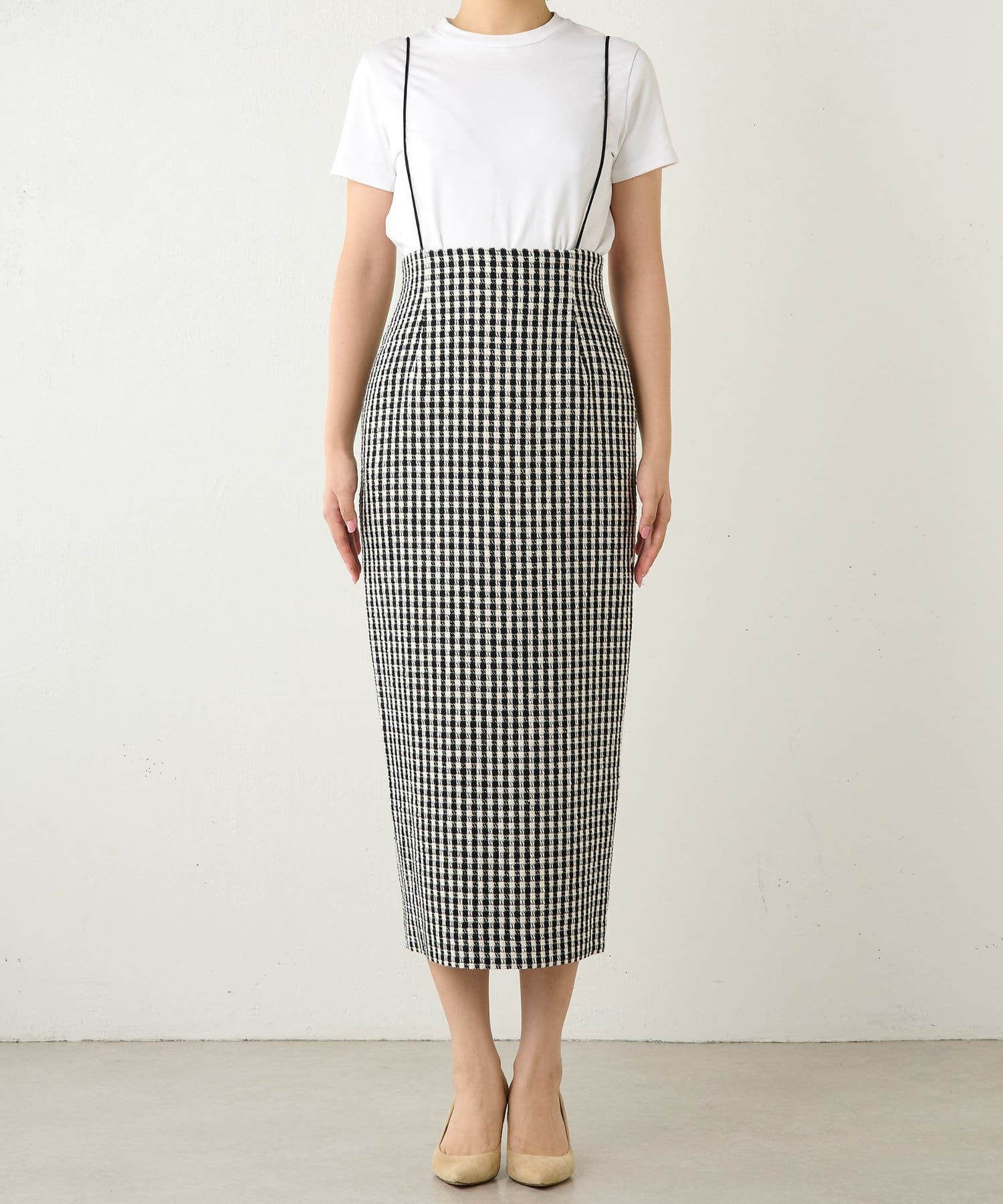■華奢なサスペンダーをプラスしたデザインが着こなしの幅を広げる一枚。