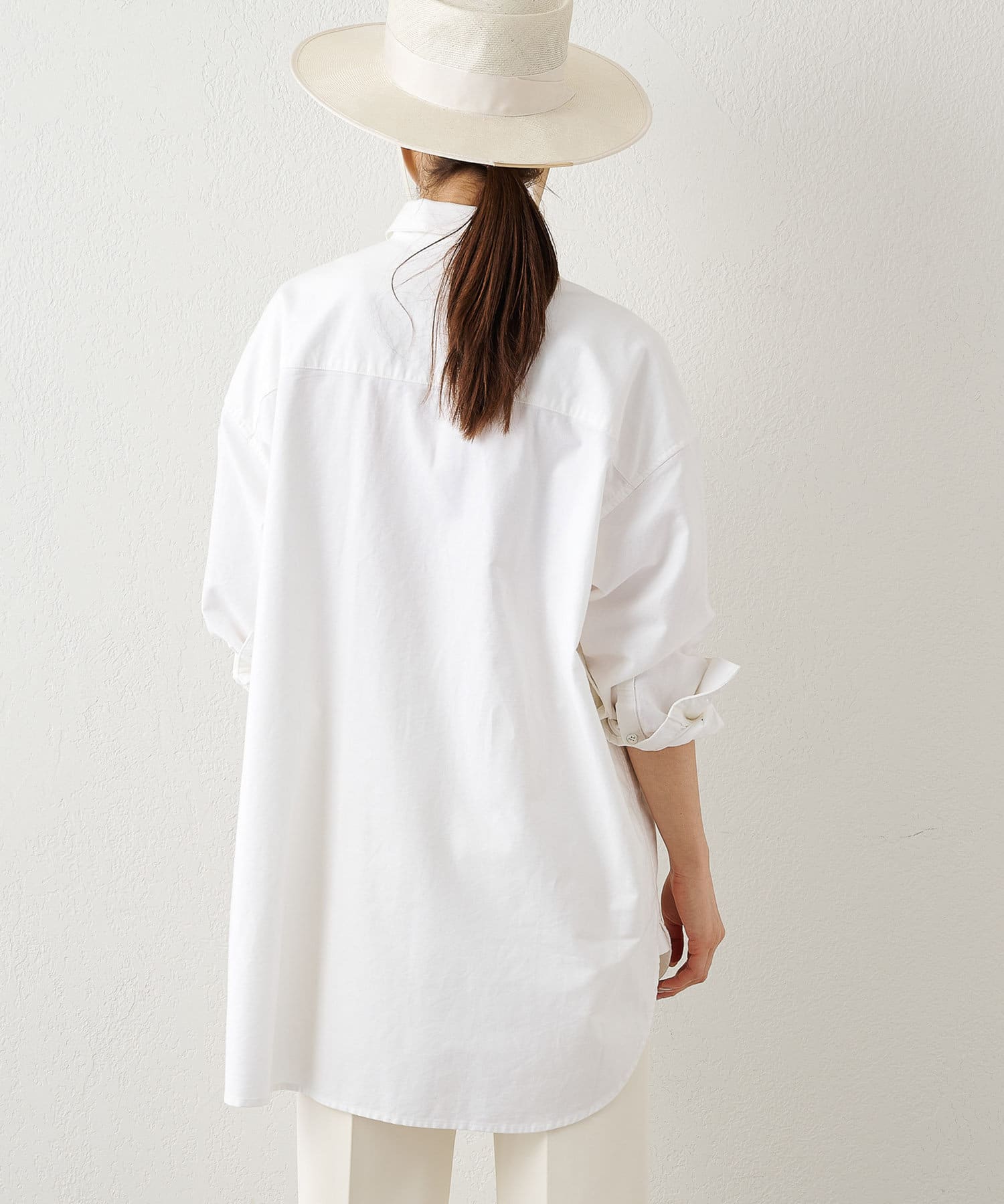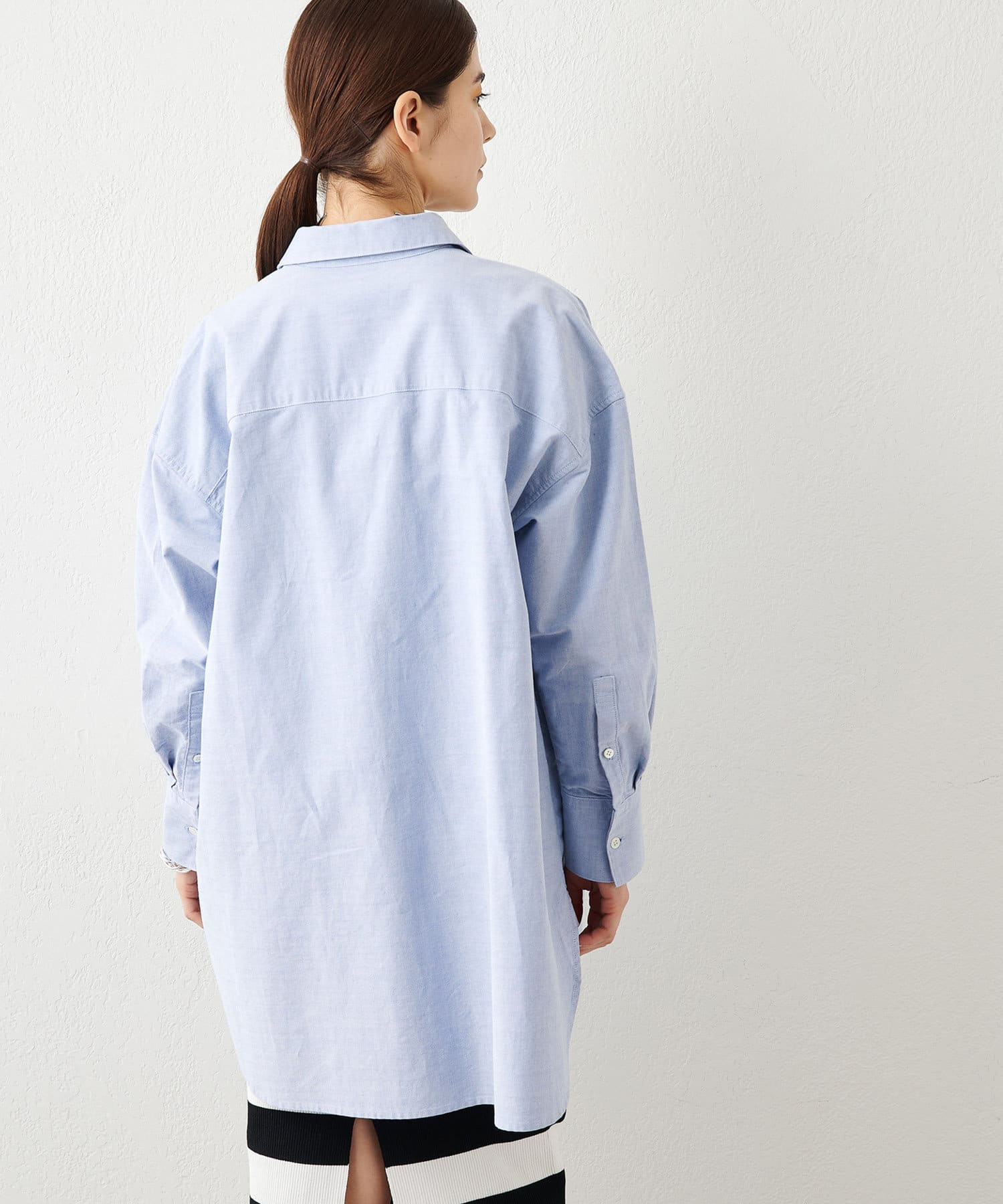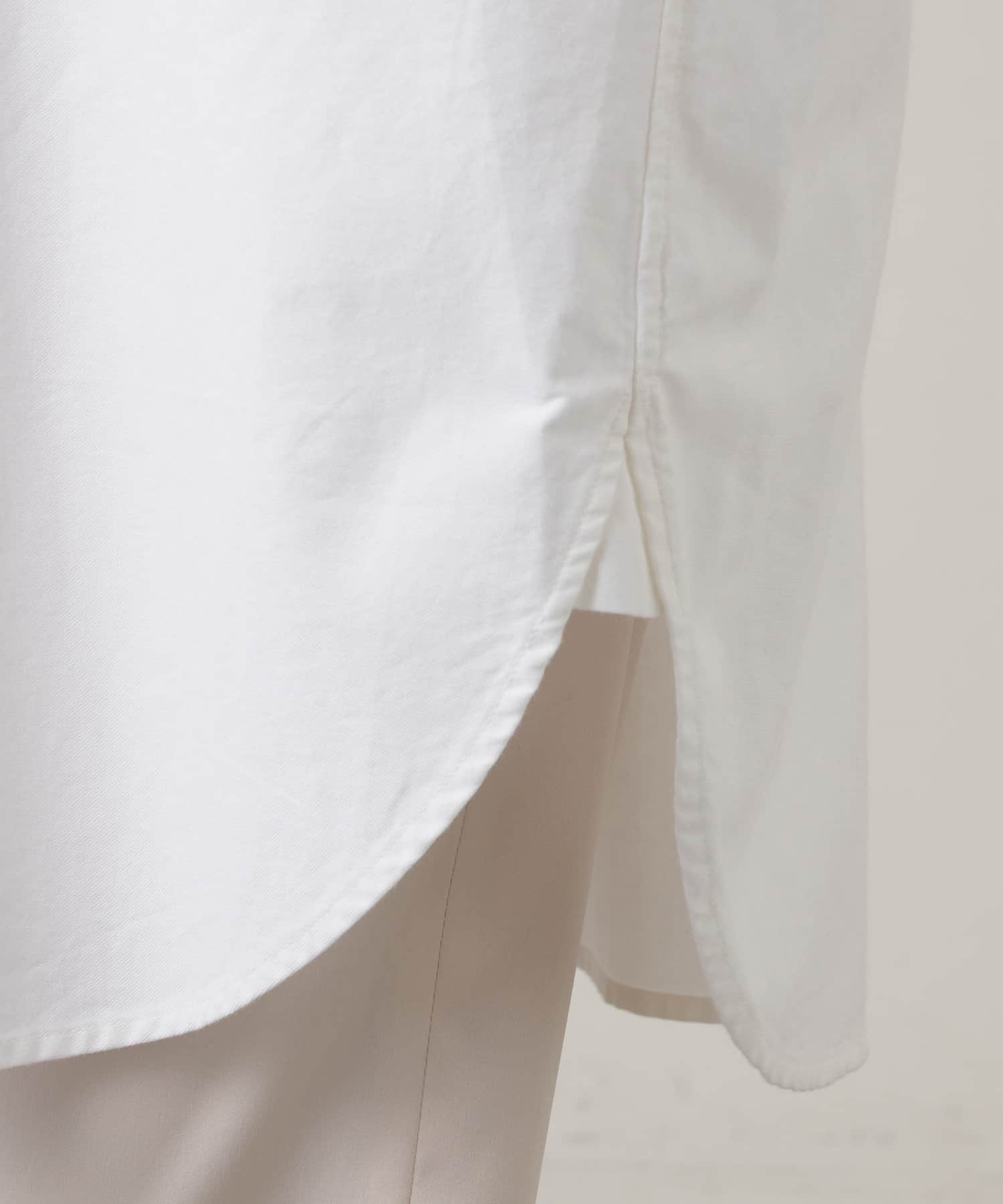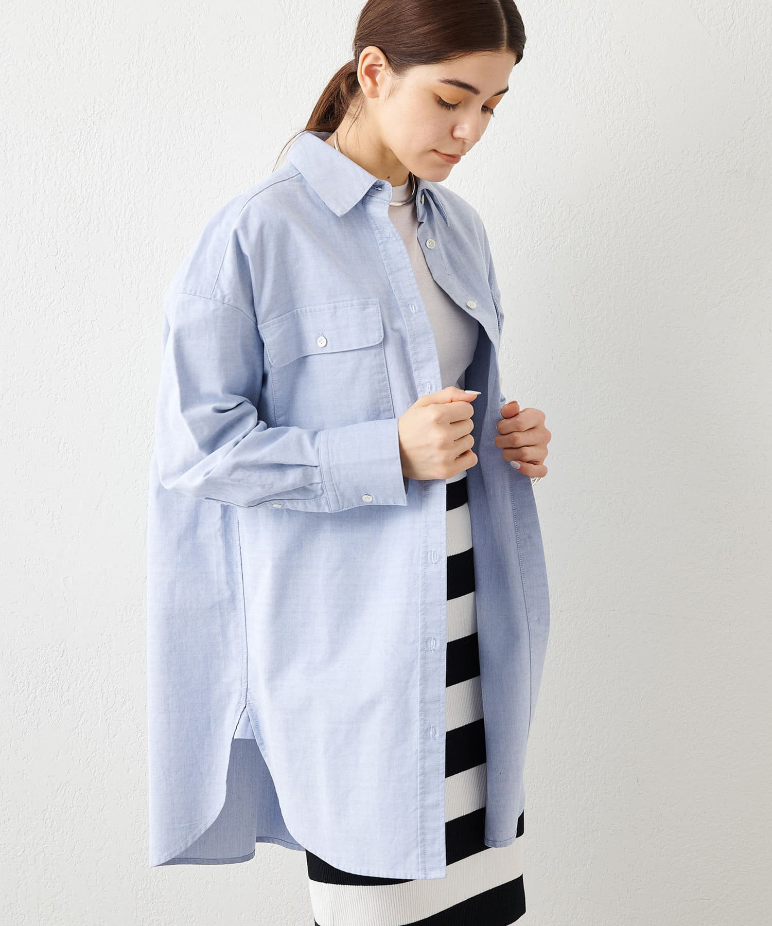 爽やかな印象を与えてくれるオックスワンウォッシュシャツ。ベーシックに使いまわせるロングシャツは一枚あると頼れるアイテムです。襟をラフに開けて首元を見せたり、袖を折り返して手首の華奢さを強調するだけでこなれた雰囲気を引き出せます。カットソーの上に羽織る着こなしも楽しめますよ。