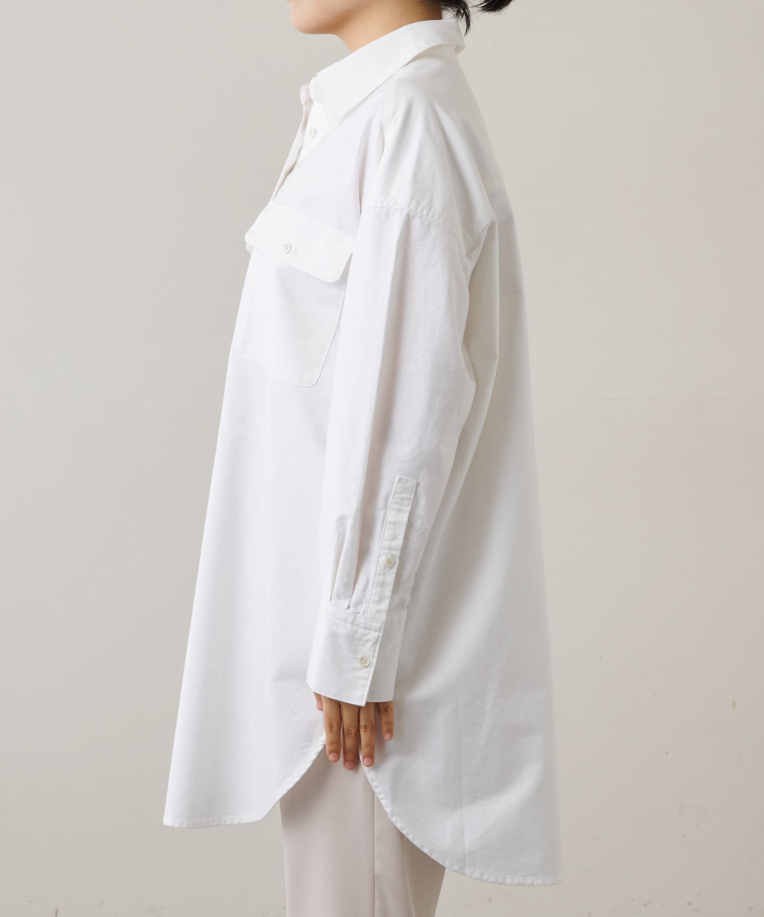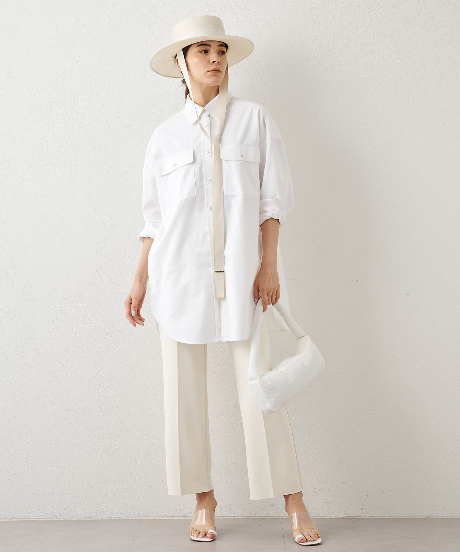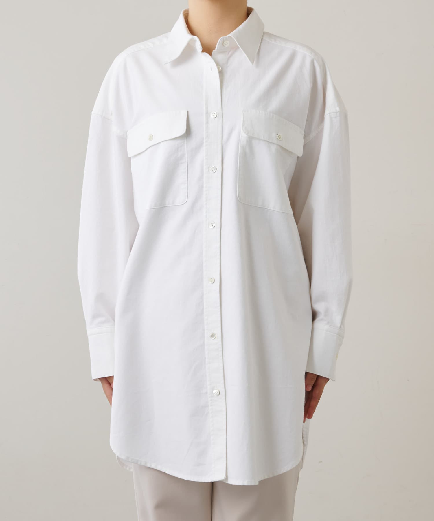 爽やかな印象を与えてくれるオックスワンウォッシュシャツ。ベーシックに使いまわせるロングシャツは一枚あると頼れるアイテムです。襟をラフに開けて首元を見せたり、袖を折り返して手首の華奢さを強調するだけでこなれた雰囲気を引き出せます。カットソーの上に羽織る着こなしも楽しめますよ。