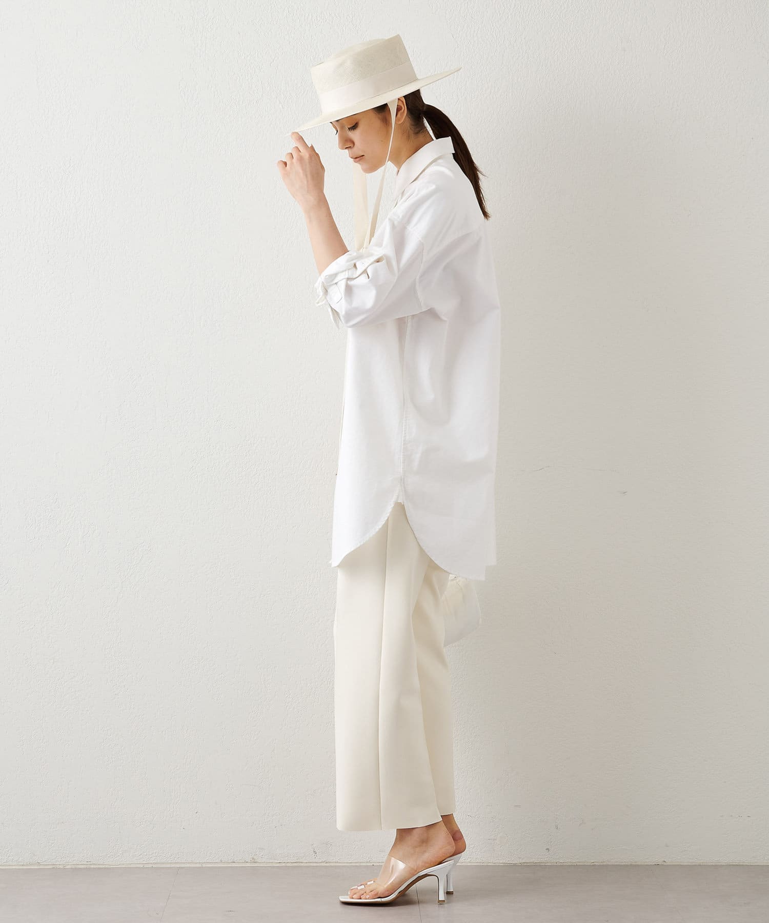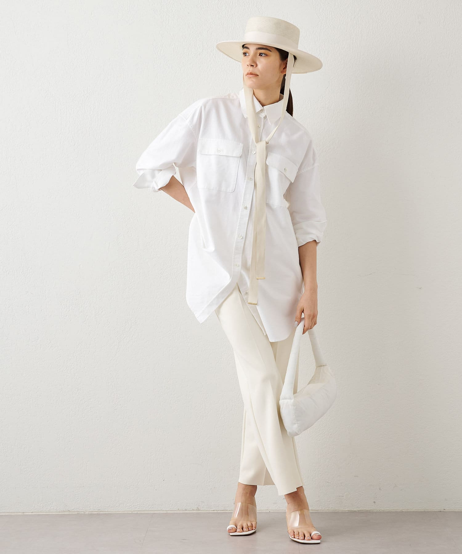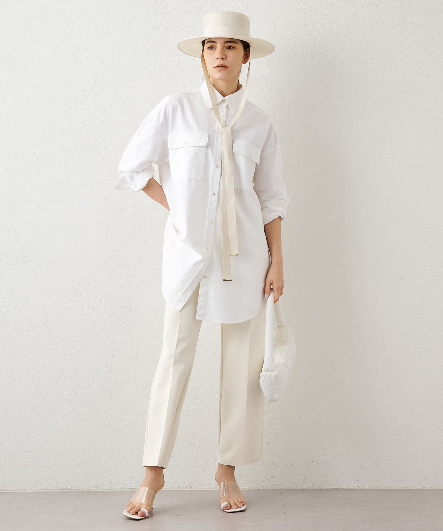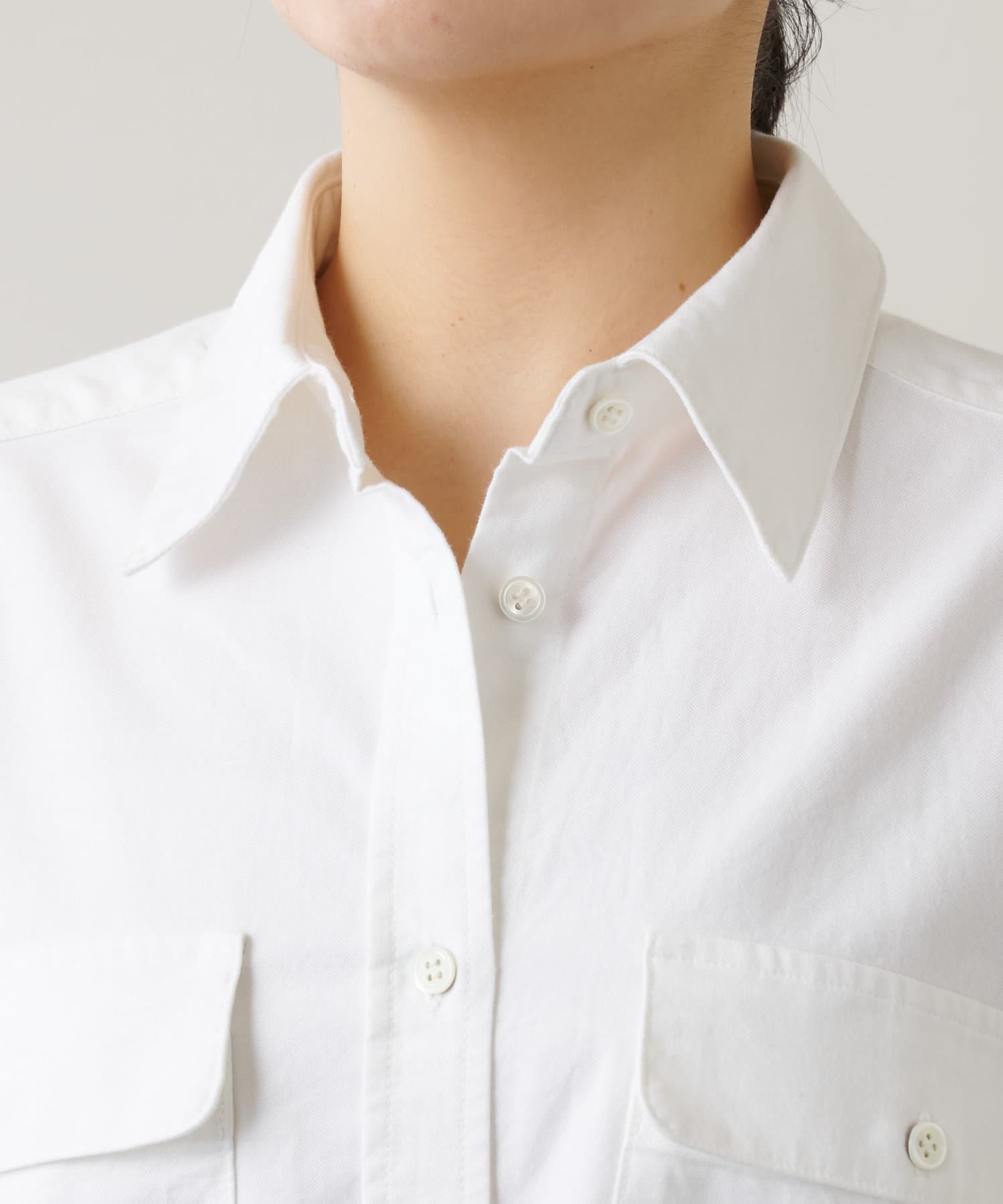 爽やかな印象を与えてくれるオックスワンウォッシュシャツ。ベーシックに使いまわせるロングシャツは一枚あると頼れるアイテムです。襟をラフに開けて首元を見せたり、袖を折り返して手首の華奢さを強調するだけでこなれた雰囲気を引き出せます。カットソーの上に羽織る着こなしも楽しめますよ。