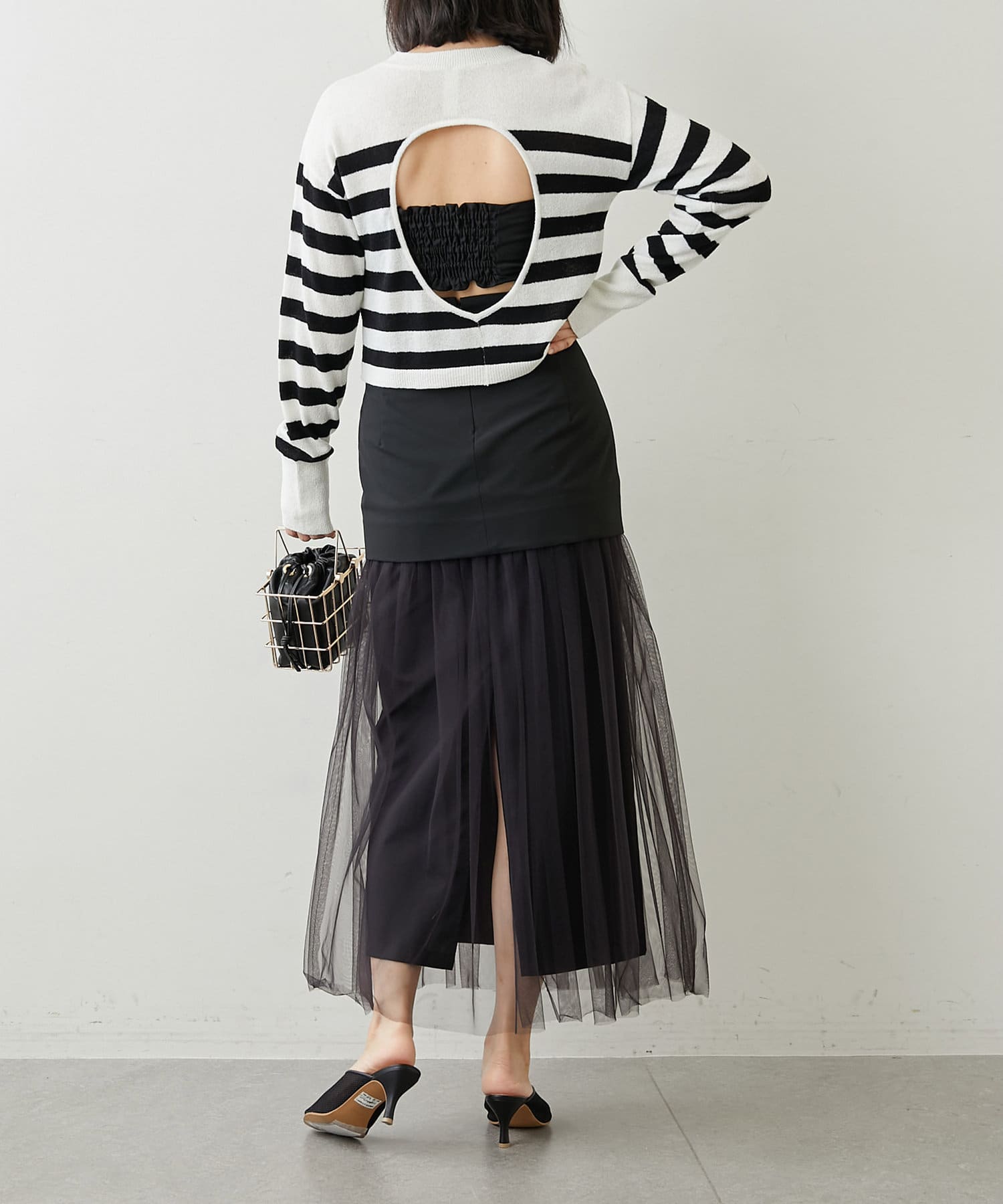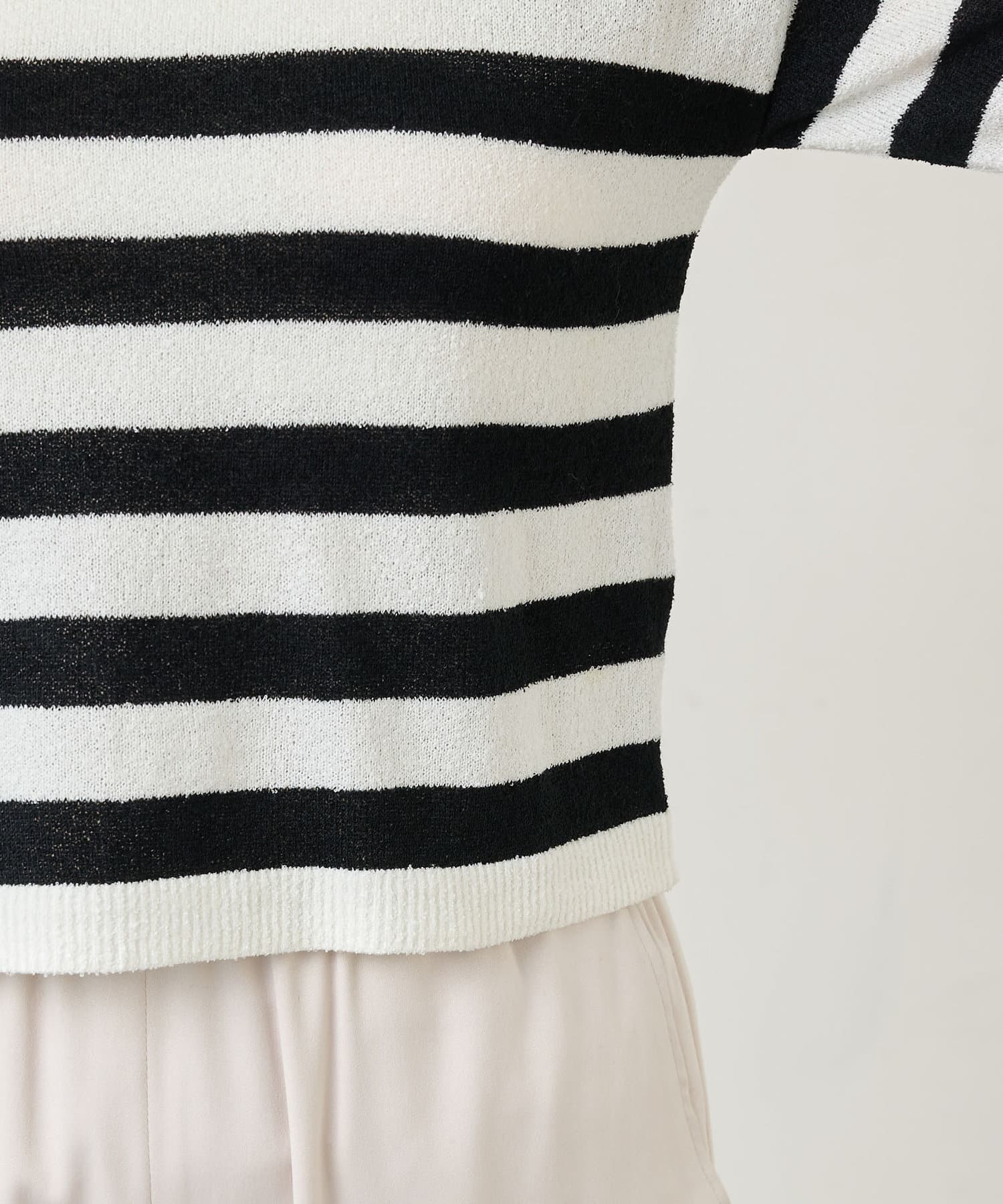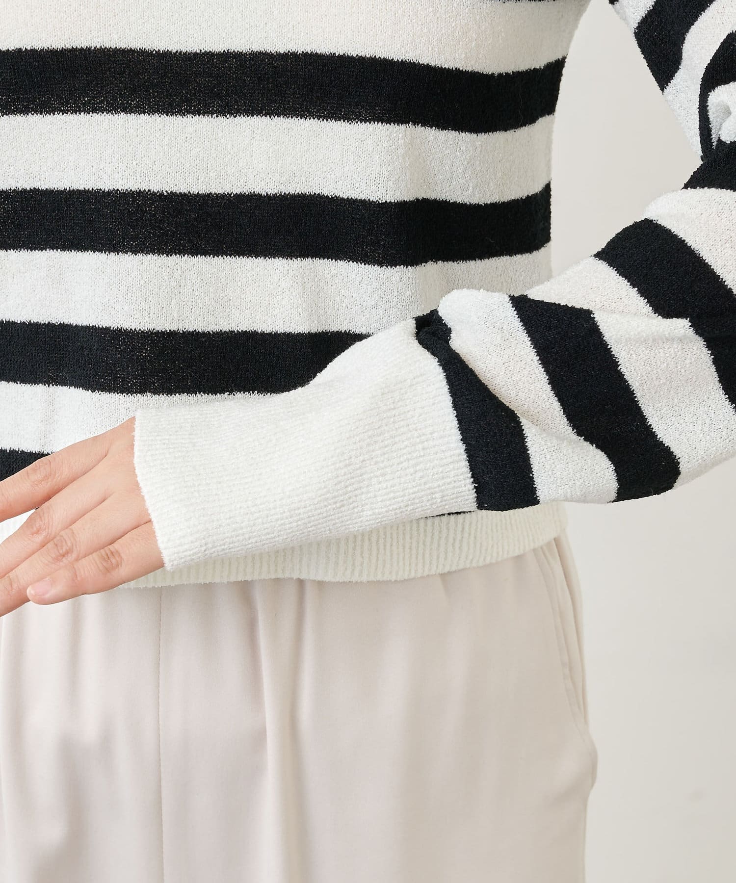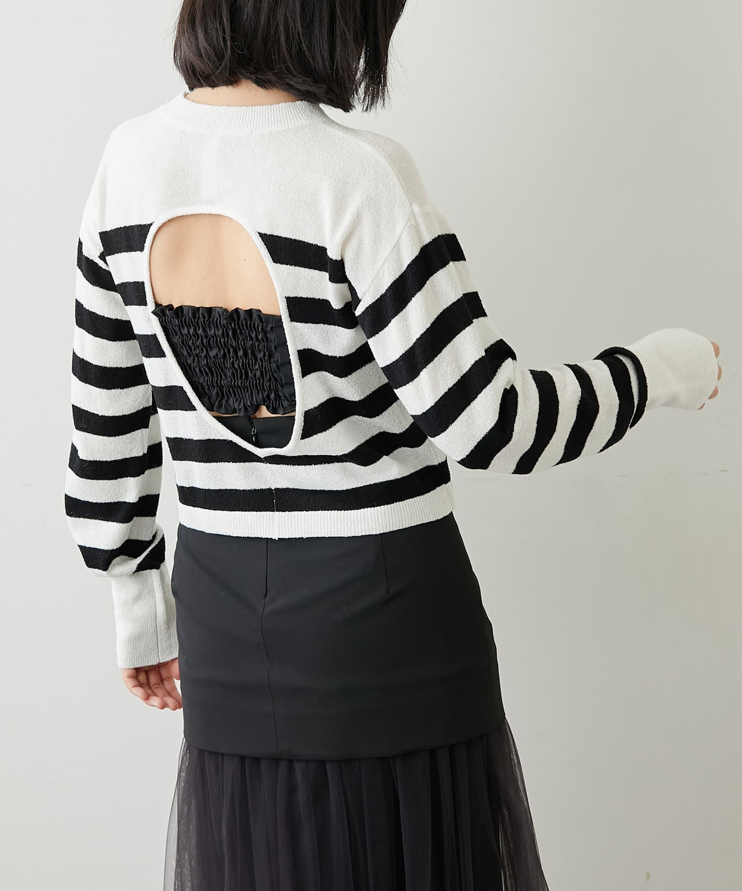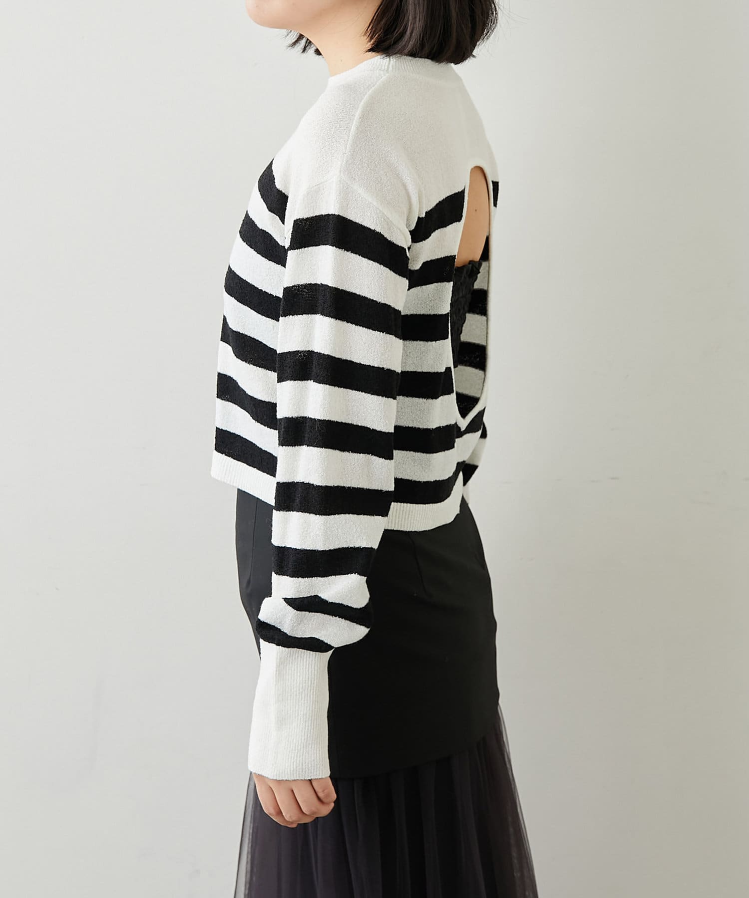 ■バックスタイルの大胆な開きが目を惹くボーダーニットプルオーバー。