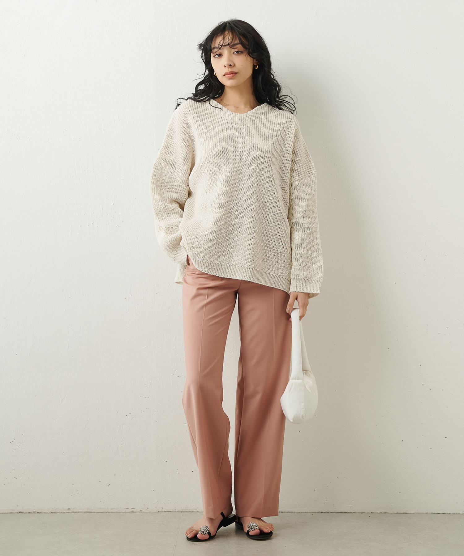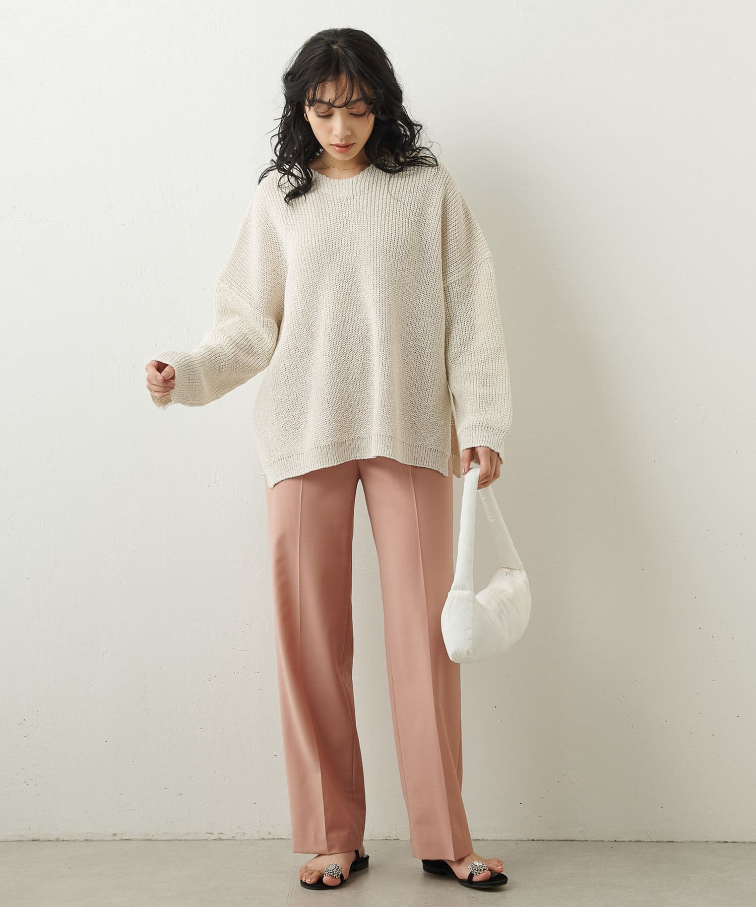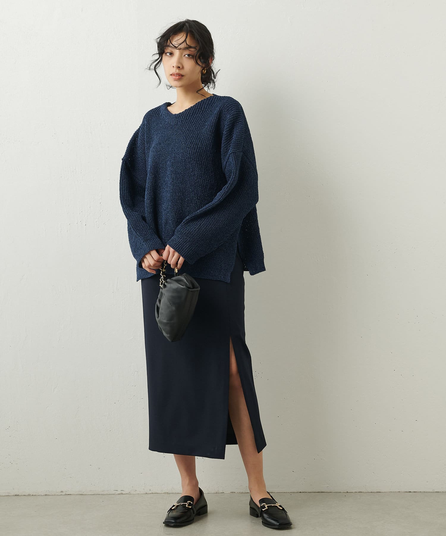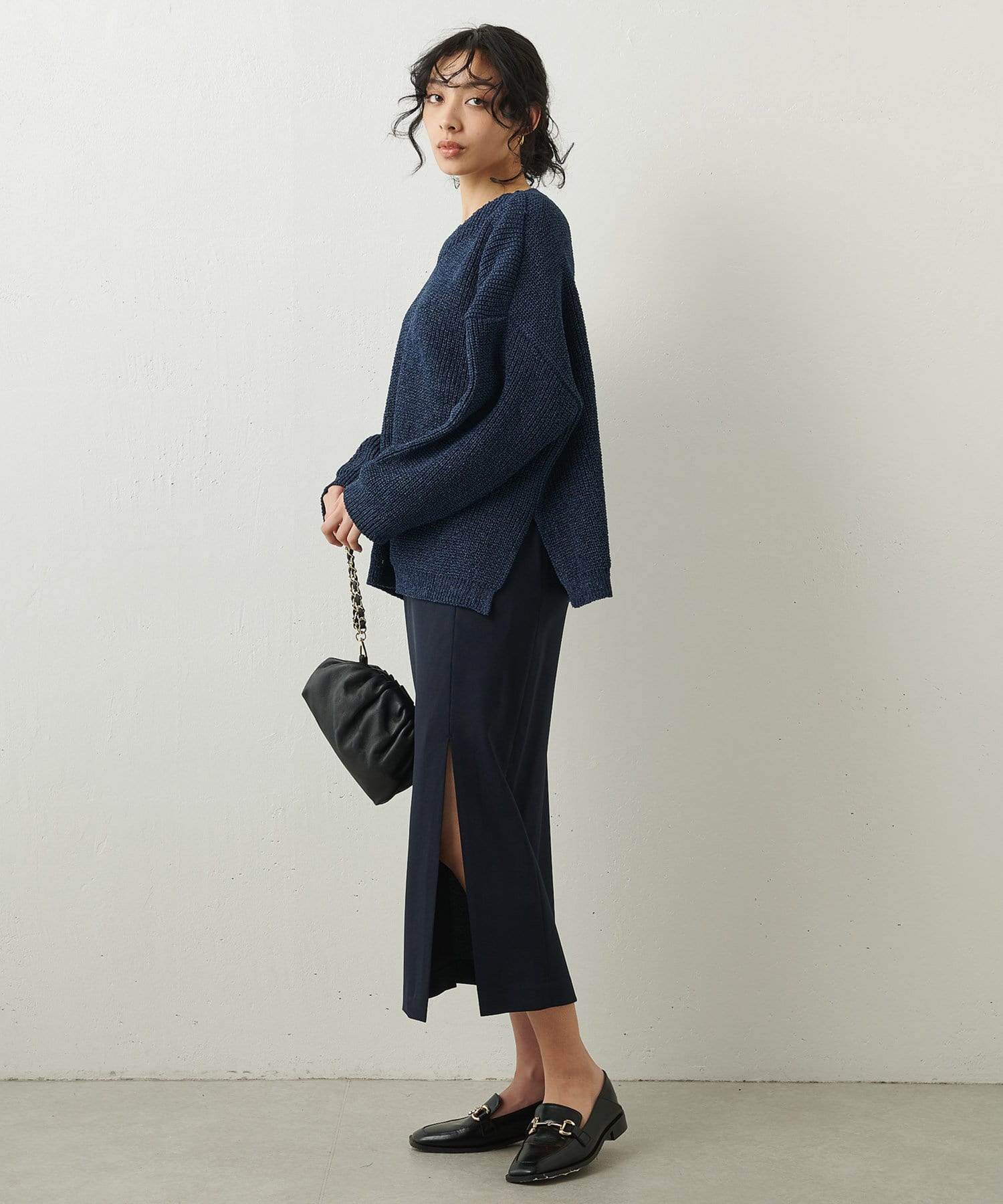 ■すっきりとしたパンツや細身のスカートに合わせてニットの緩さを引き立てるスタイリングもおすすめ。