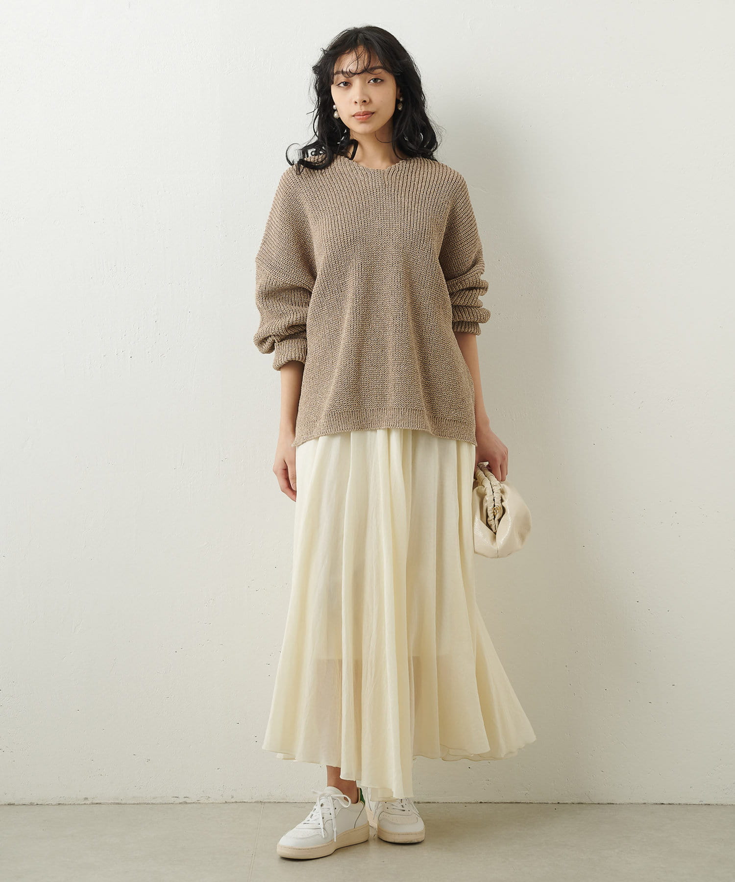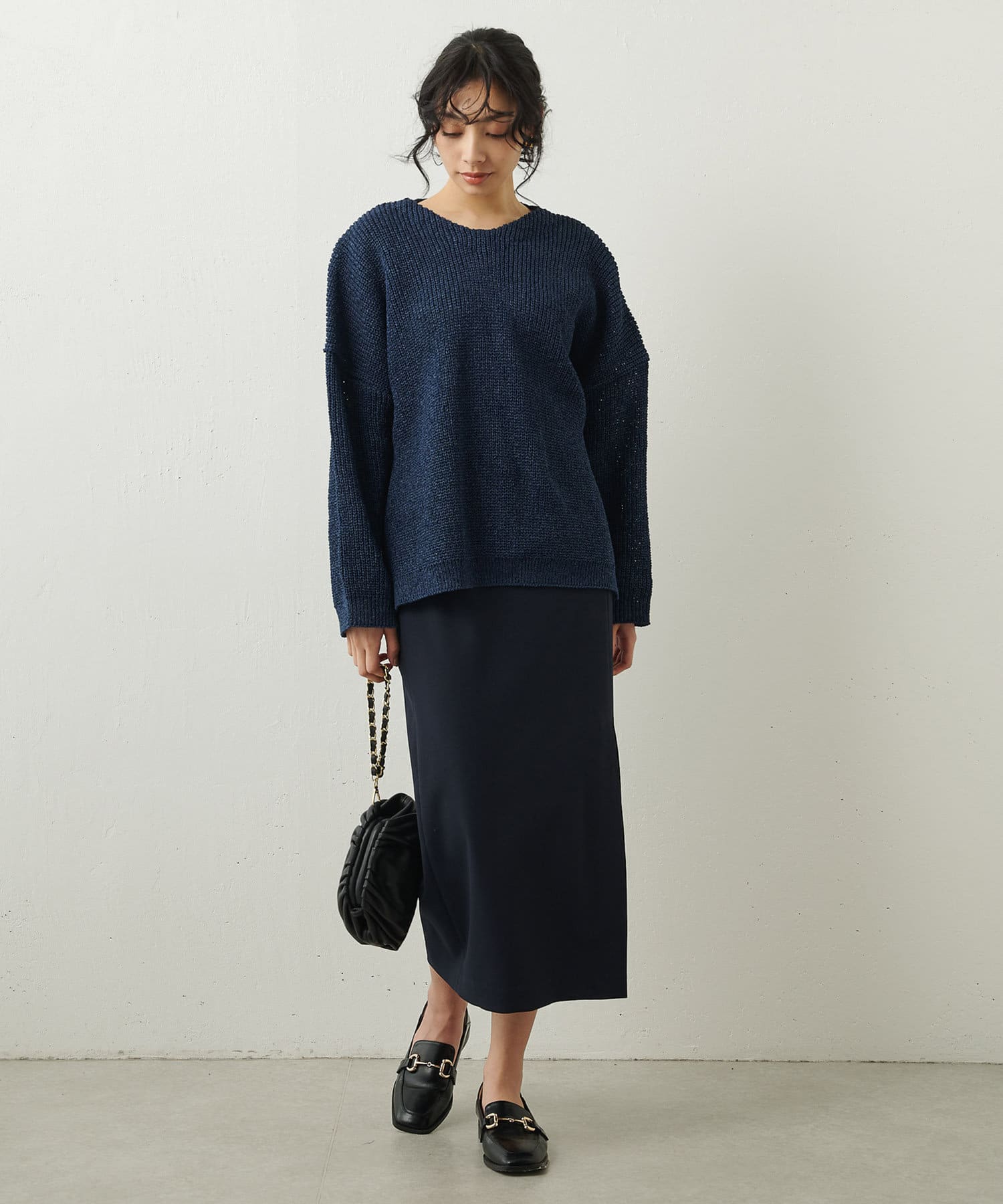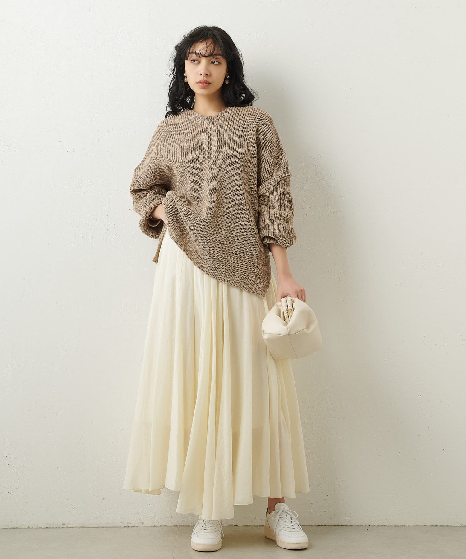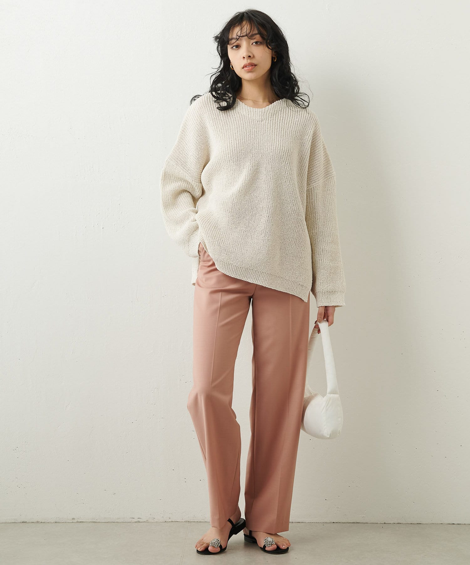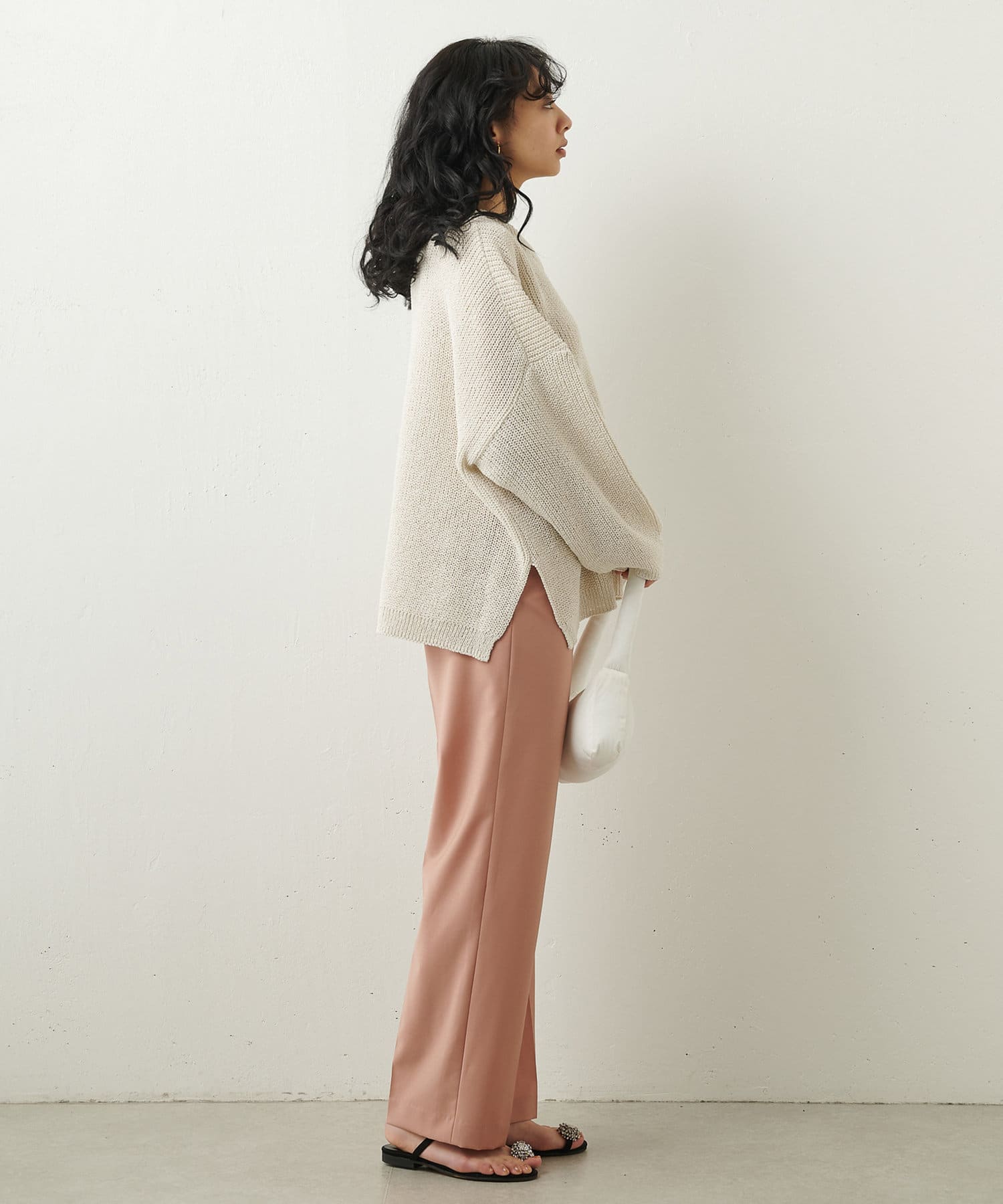 ■すっきりとしたパンツや細身のスカートに合わせてニットの緩さを引き立てるスタイリングもおすすめ。