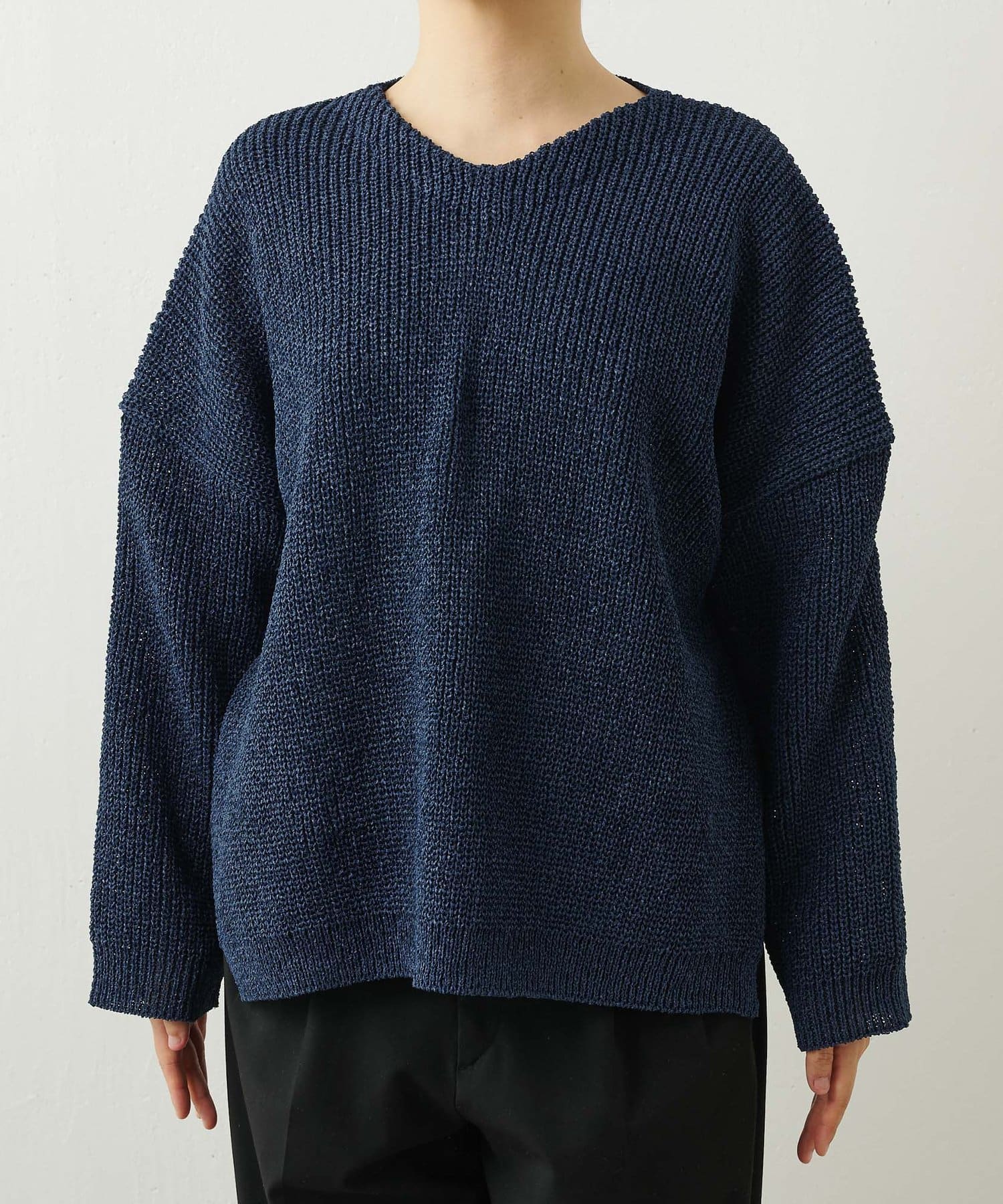 毎シーズン話題の和紙ニット。浅めのVネックがスッキリとした顔まわりにしてくれます。着るだけでサマになるシルエット。梅雨寒な季節まで着ることができます。ご自宅のお手入れも可能ですよ。
