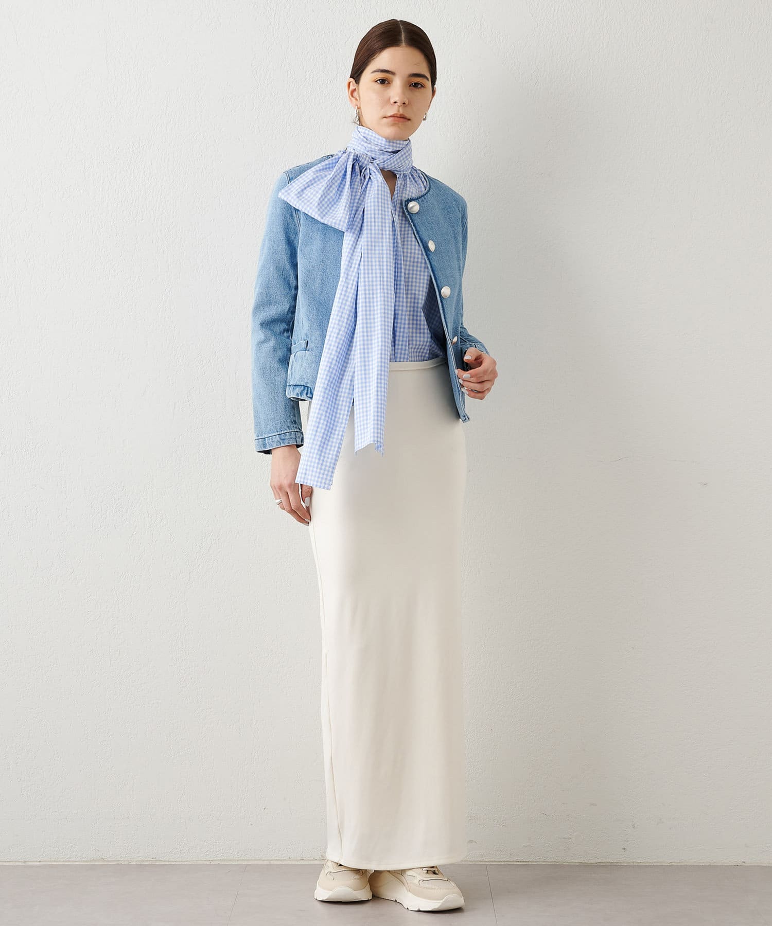 デニムジャケット、ライブで紹介された時から気にってました。タイトめかどうか気になってましたが、そこまでタイトすぎず、中にリブプルオーバーも入れても着れそうでした。お揃いのタイトスカートとセットで着たいです。