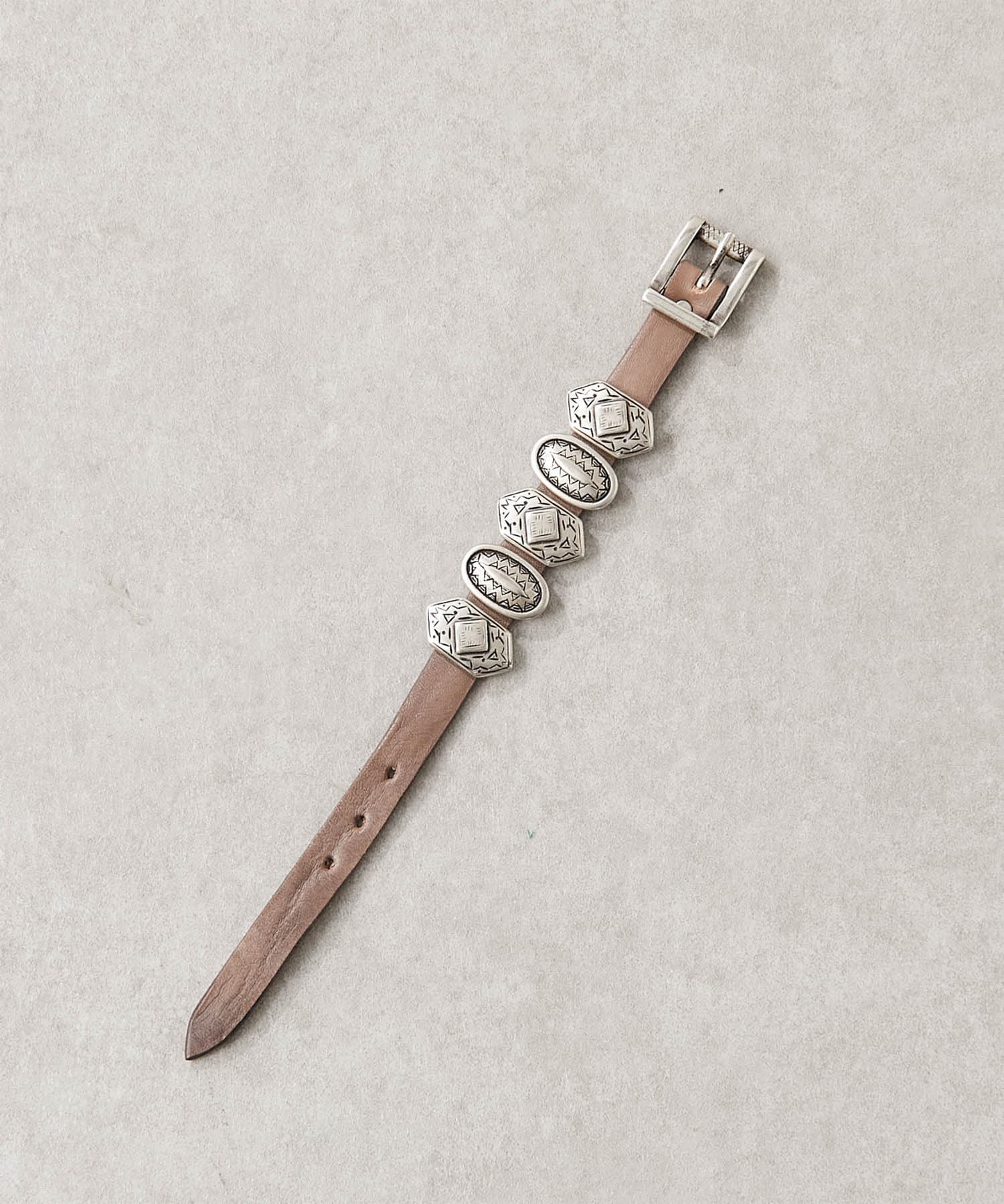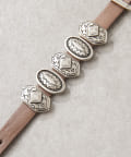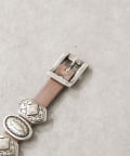 ■柔らかなレザー素材のベルトに、ニュアンスの異なる2種類のコンチョをあしらったデザイン。